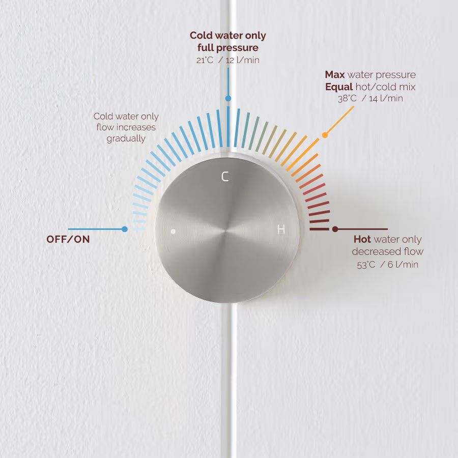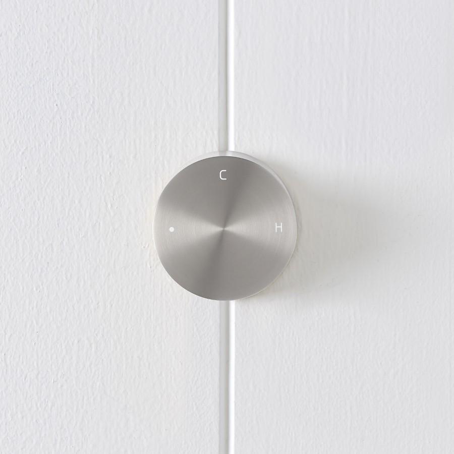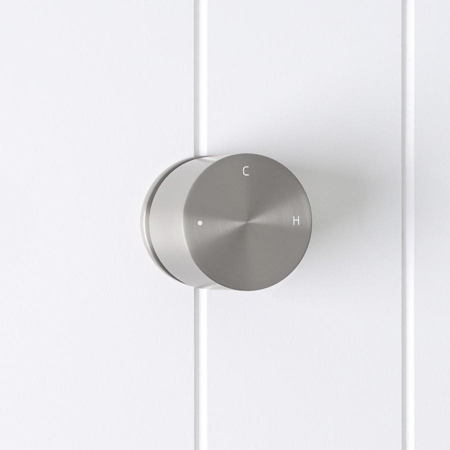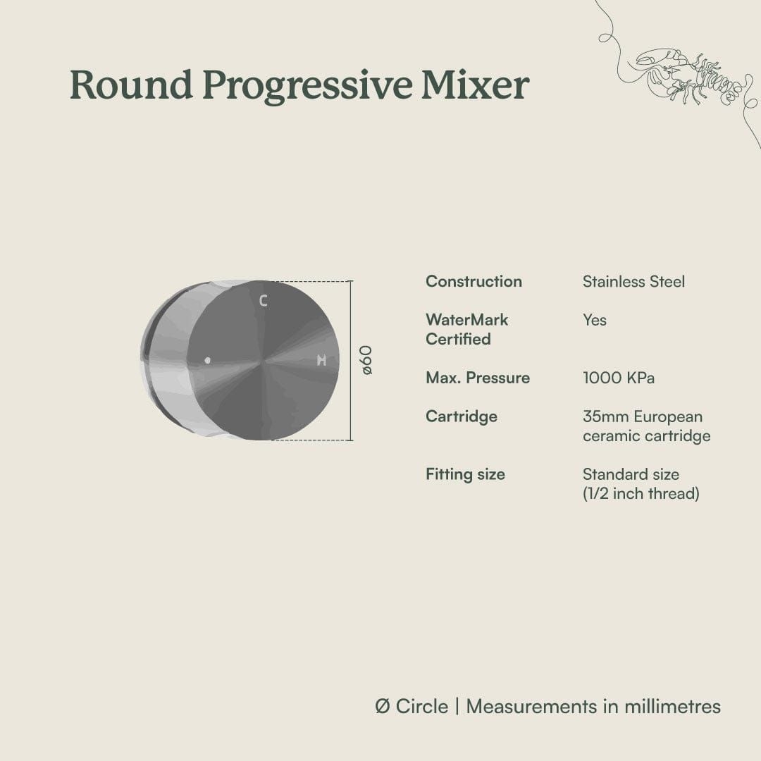 The Round Wall Progressive Mixer in Stainless Steel offers a clean, understated presence on the wall, ideal with concrete, terrazzo and pale stone. With one smooth dial, you control both pressure and warmth, from cool rinse to full, comforting spray. Durable and minimal for everyday use.