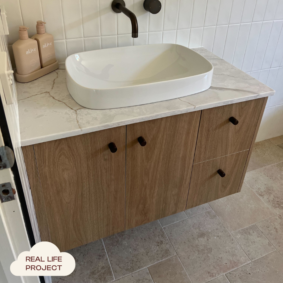 @alexmitrop has nailed this bathroom design using our Haddon Bone Matte Medium Square Tile and Seaforth French Pattern Travertine Look Beige Matte Tile. It’s a beautiful earthy bathroom with our @yabby.com.au Warm Brushed Nickel tapware to keep it fresh 🤍