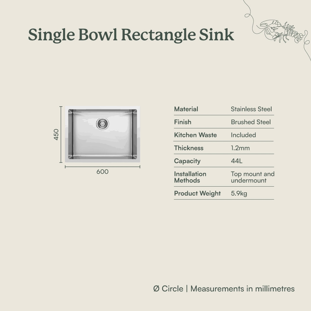 The Single Bowl Sink 600x450mm Stainless Steel brings a crisp, architectural look to modern kitchens and laundries. Its deep rectangular bowl easily takes baking trays and large pots, while the matte stainless steel pairs beautifully with stone and timber benches. A generous handmade sink that keeps prep and clean up feeling calm and ordered.