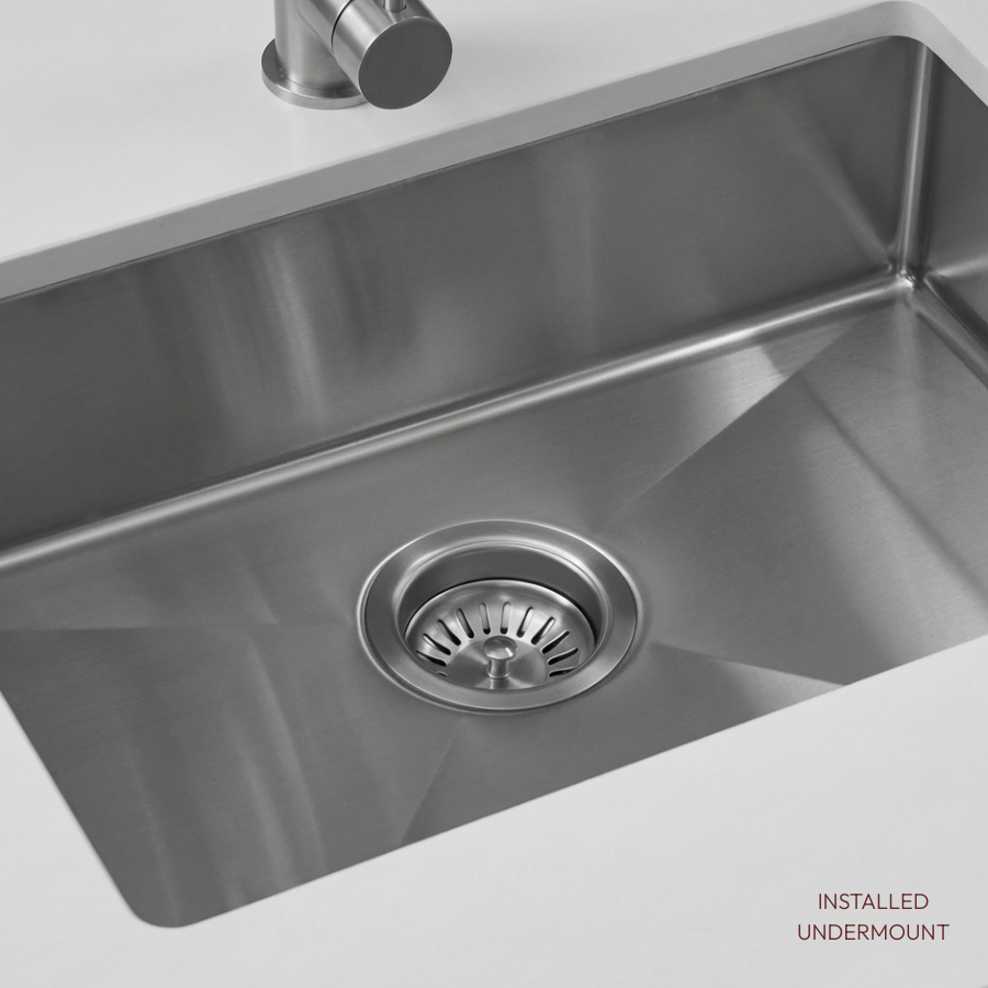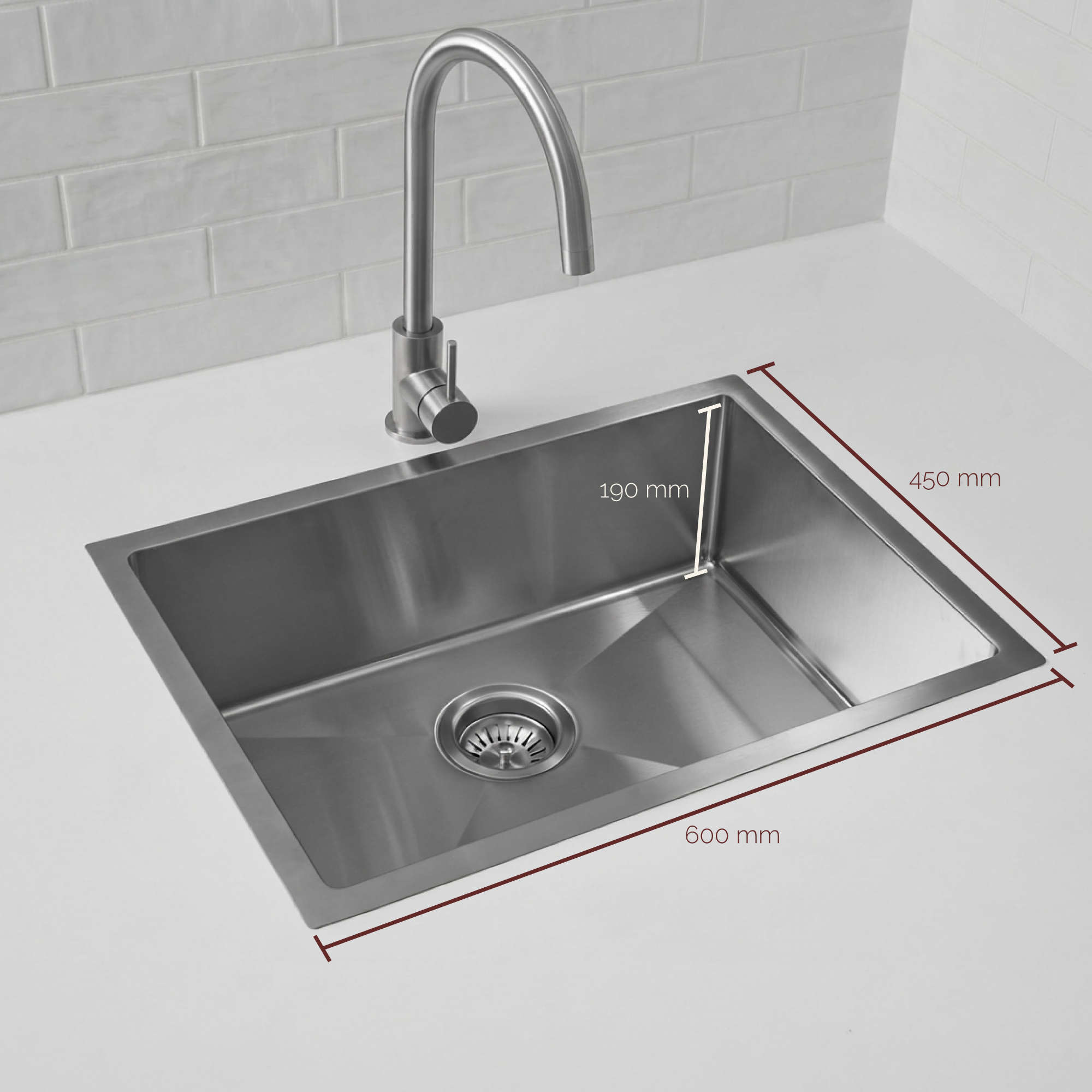 The Single Bowl Sink 600x450mm Stainless Steel brings a crisp, architectural look to modern kitchens and laundries. Its deep rectangular bowl easily takes baking trays and large pots, while the matte stainless steel pairs beautifully with stone and timber benches. A generous handmade sink that keeps prep and clean up feeling calm and ordered.