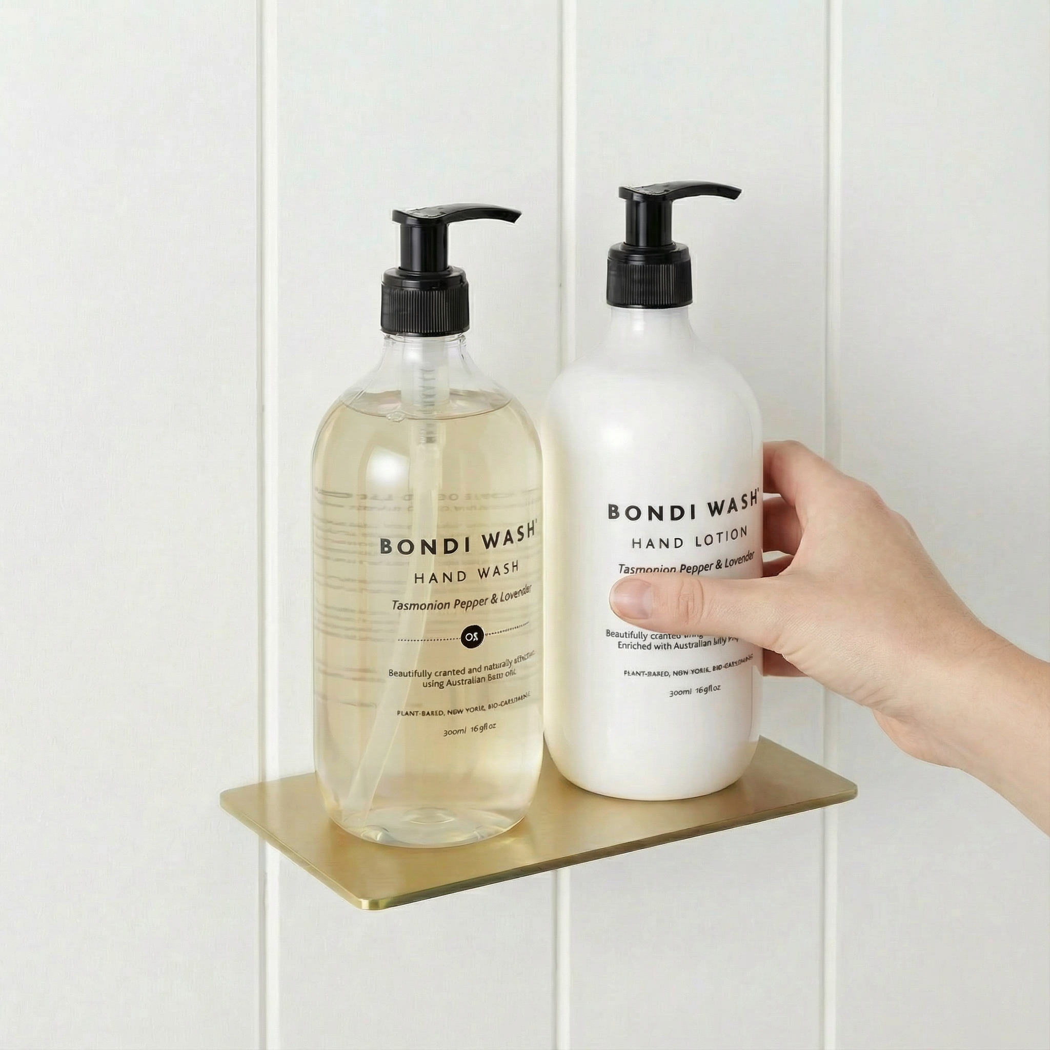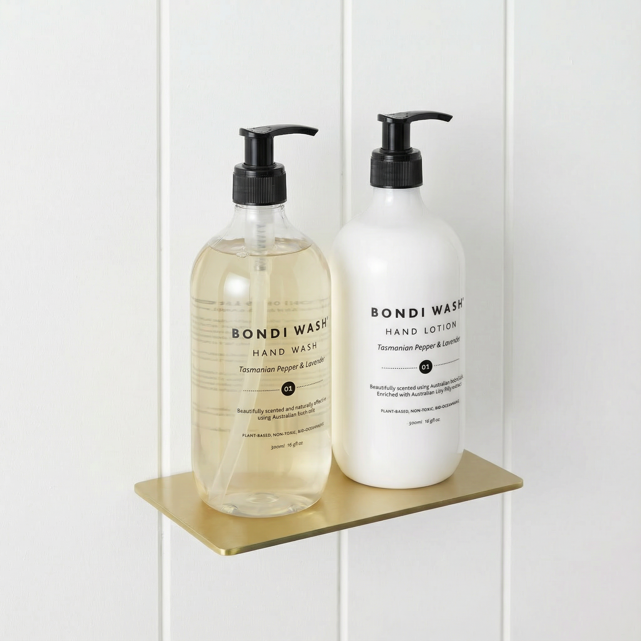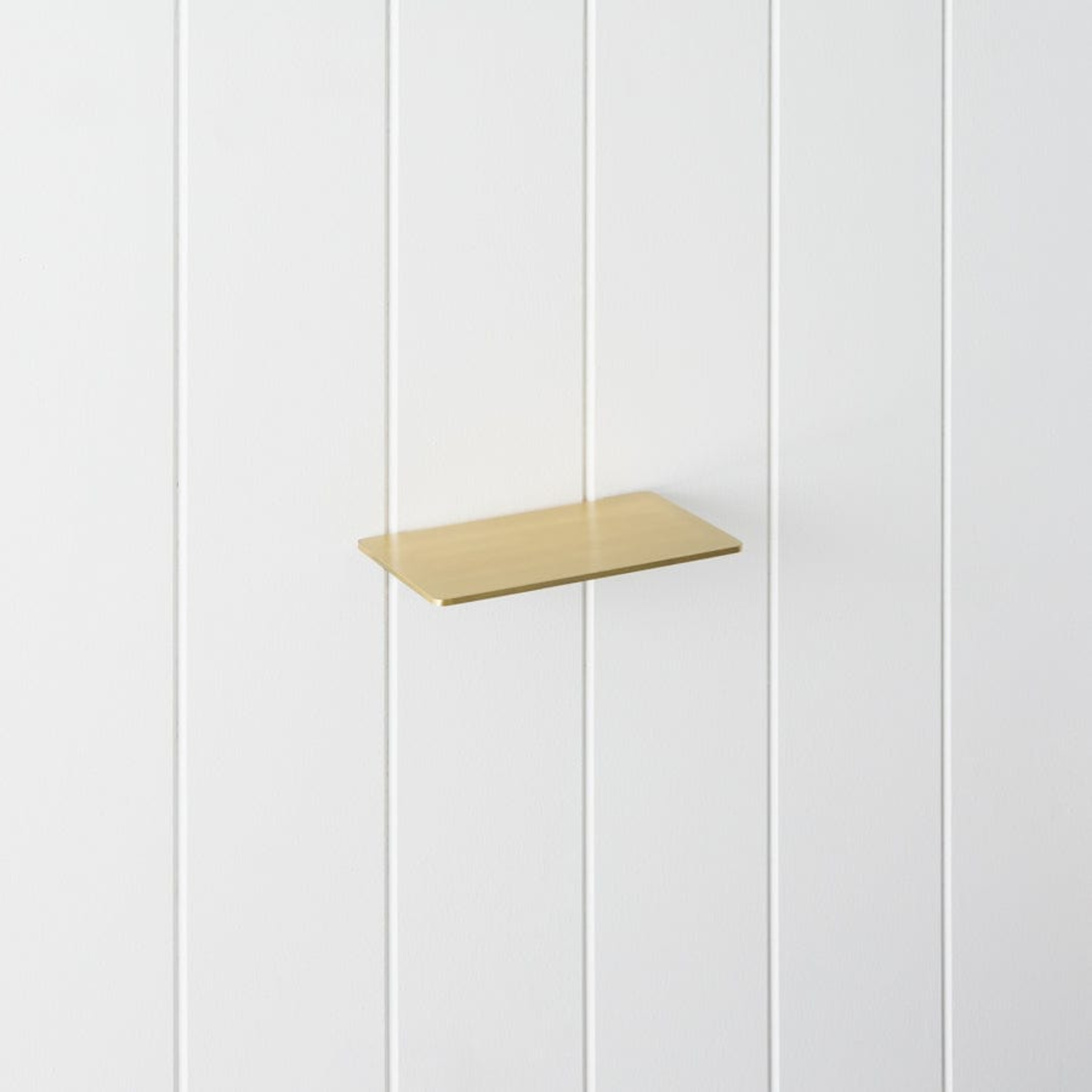 The Small Shower Shelf in Brushed Brass brings a soft glow to the shower while offering a discreet landing spot for daily products. The fine stainless steel plate with brushed brass finish keeps the wall line minimal and refined. Perfect for layering with matching brass tapware.
