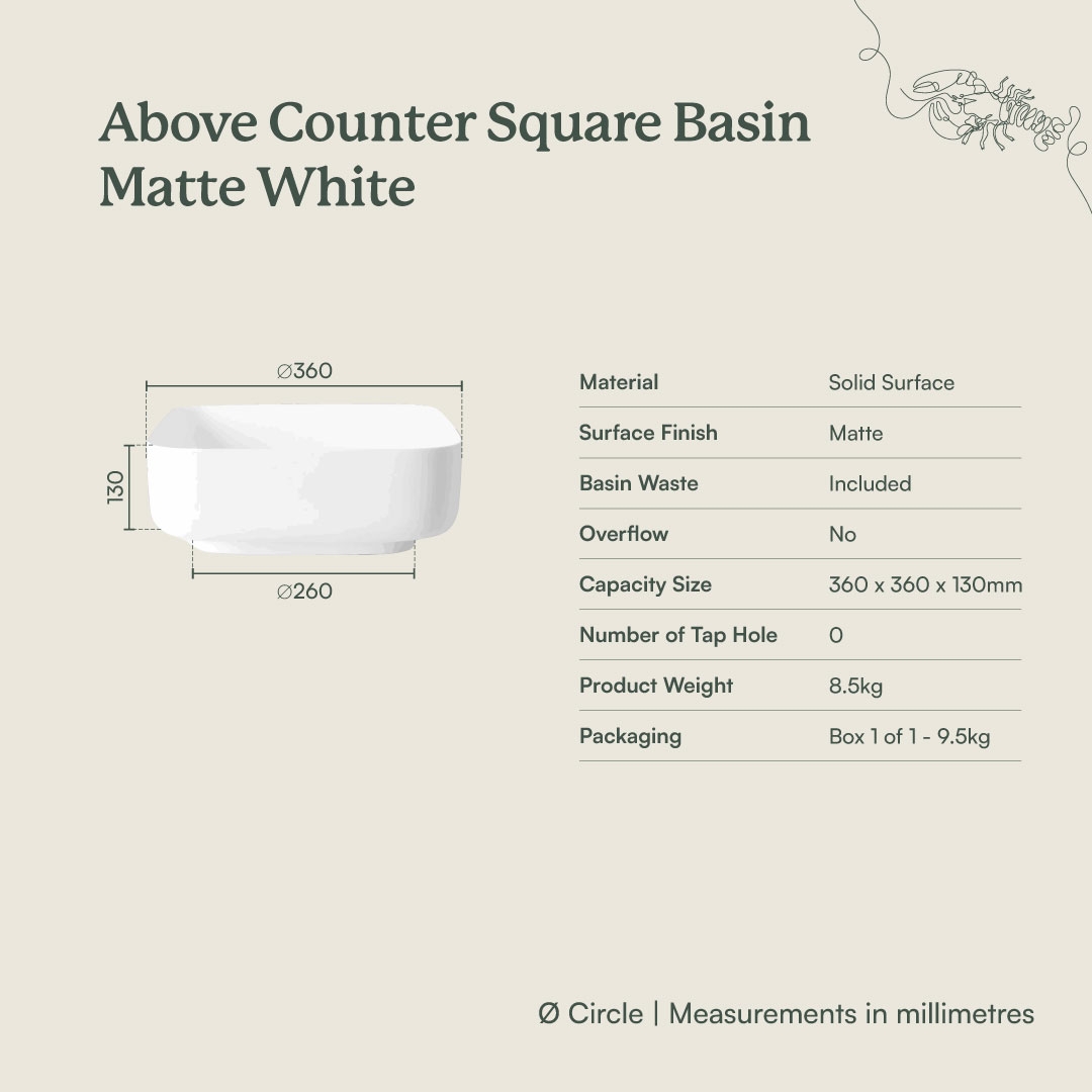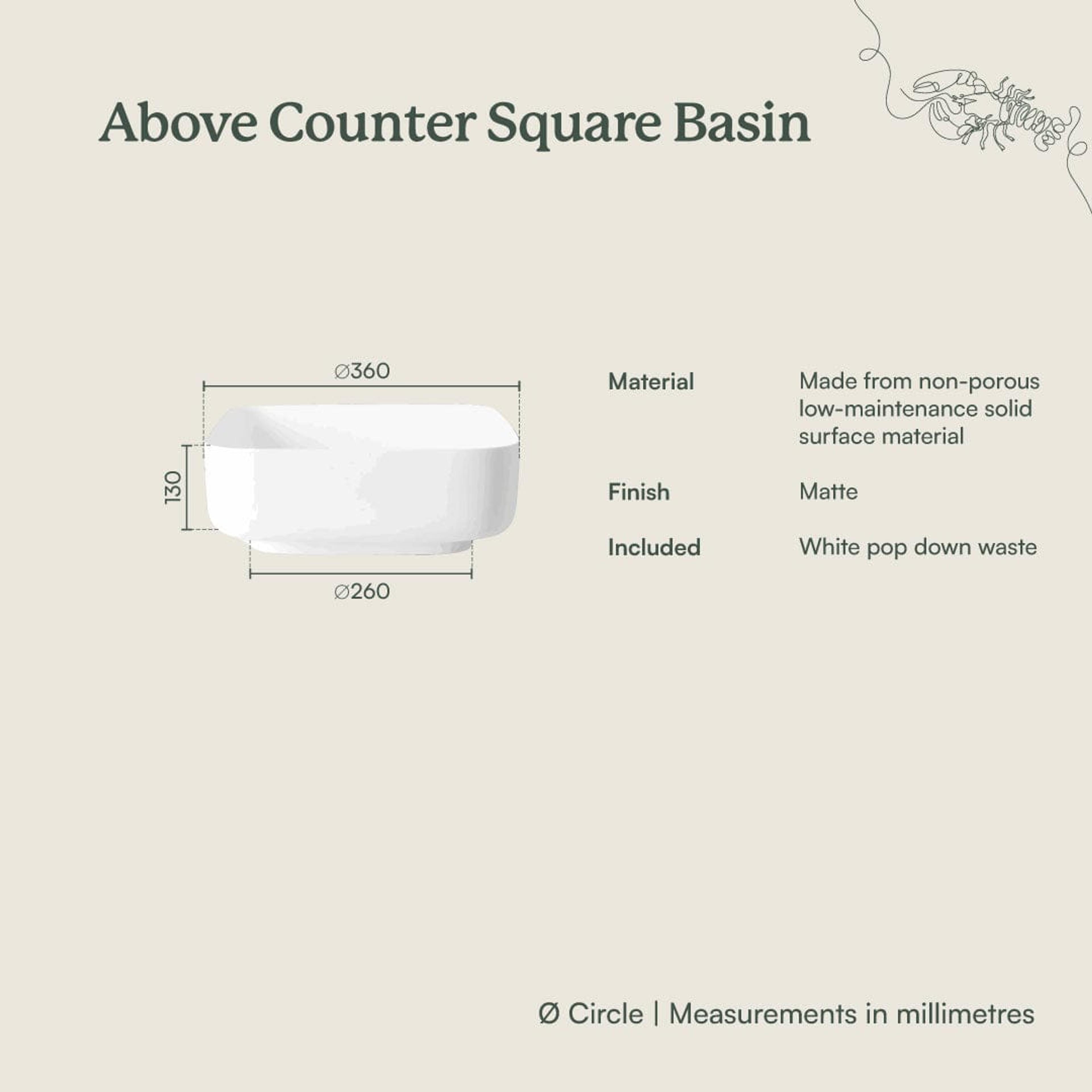 The Above Counter Square Basin in Matte White brings a structured yet soft presence to the vanity. Its rounded corners, slim square form and non porous solid surface finish pair easily with stone, timber and brass or black tapware. By offering the height of an above counter basin with generous depth, it reduces splashing and gives small bathrooms a calm, organised feel.