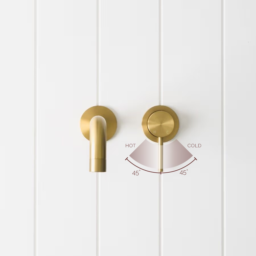 The Sydney Wall Spout and Wall Mixer in Brushed Brass adds gentle glow and a clean curve to the wall. The brushed finish over stainless steel pairs beautifully with warm tiles and timber. With the mixer set close by, water control feels effortless and the vanity stays visually light.