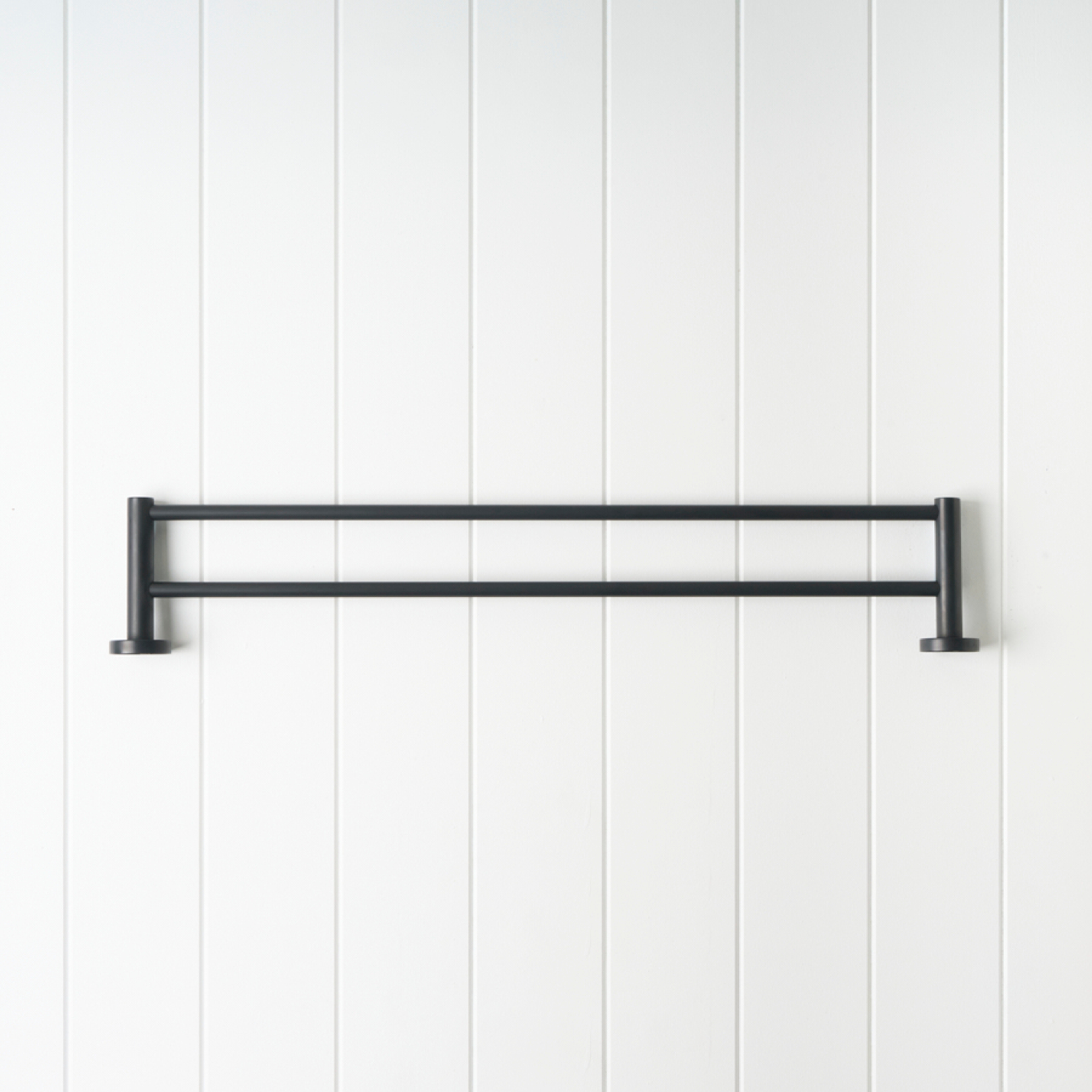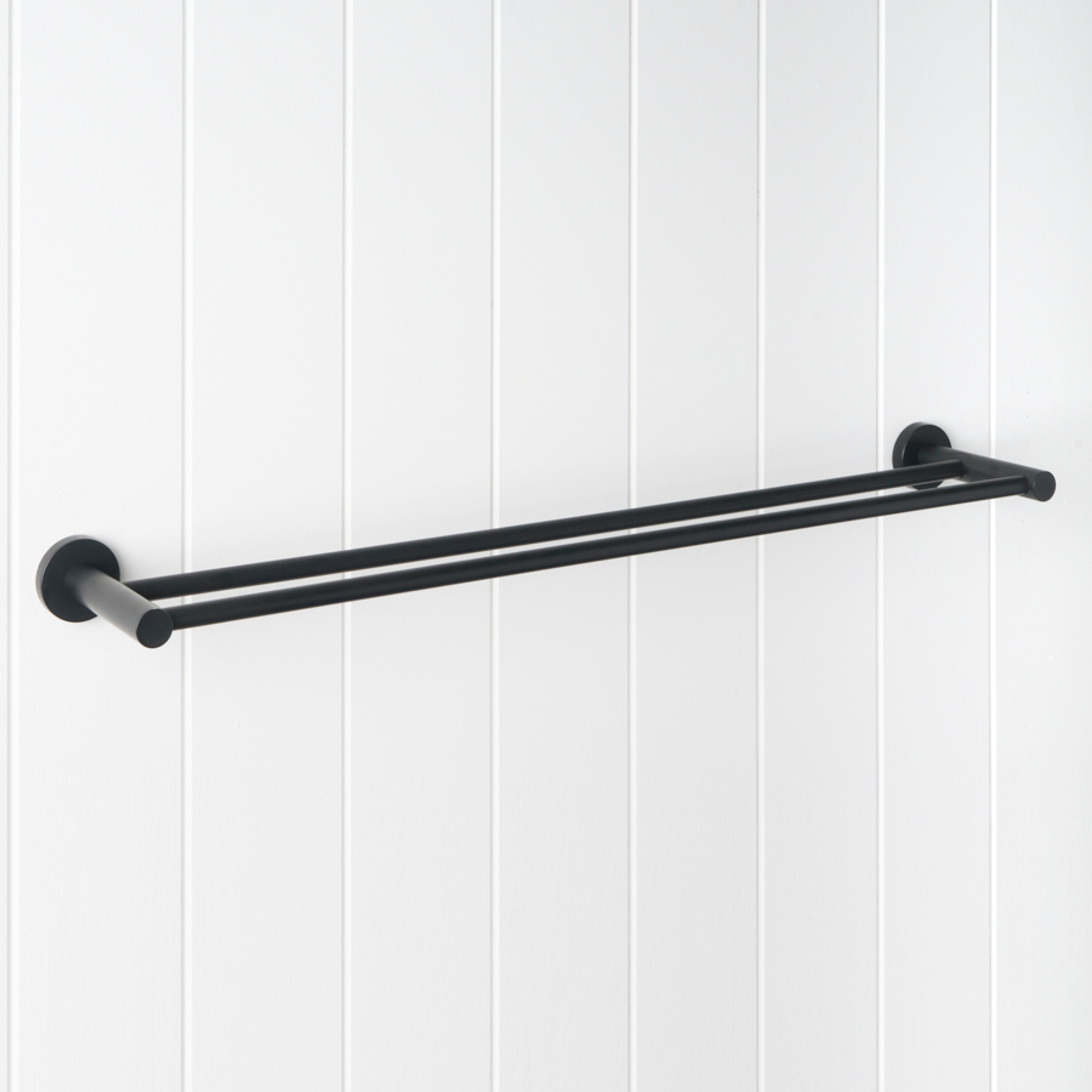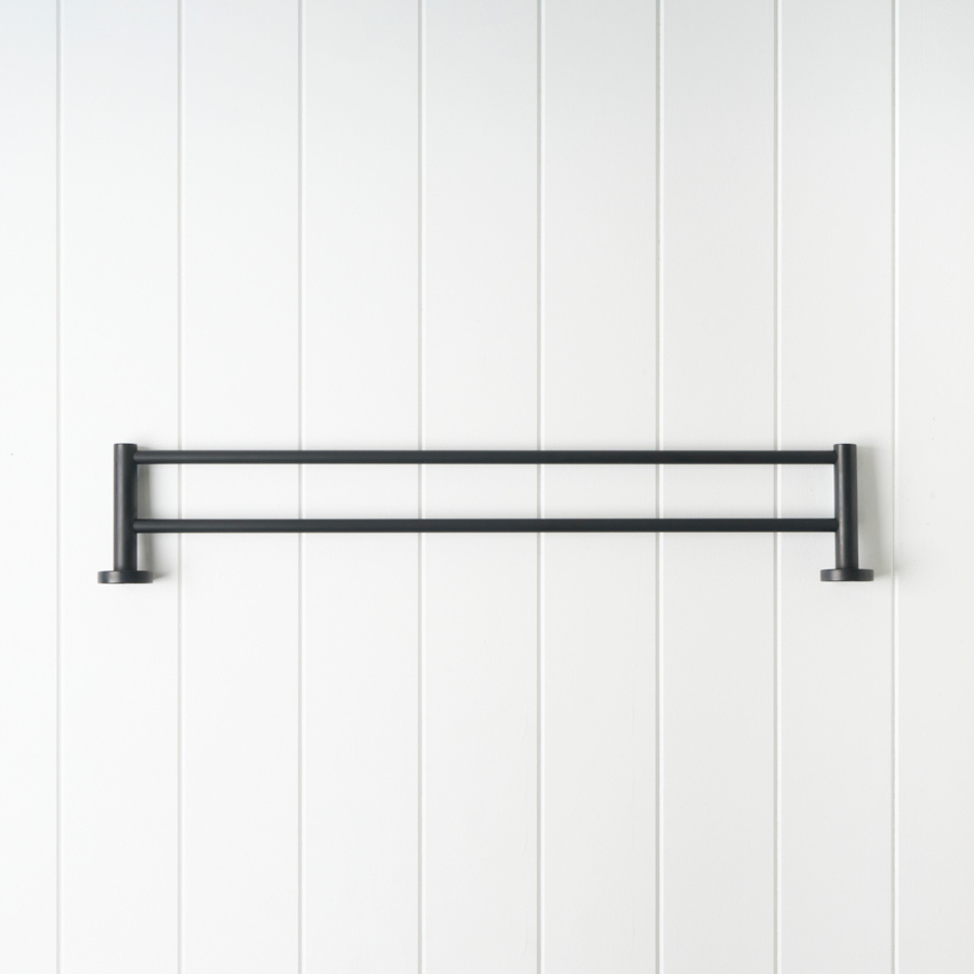 The Sydney Double Towel Rail in Matte Black (600mm) draws a confident black line across white panelled walls, echoing modern black tapware. Slim stainless steel bars keep towels streamlined, giving the room a crisp, graphic edge.