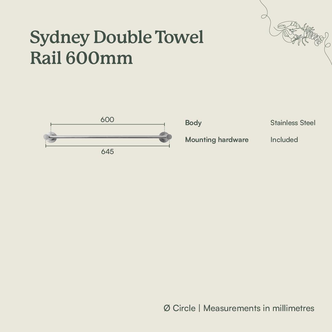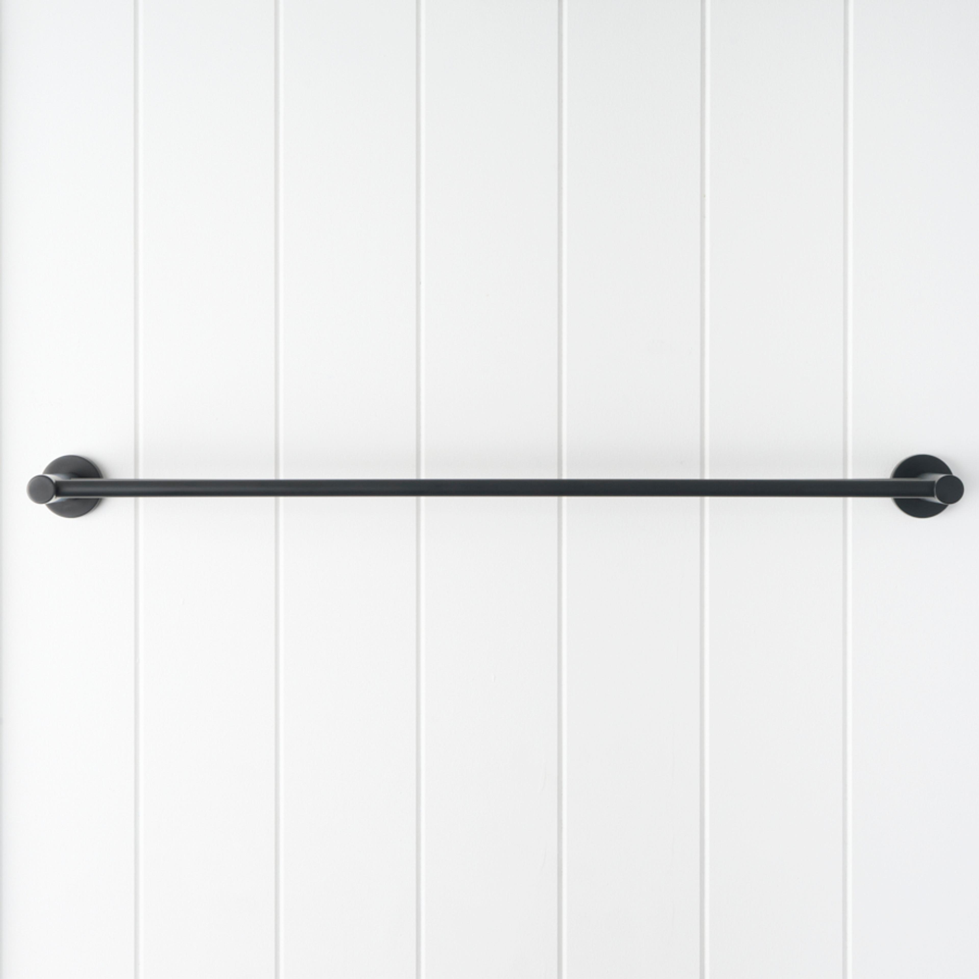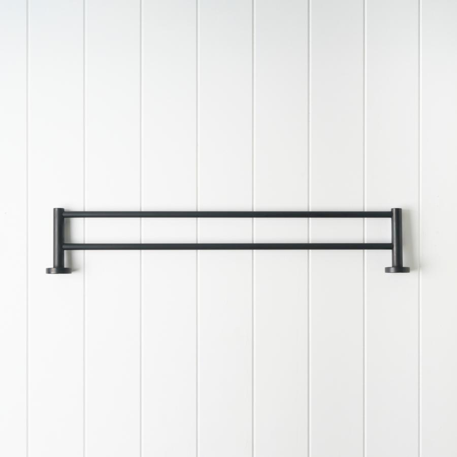 The Sydney Double Towel Rail in Matte Black (600mm) draws a confident black line across white panelled walls, echoing modern black tapware. Slim stainless steel bars keep towels streamlined, giving the room a crisp, graphic edge.