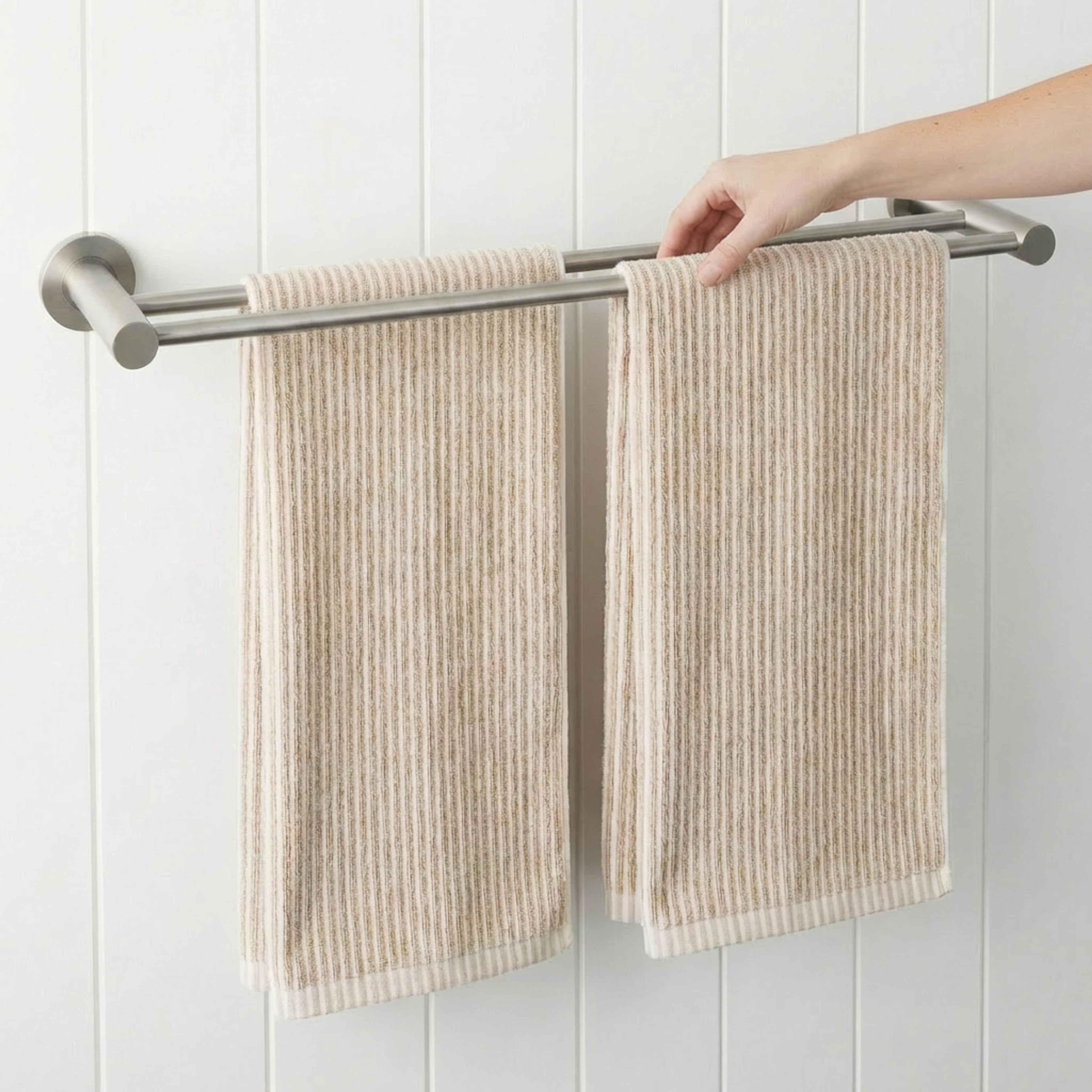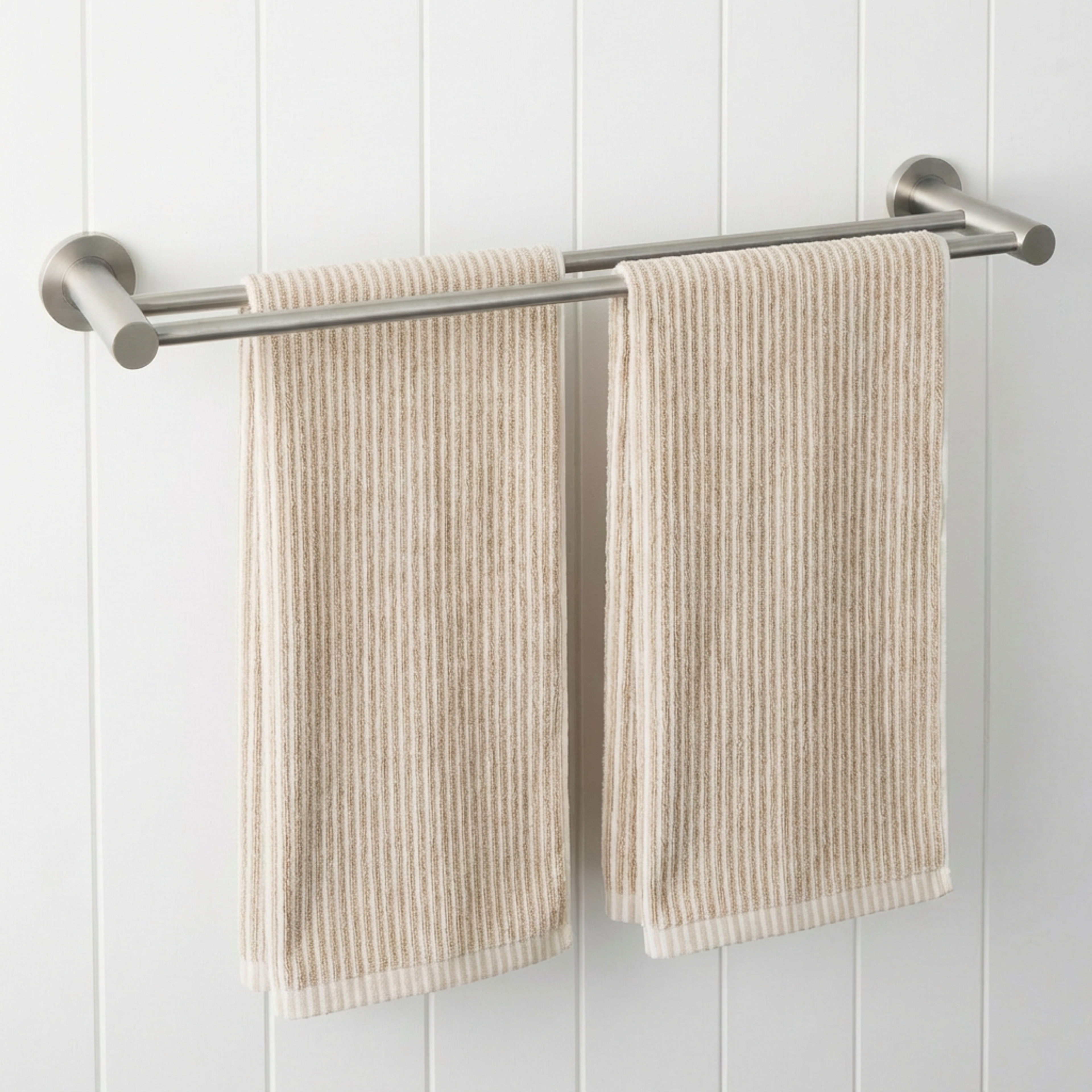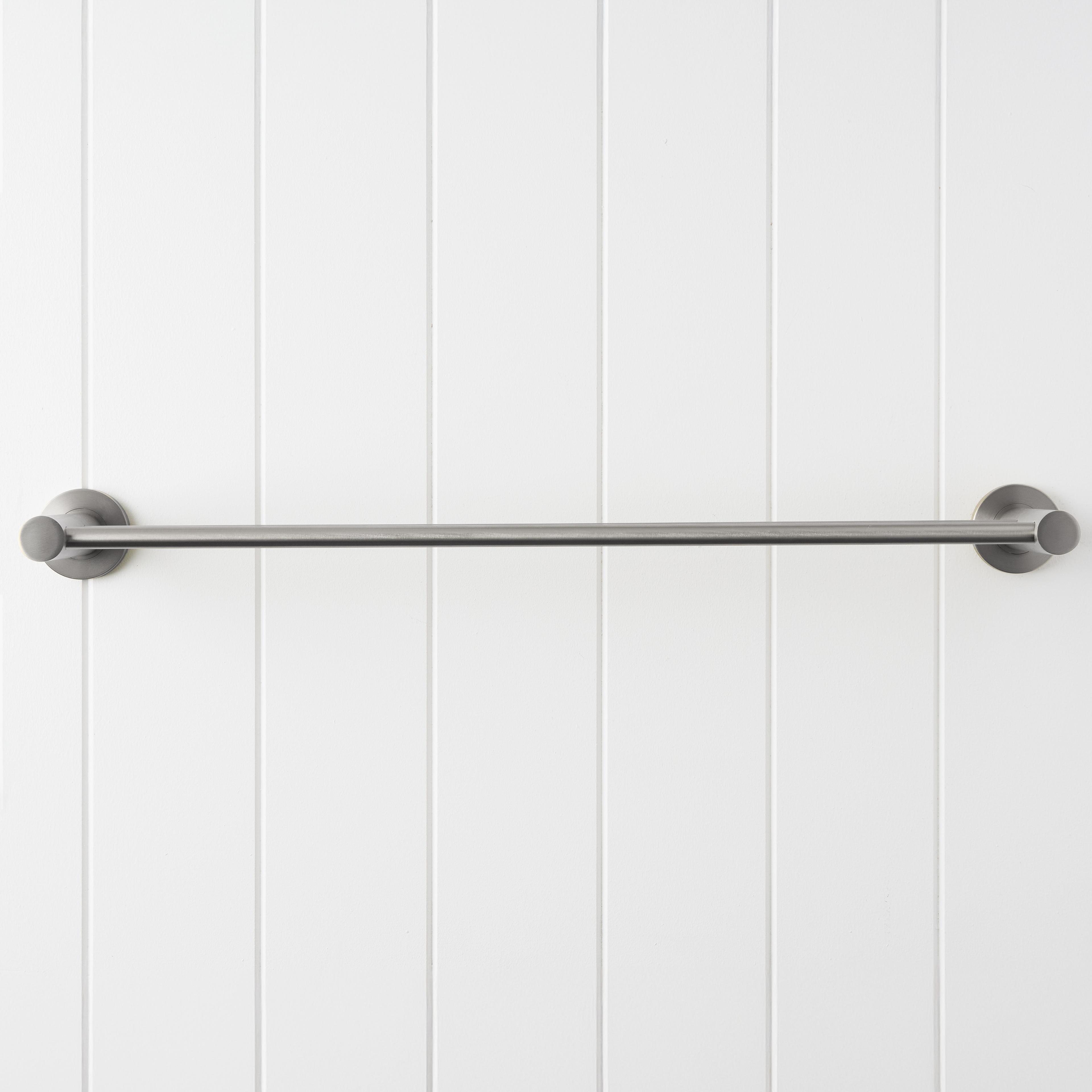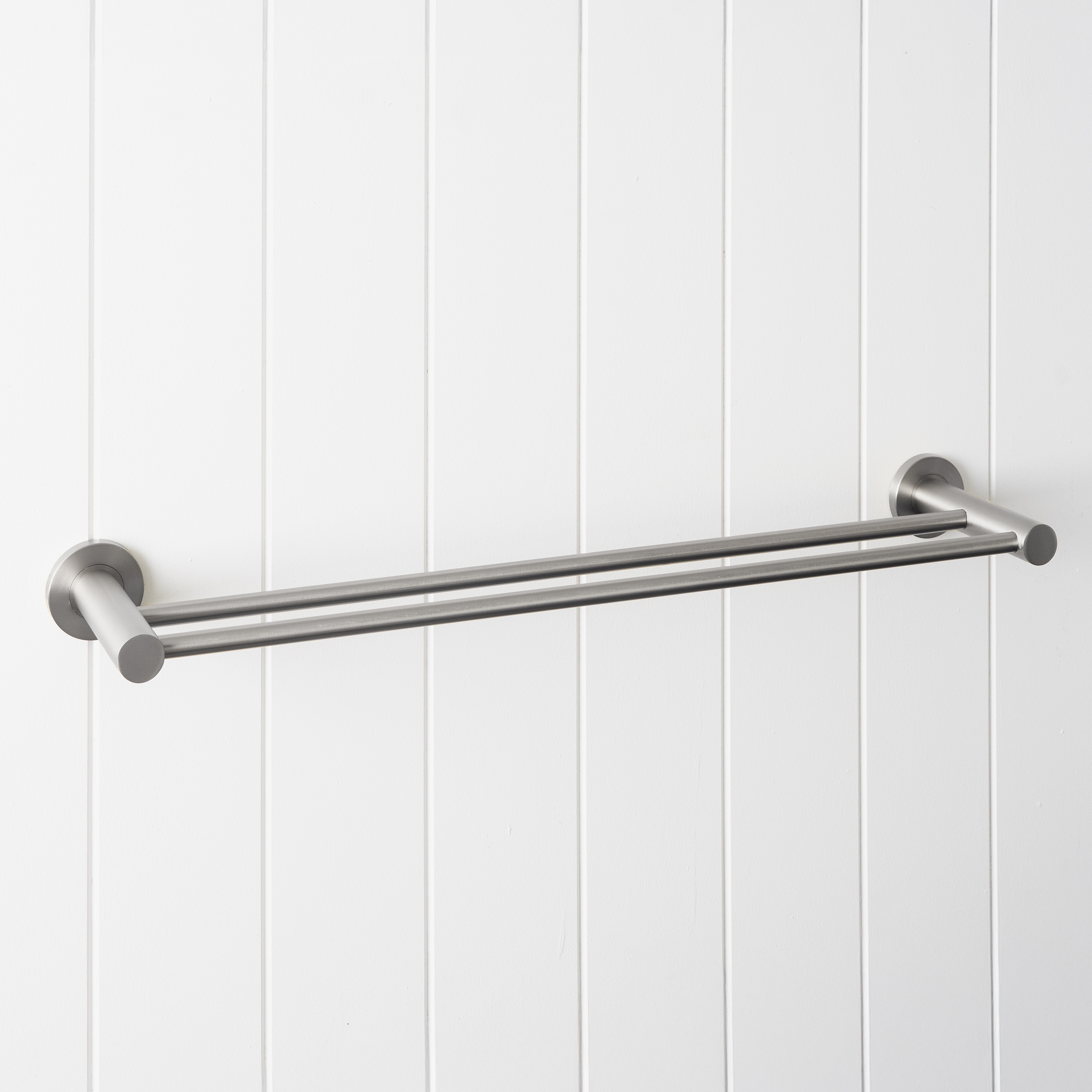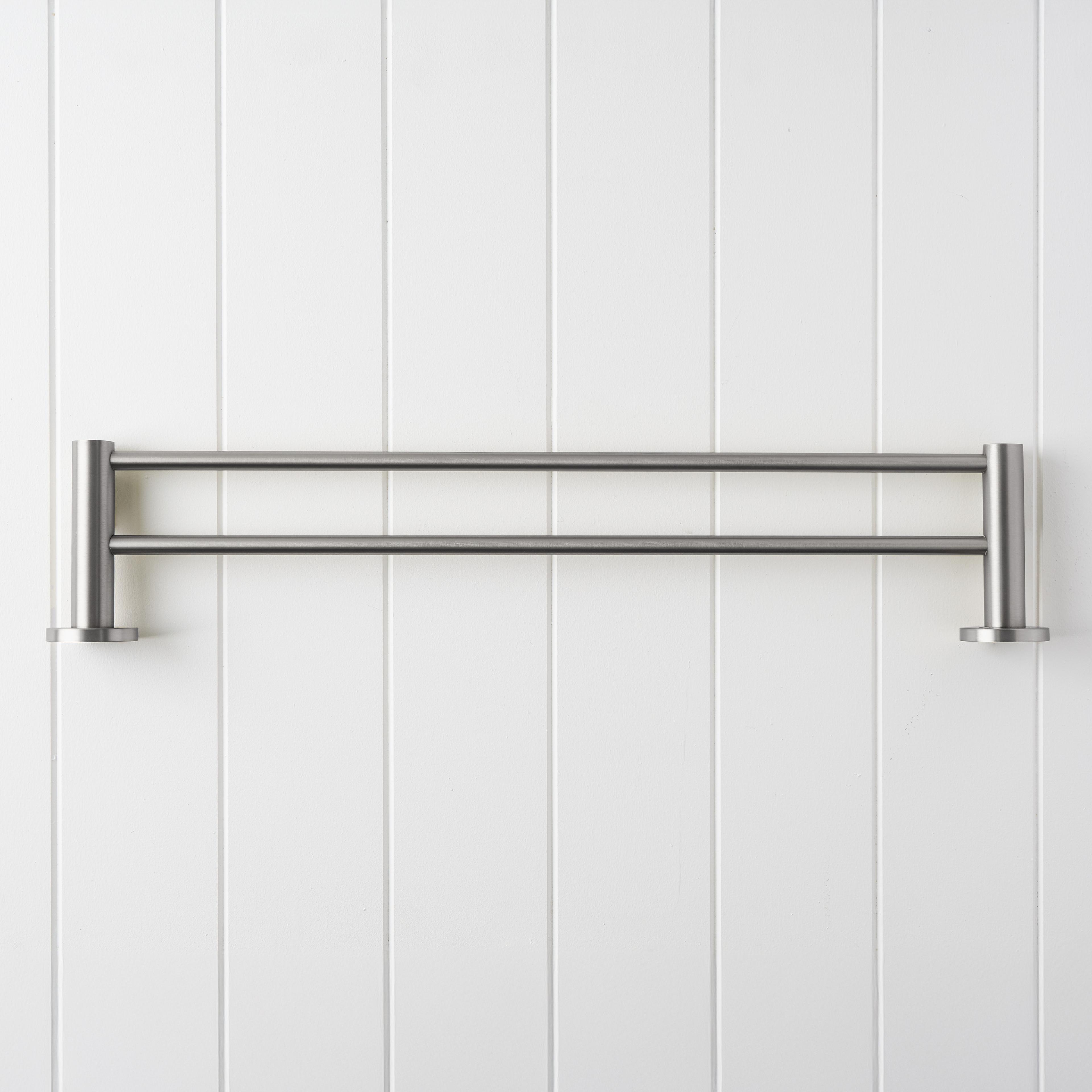 The Sydney Double Towel Rail in Stainless Steel (600mm) brings a clean, linear detail to modern bathrooms. Two slim bars extend from rounded wall plates, allowing towels to hang neatly with space to dry. A simple way to complement stainless steel tapware while keeping your bathroom organised and uncluttered.
