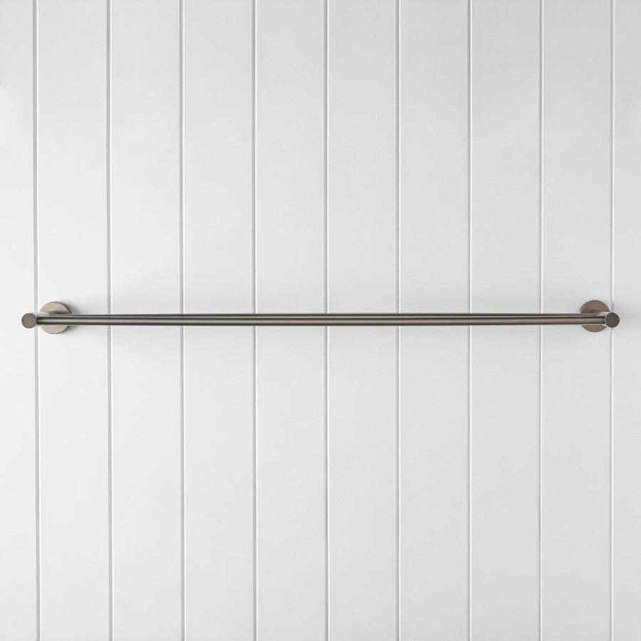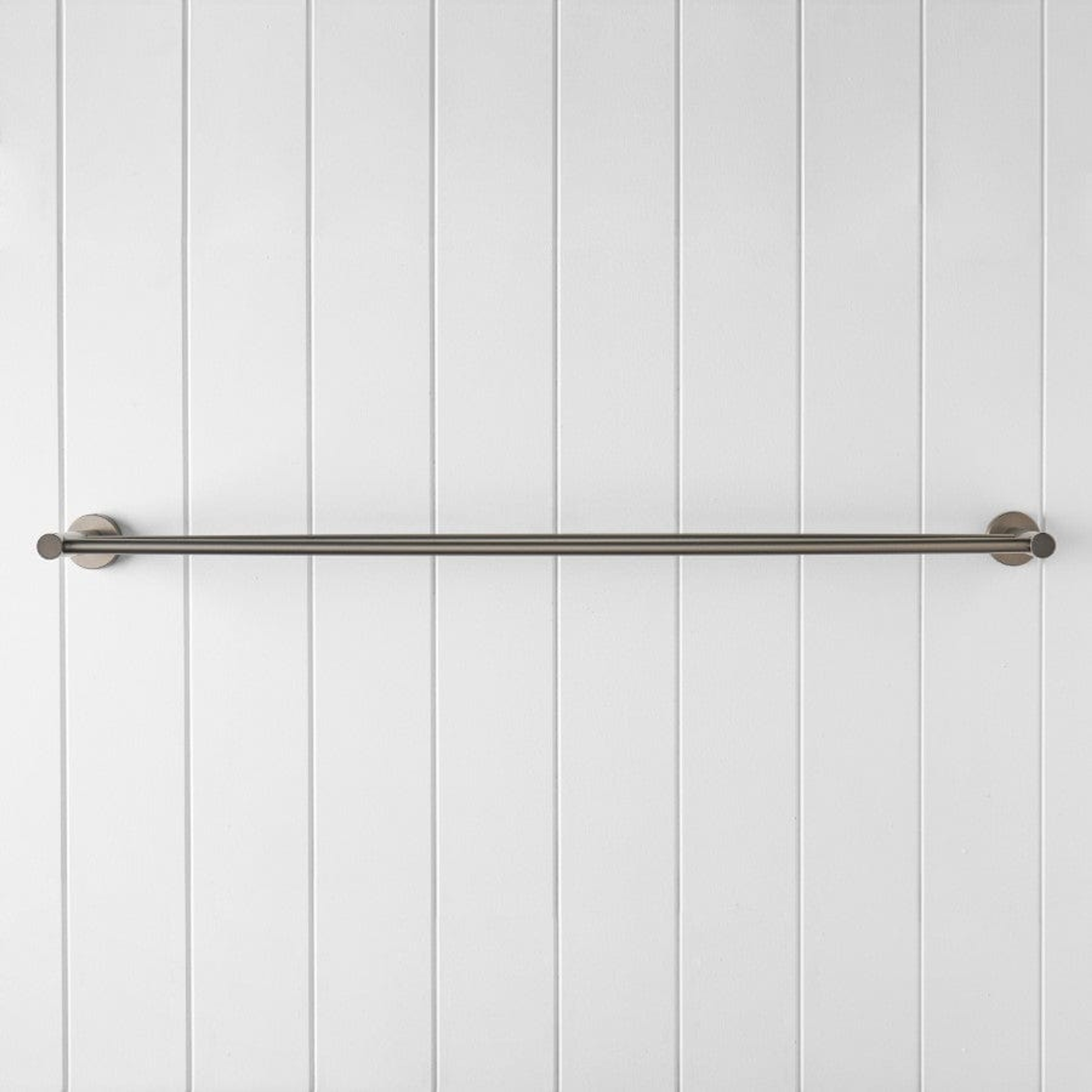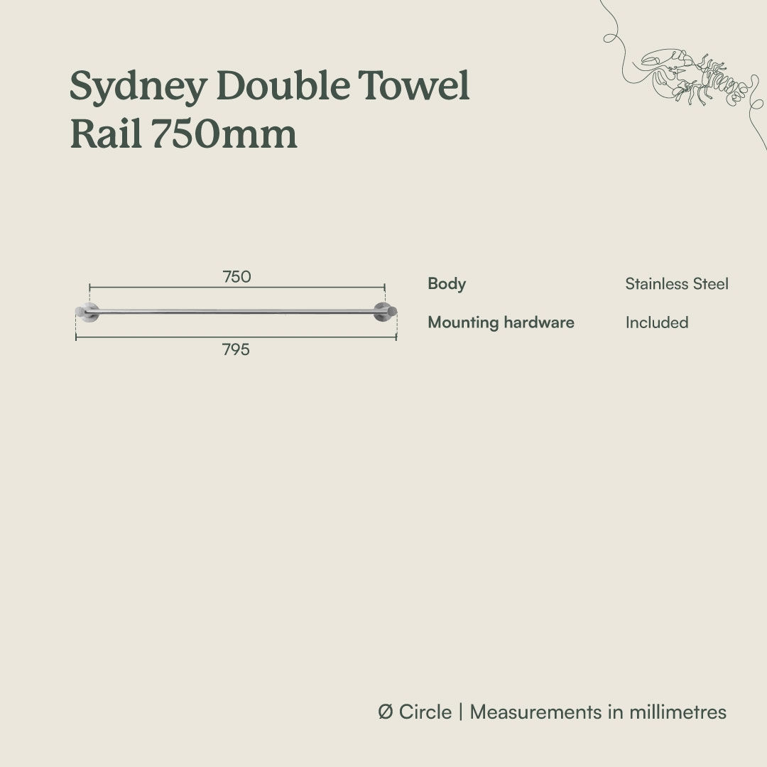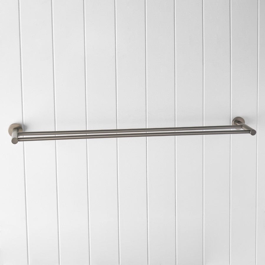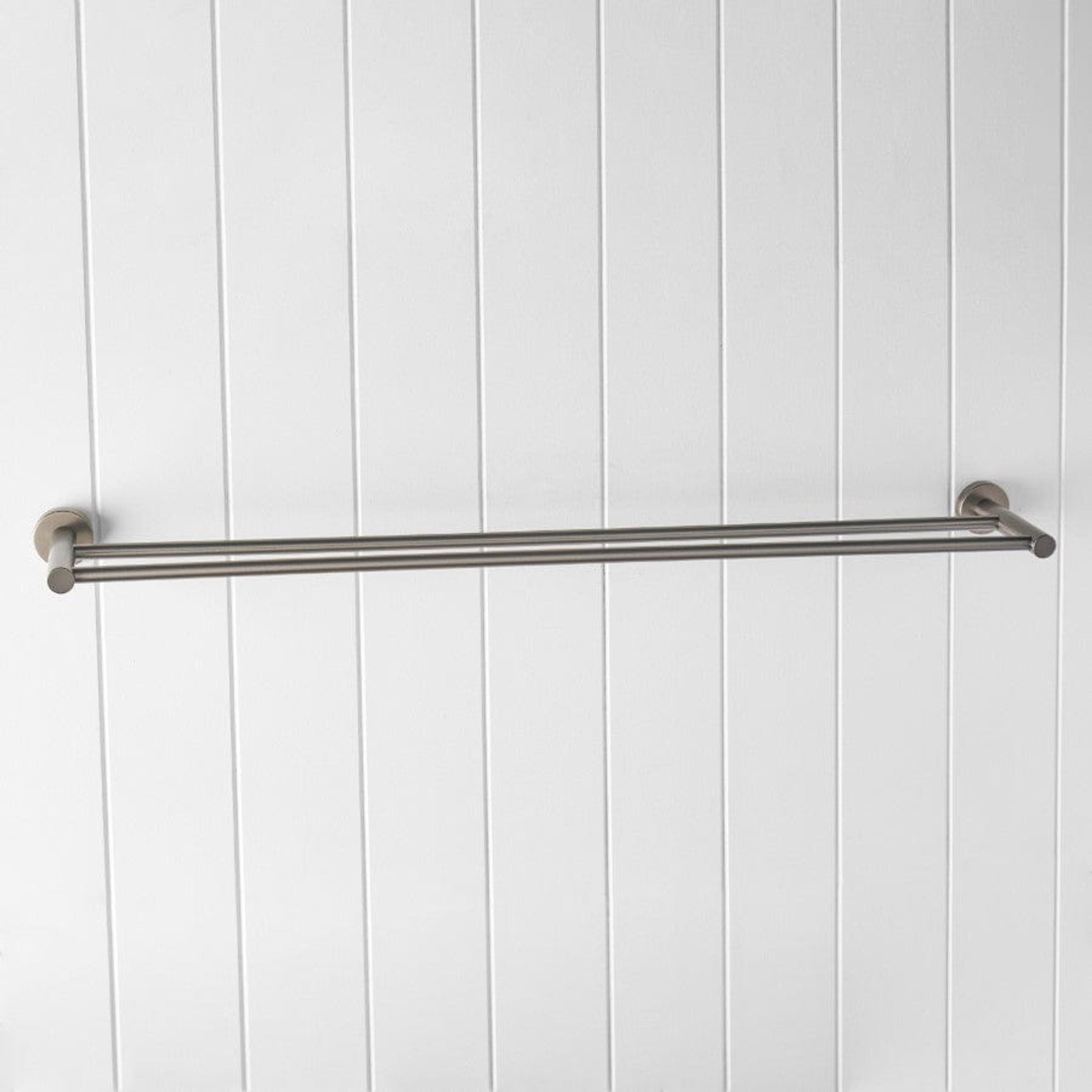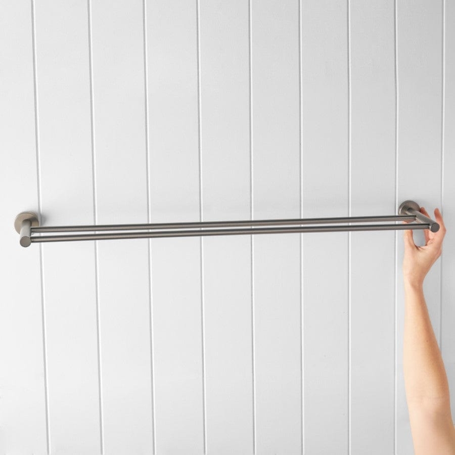 The Sydney Double Towel Rail in Gunmetal (750mm) adds a slim charcoal accent that grounds pale tiles and stone. Parallel stainless steel bars give generous space for bath sheets, keeping the room feeling calm rather than cluttered. A contemporary gunmetal double towel rail that completes darker tapware stories.