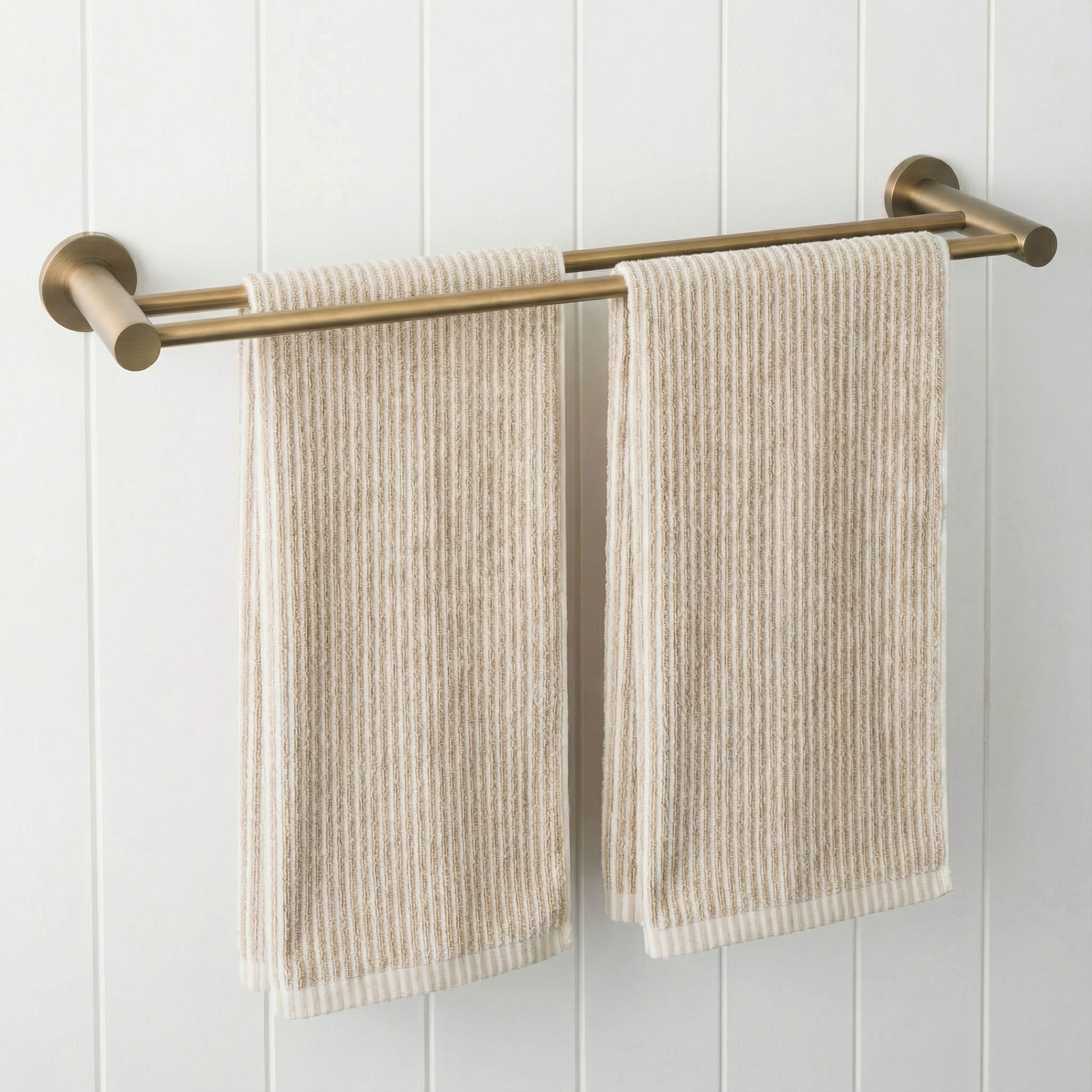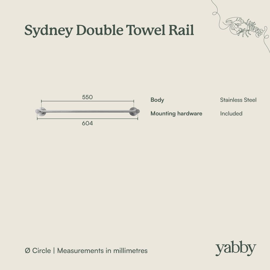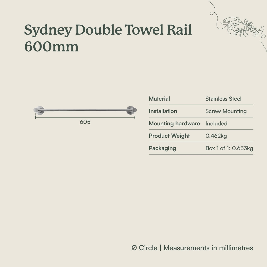 The Sydney Double Towel Rail in Antique Brass (600mm) adds a warm linear detail against crisp tiles or panelling. Two slim stainless steel bars project gently from rounded wall plates, giving towels room to breathe. A simple way to echo antique brass tapware and keep the bathroom feeling calm and ordered.
