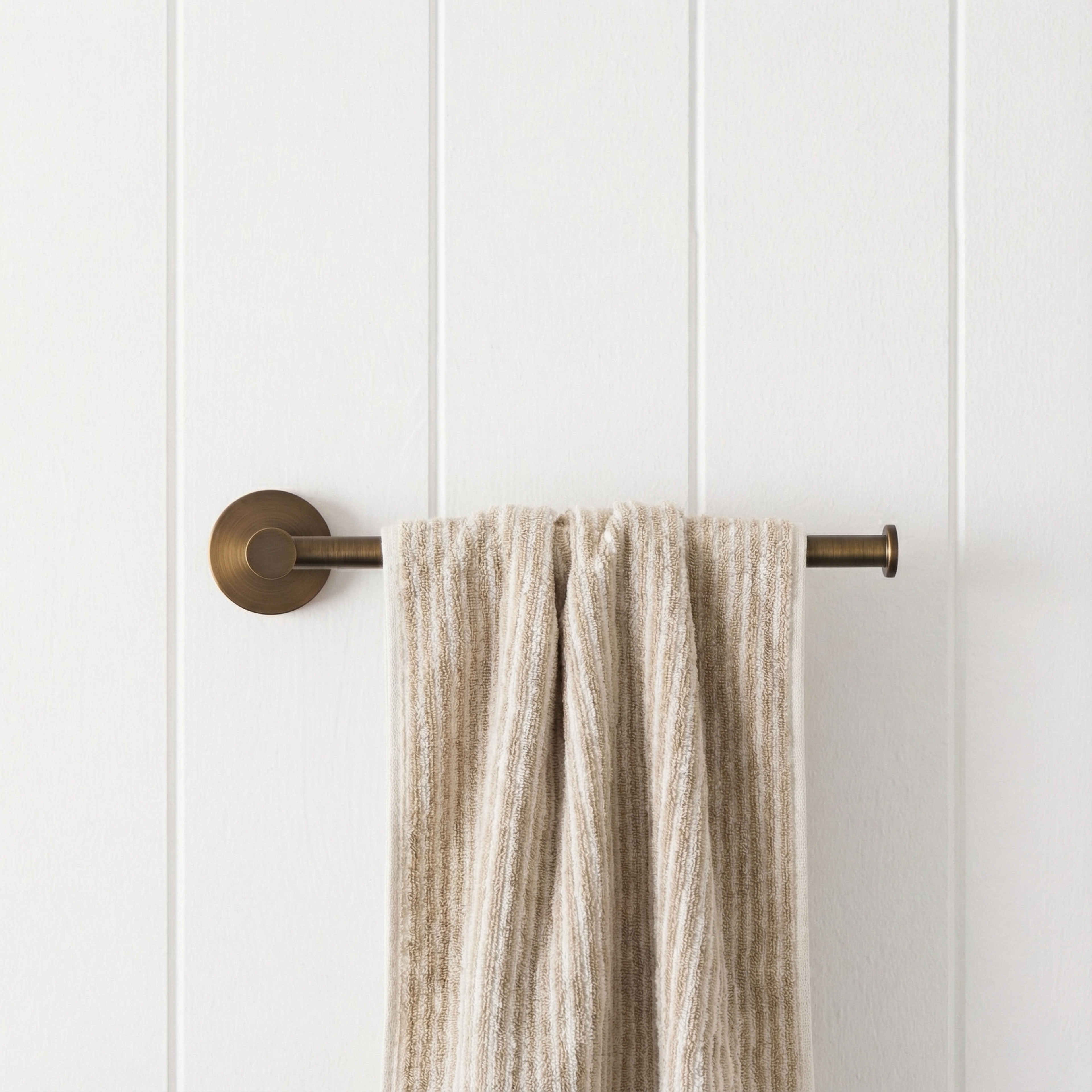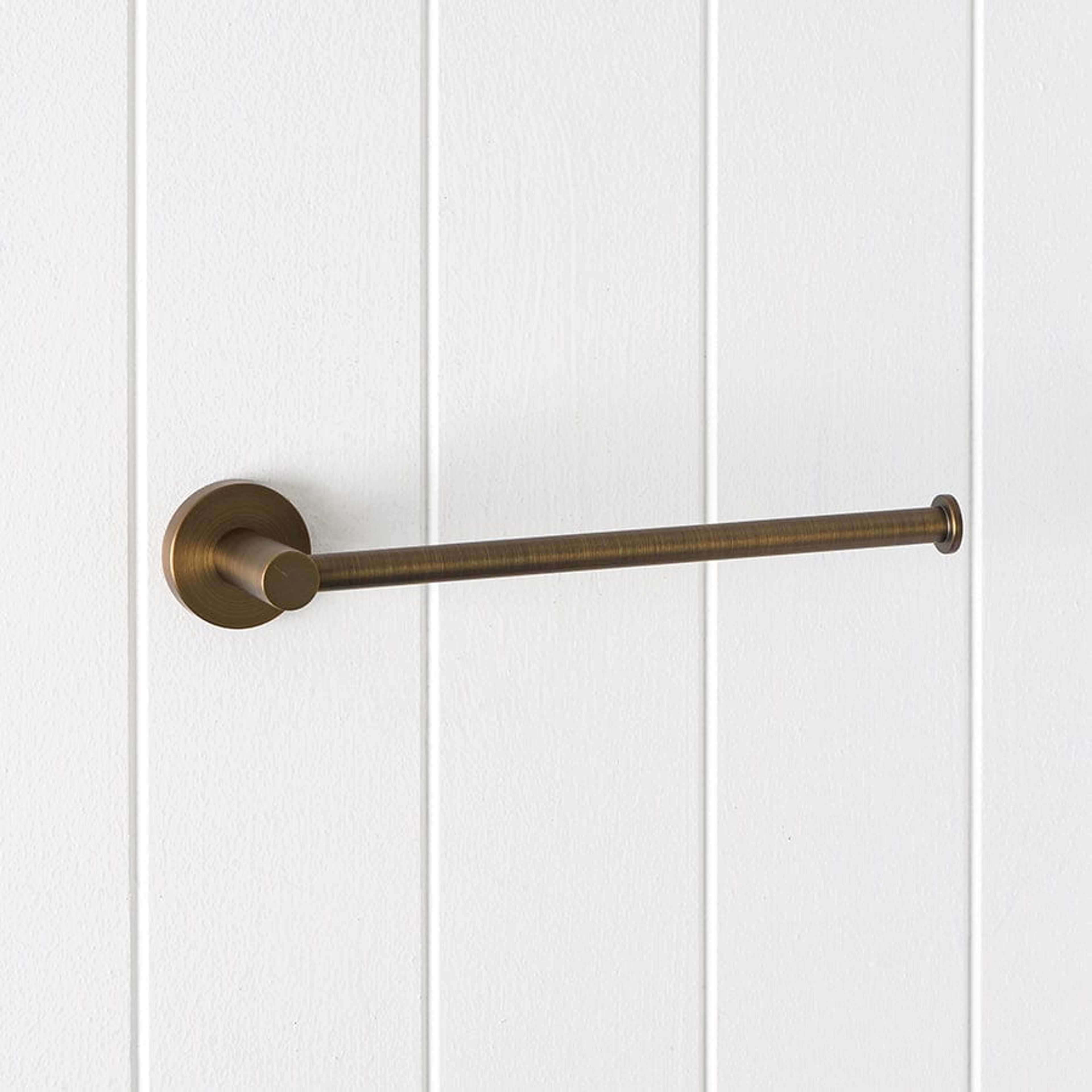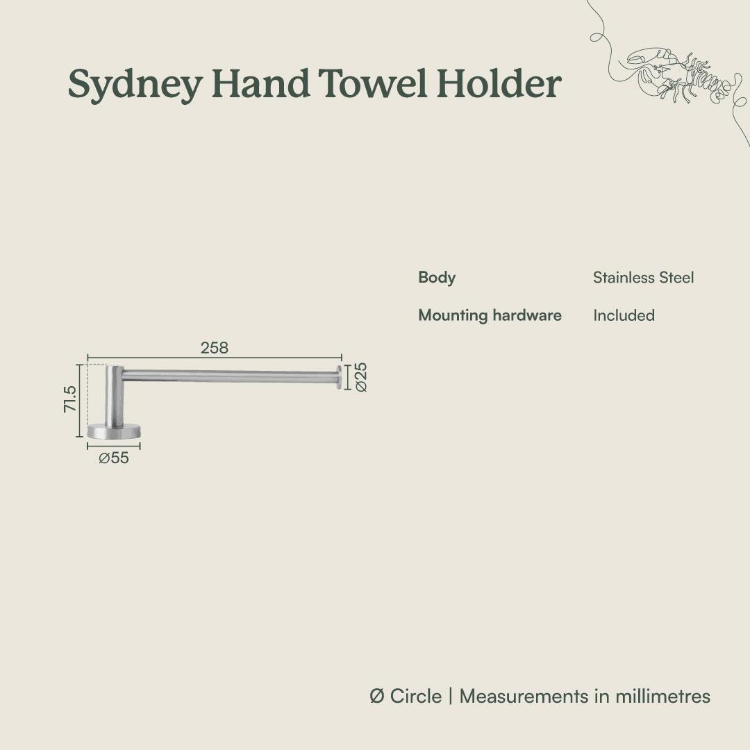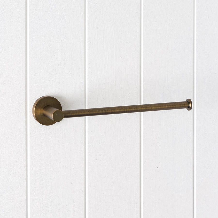 The Sydney Hand Towel Holder in Antique Brass adds a warm, contemporary line beside the basin. Its slim stainless steel arm and round back plate keep towels close without cluttering the wall. Pair with matching tapware for a cohesive, design led bathroom.