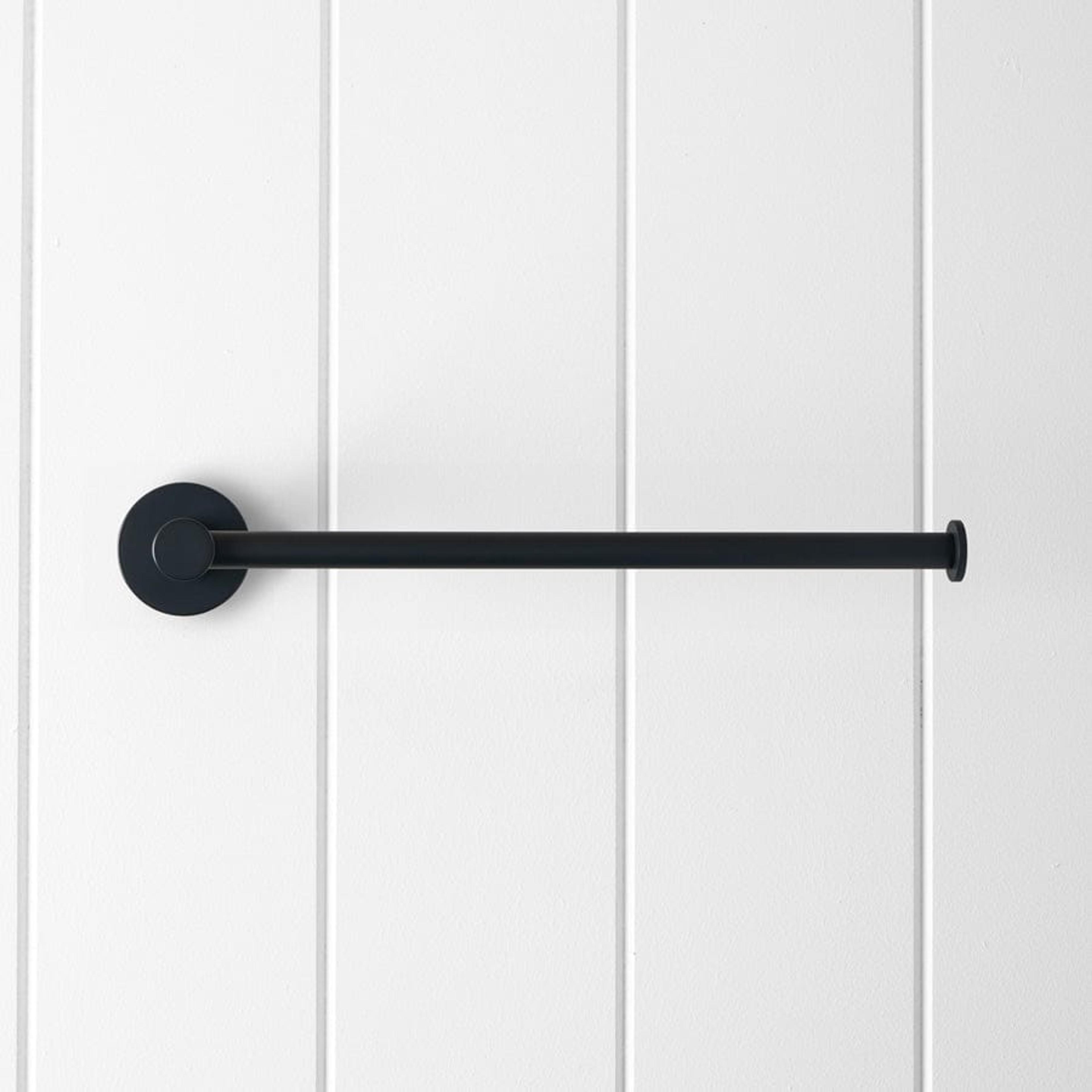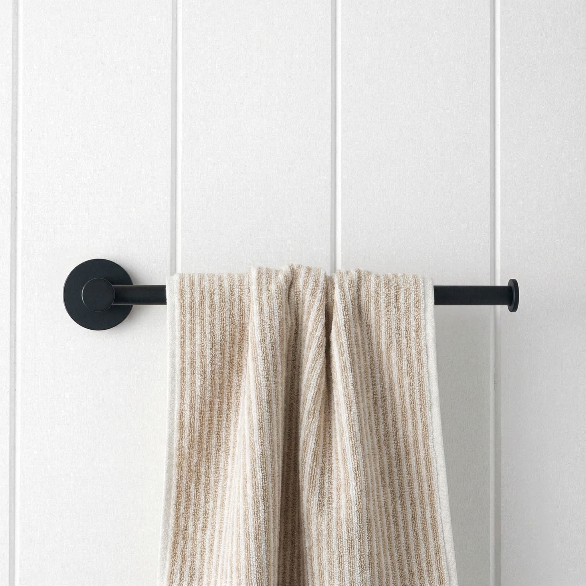 The Sydney Hand Towel Holder in Matte Black draws a fine black line across the wall, echoing matte black tapware and frames. The simple stainless steel arm holds a single towel neatly, giving the room a crisp, graphic edge.