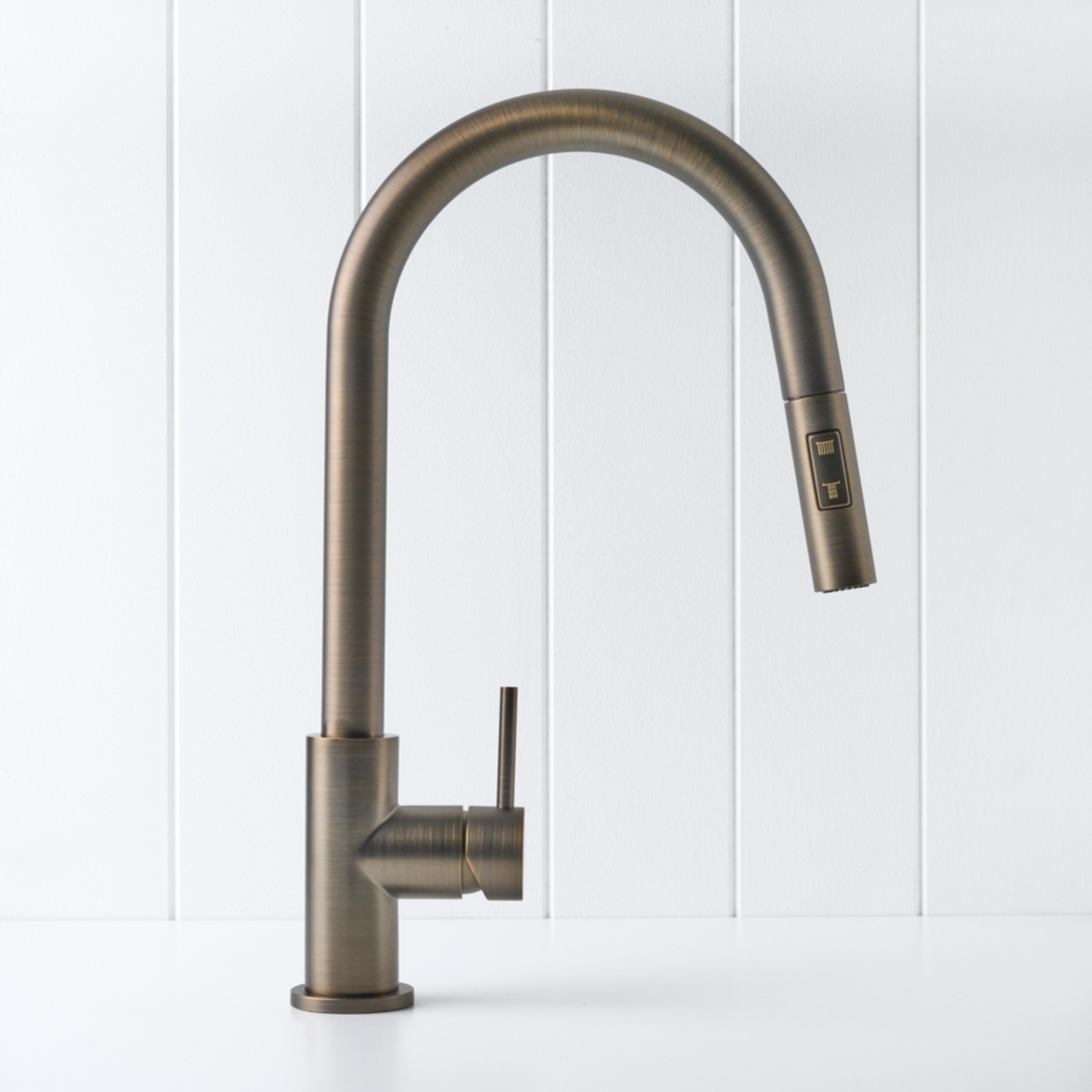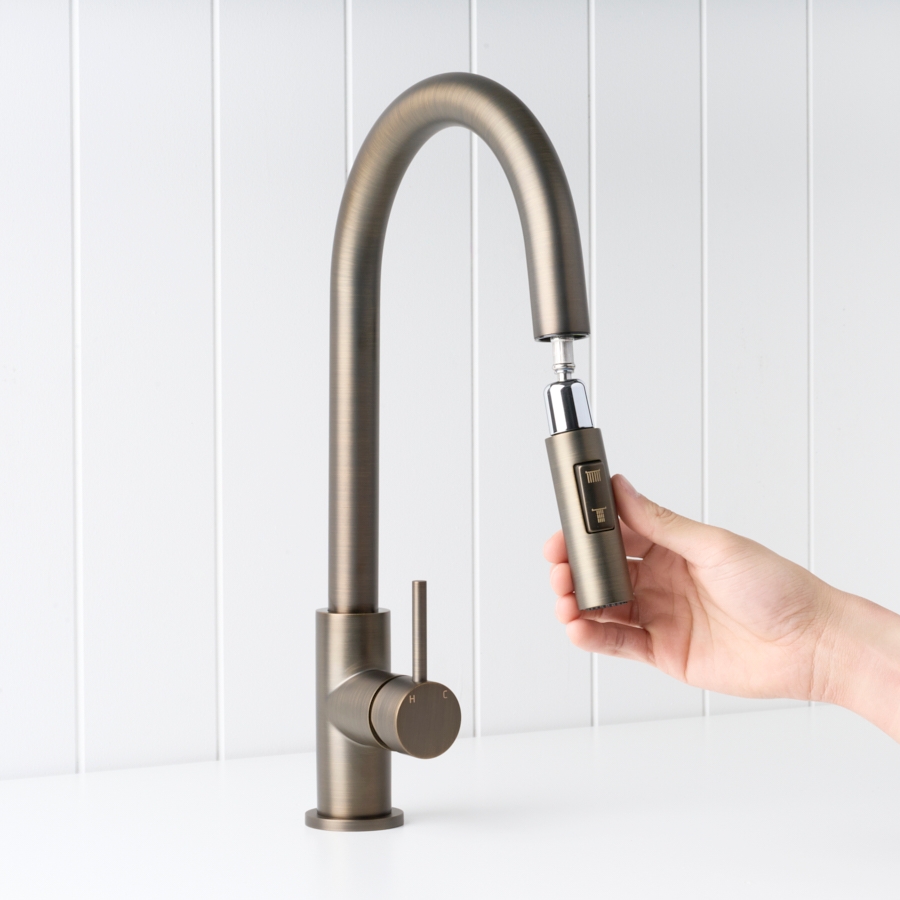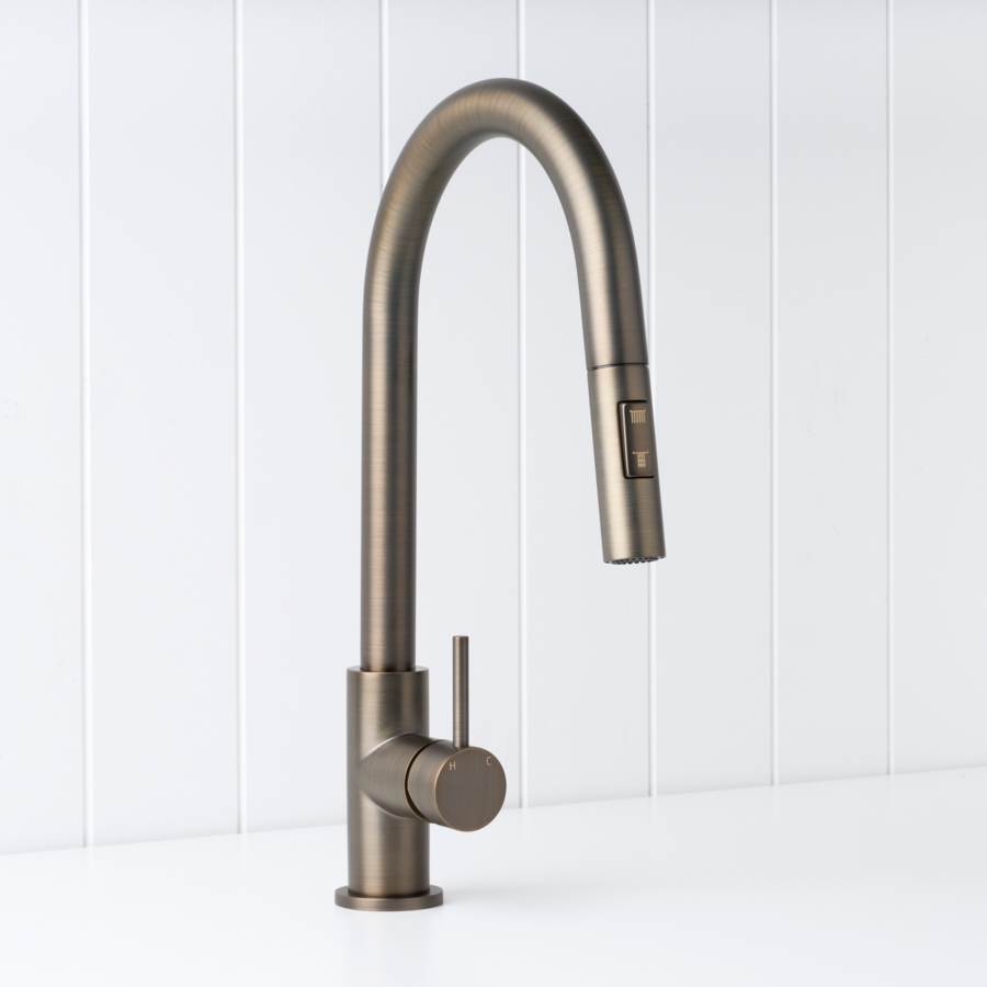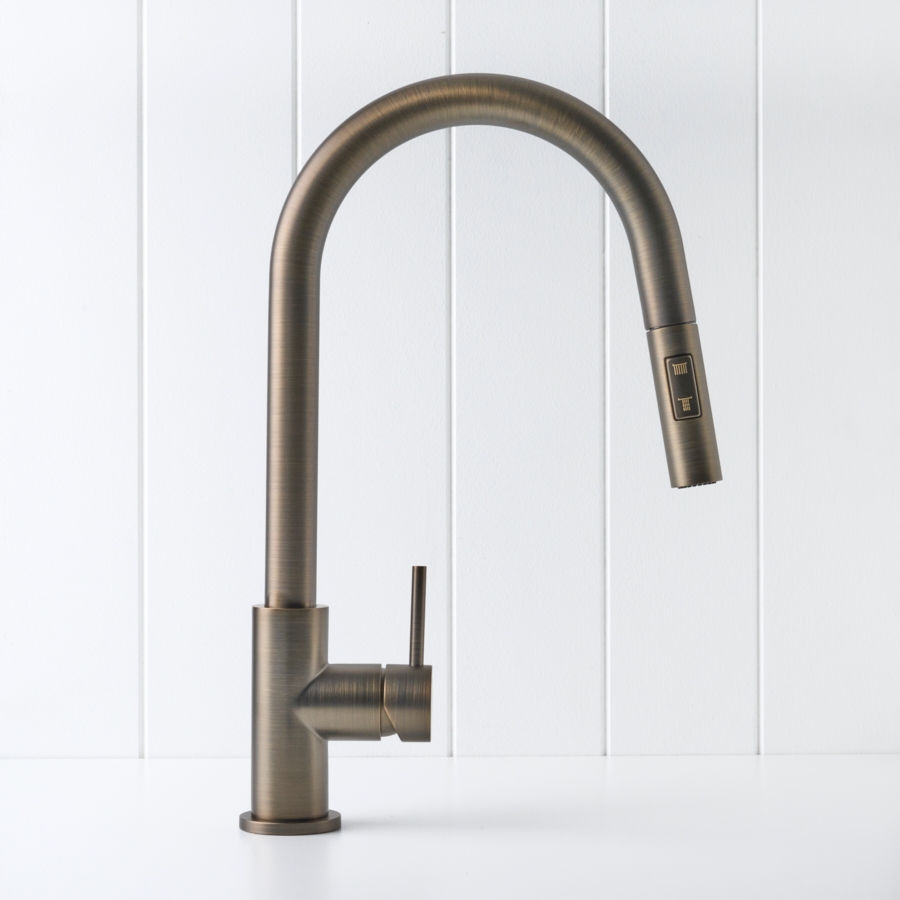 The Sydney Pullout Kitchen Mixer in Antique Brass brings warm, modern character to the kitchen sink. Its pull out hose and new dual spray modes let you switch between a soft shower and aerated stream for rinsing dishes or filling pots. The Antique Brass finish over stainless steel pairs beautifully with stone and timber, making everyday tasks feel a little more considered.
