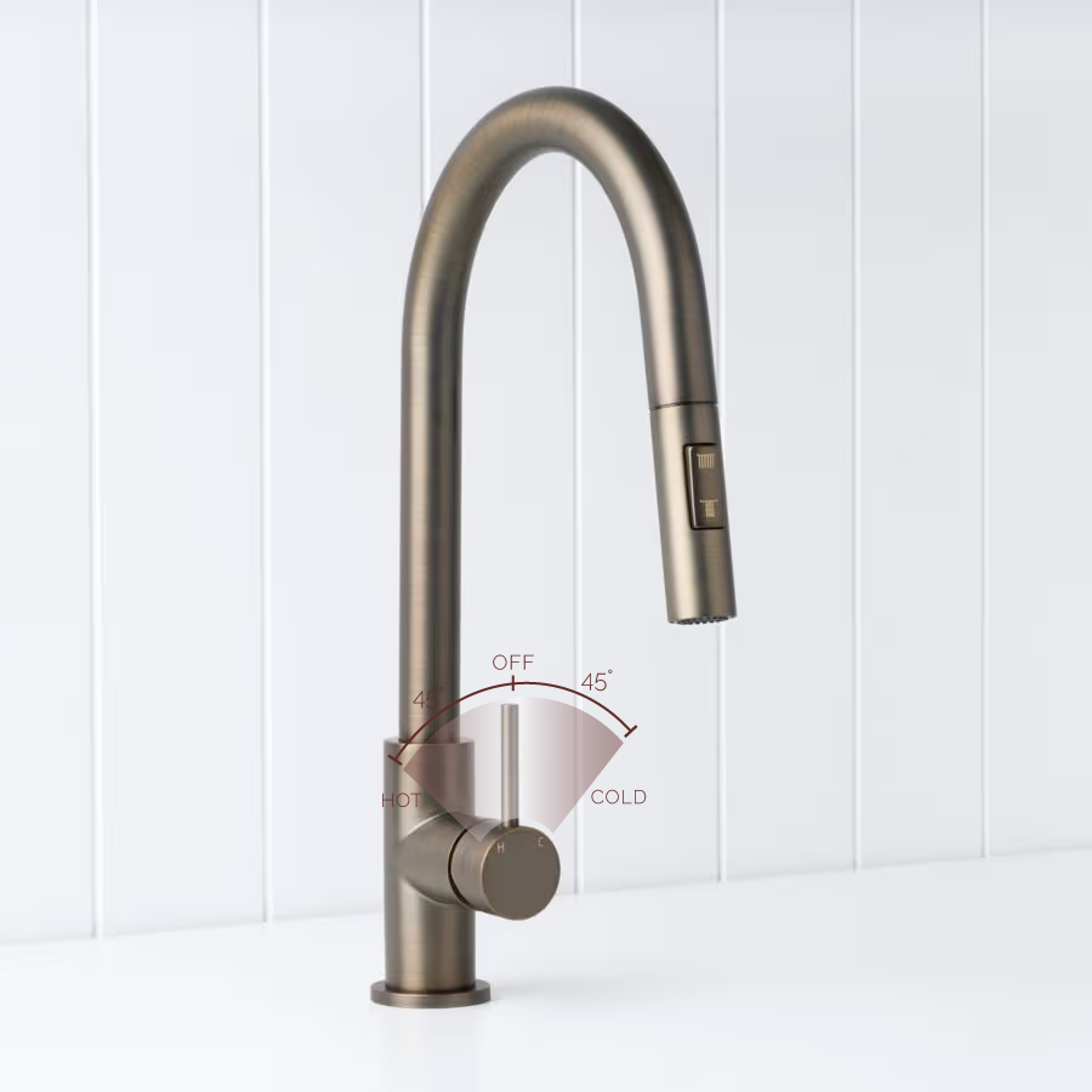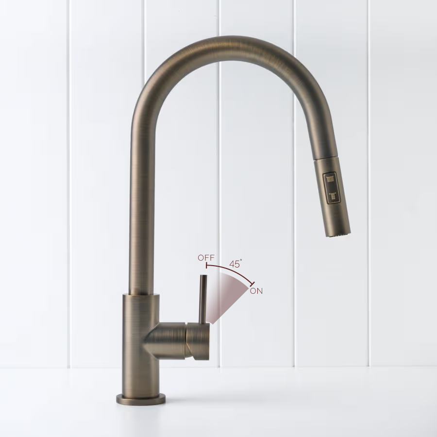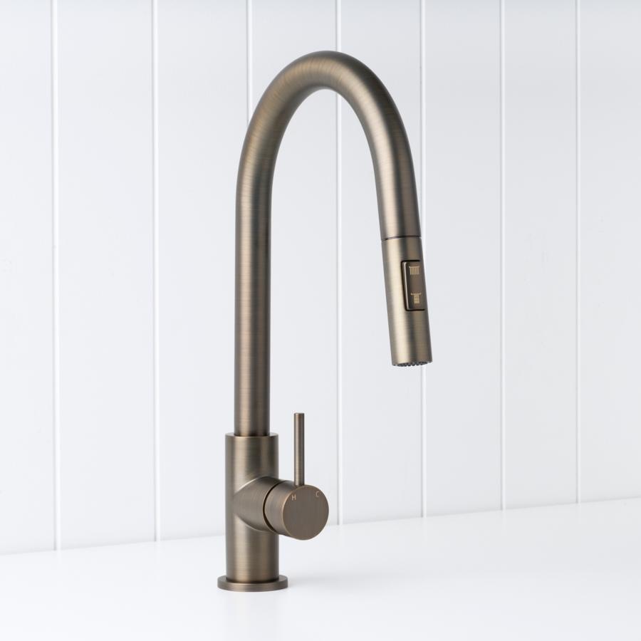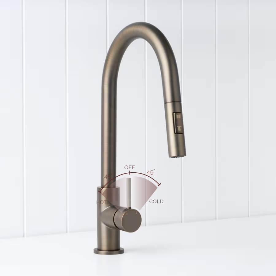 The Sydney Pullout Kitchen Mixer in Antique Brass brings warm, modern character to the kitchen sink. Its pull out hose and new dual spray modes let you switch between a soft shower and aerated stream for rinsing dishes or filling pots. The Antique Brass finish over stainless steel pairs beautifully with stone and timber, making everyday tasks feel a little more considered.