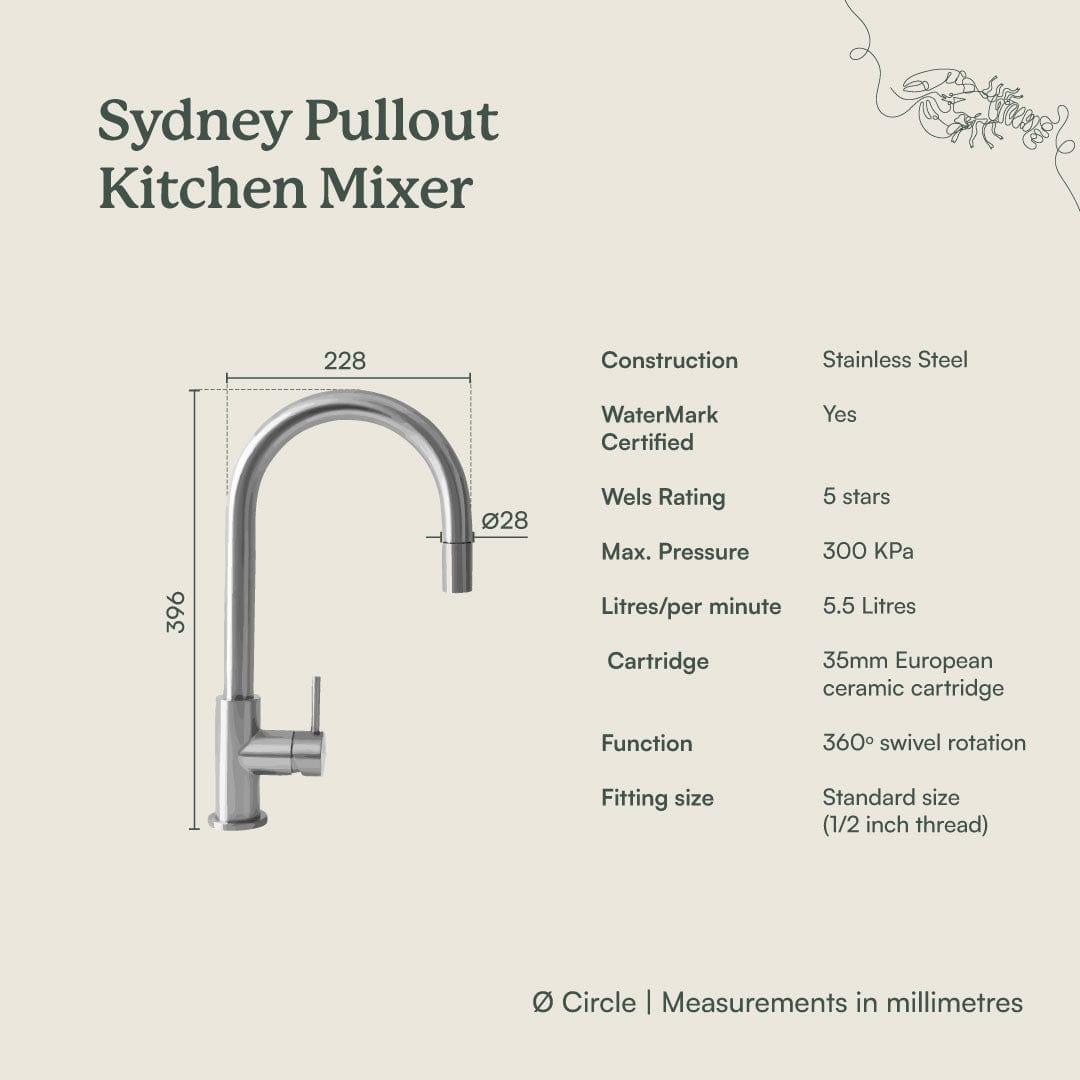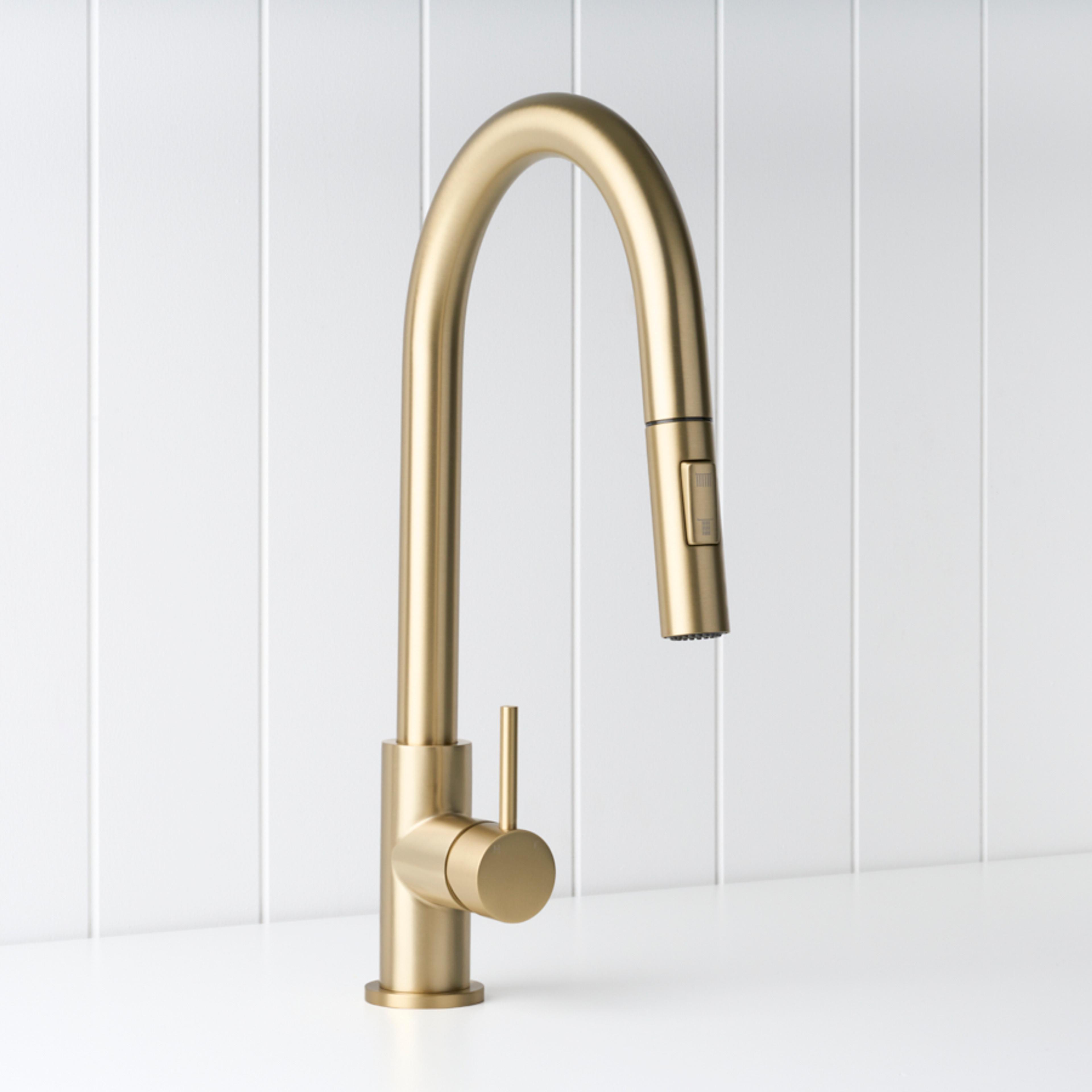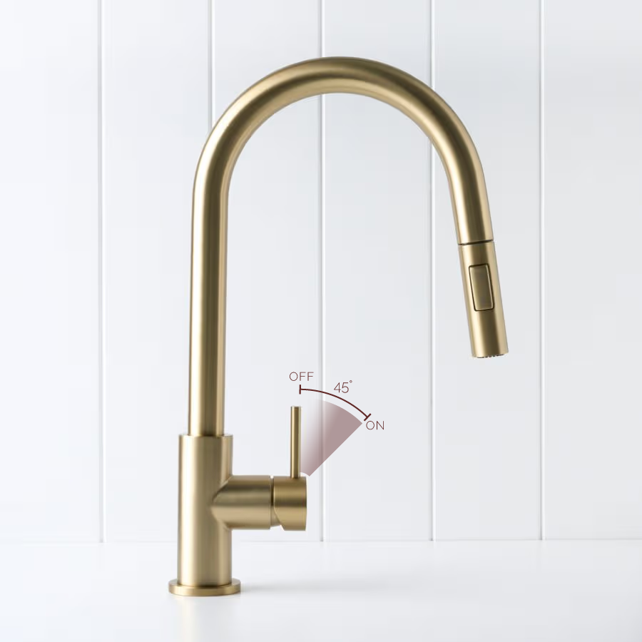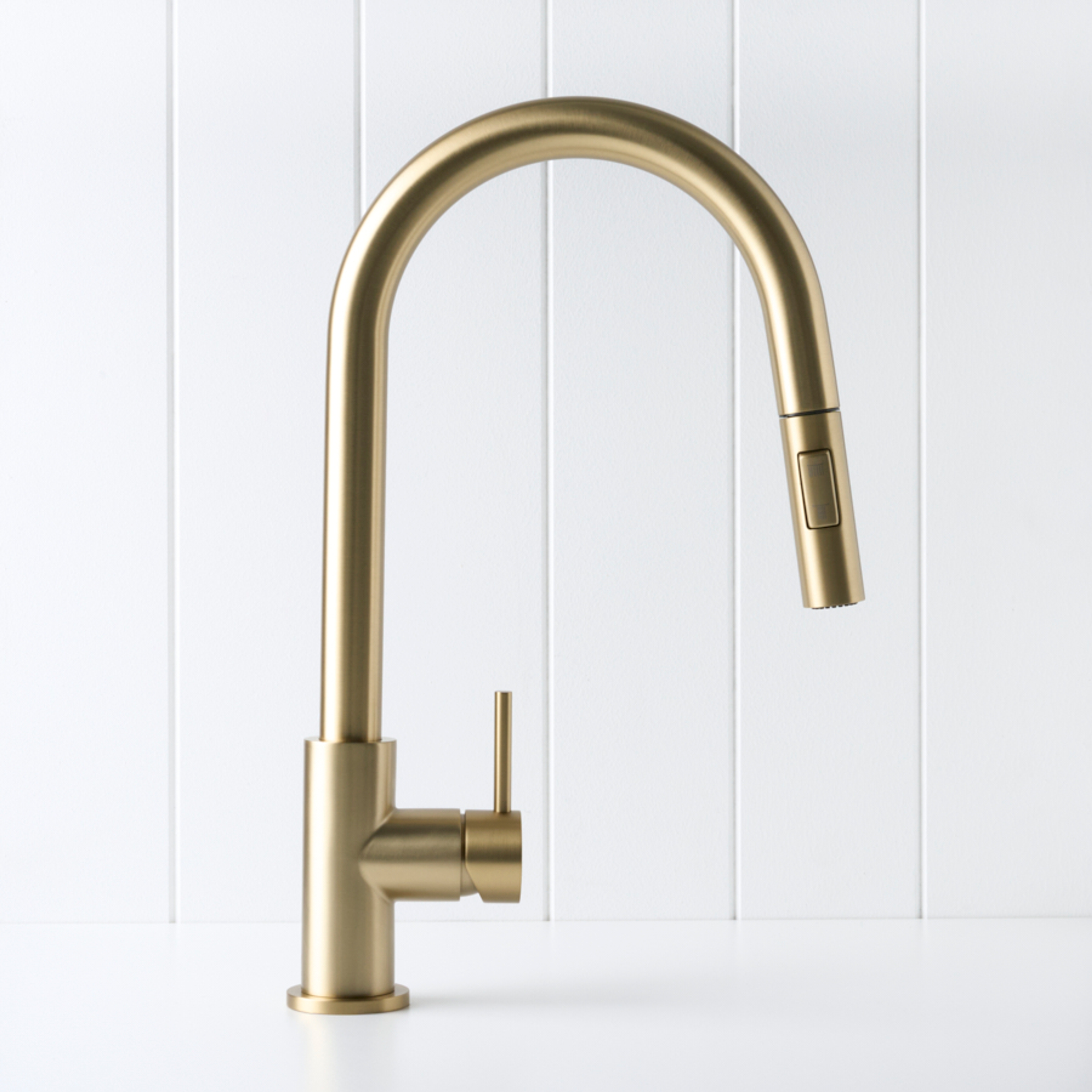 The Sydney Pullout Kitchen Mixer in Brushed Brass adds soft glow and flexibility to the kitchen. A pull out hose and dual spray options make switching from a wide shower to a focused aerated stream effortless. The Brushed Brass finish looks calm against light stone and tiles, turning everyday washing up into a small ritual.