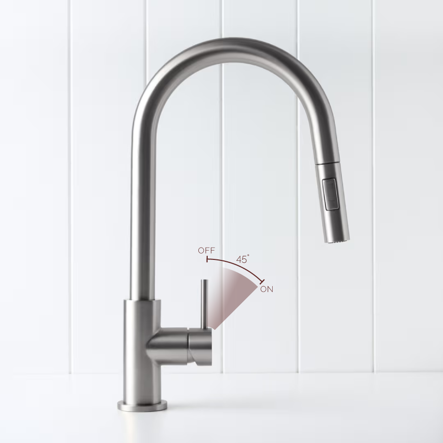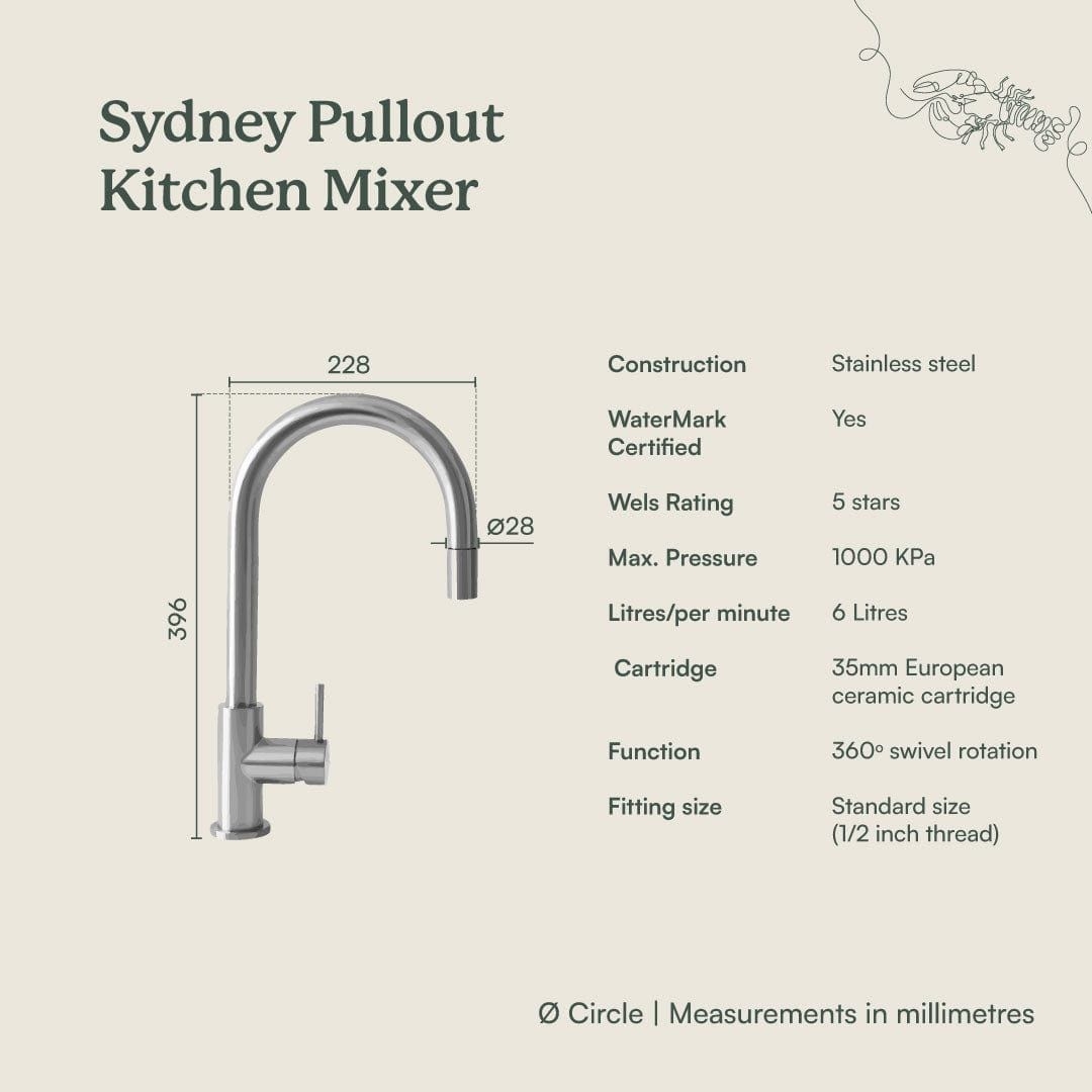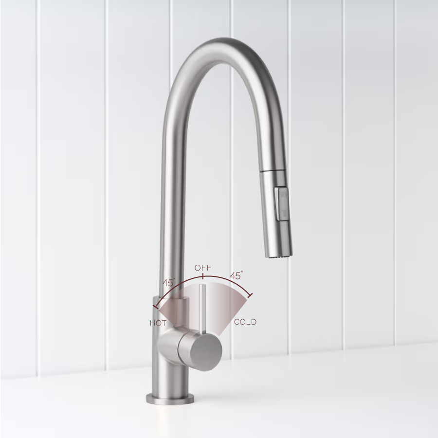 The Sydney Pullout Kitchen Mixer in Stainless Steel brings a clean, quiet presence to the kitchen bench. Its pull out hose and dual spray settings let you easily shift from rinsing vegetables to cleaning the sink. The brushed Stainless Steel finish works with most appliances and benchtops, keeping the space feeling calm and cohesive.