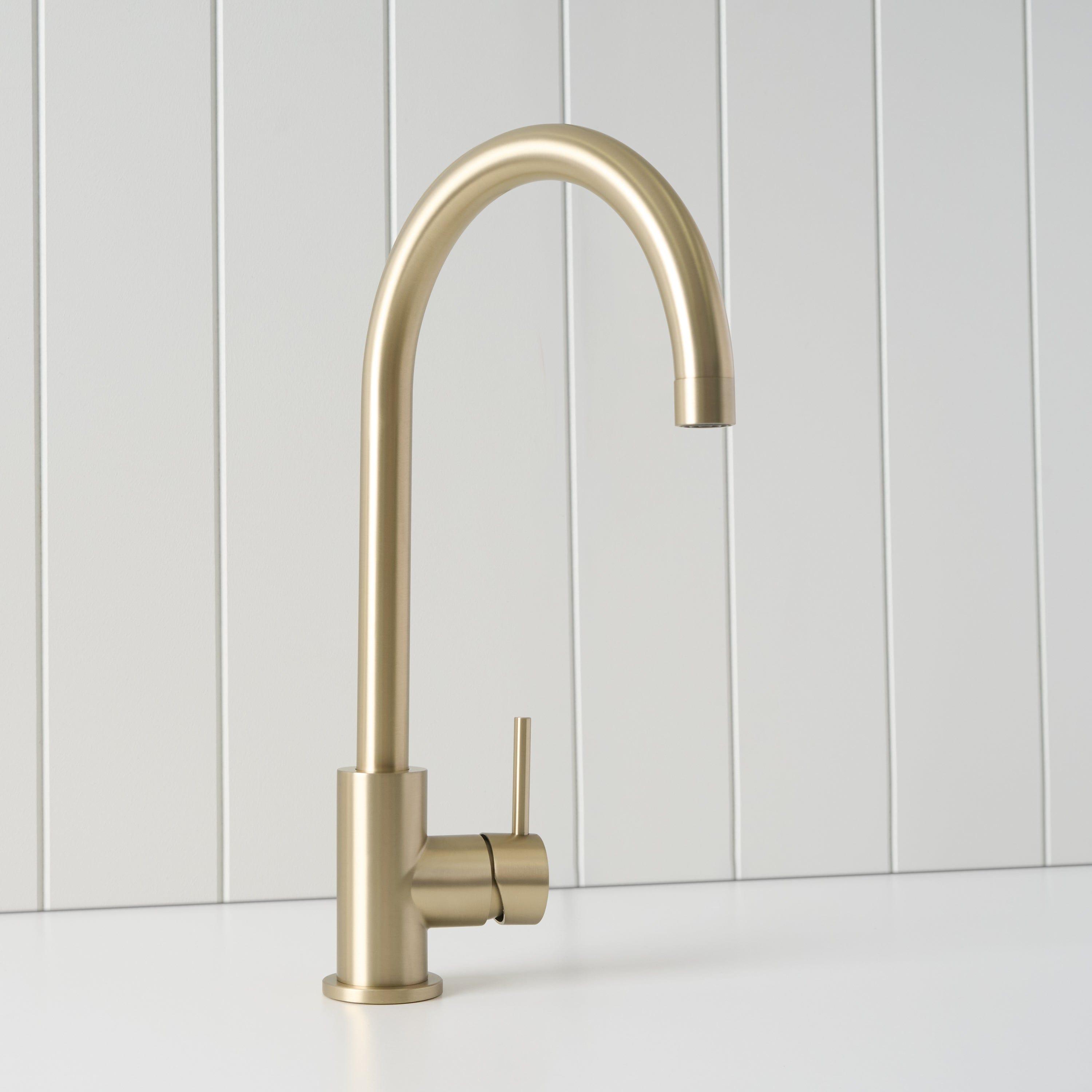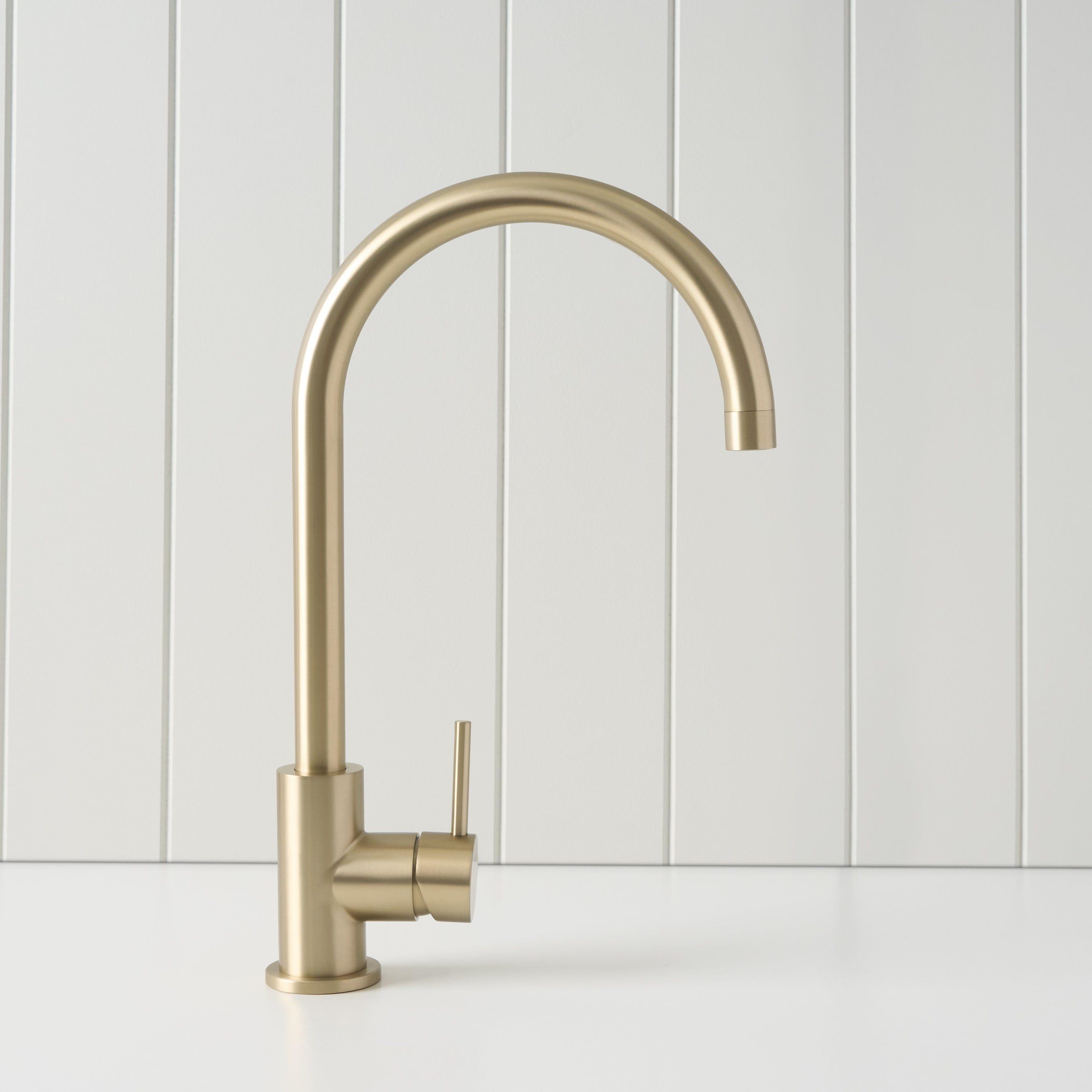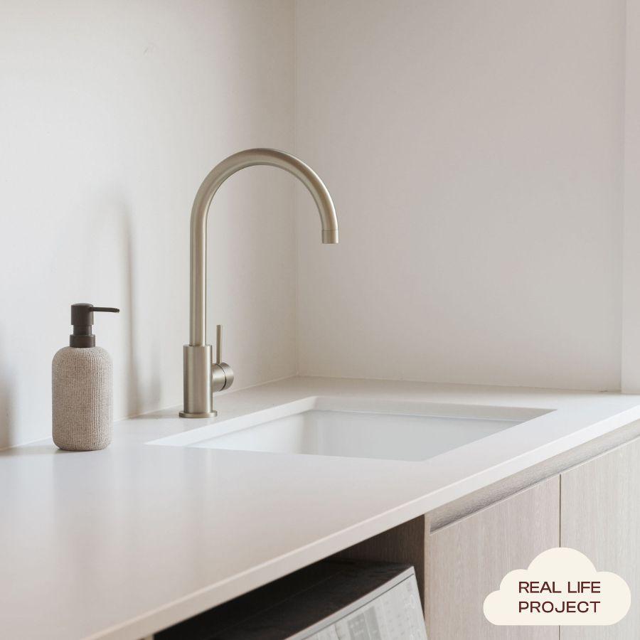 The Sydney Round Kitchen Mixer in Warm Brushed Nickel brings a soft, neutral tone and elegant curve to the kitchen. The Warm Brushed Nickel finish over stainless steel sits comfortably with both warm and cool palettes. With its tall round spout and smooth lever, this mixer keeps everyday sink tasks feeling easy.