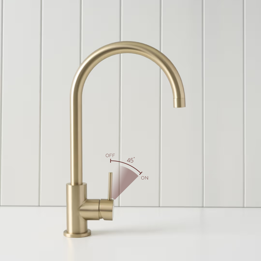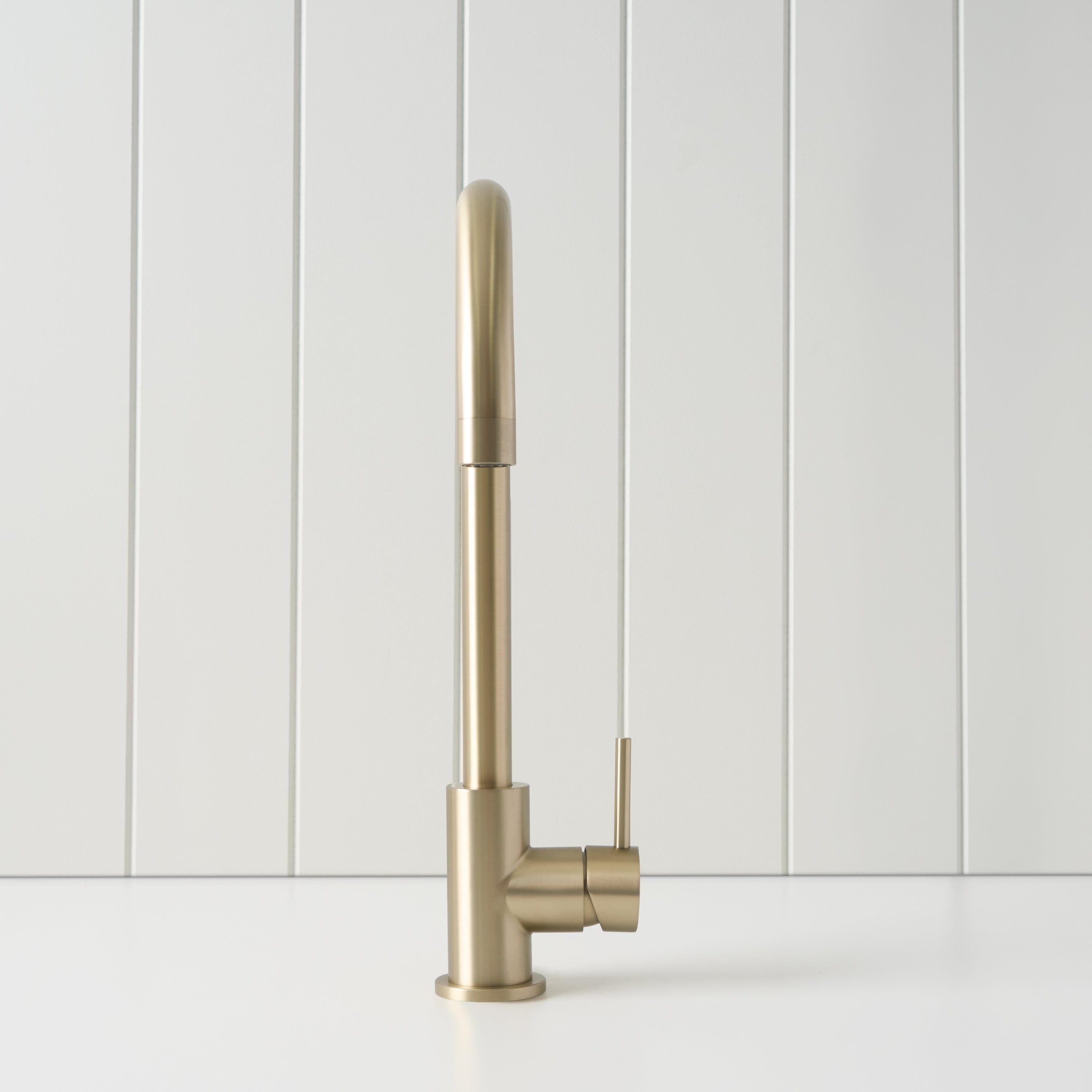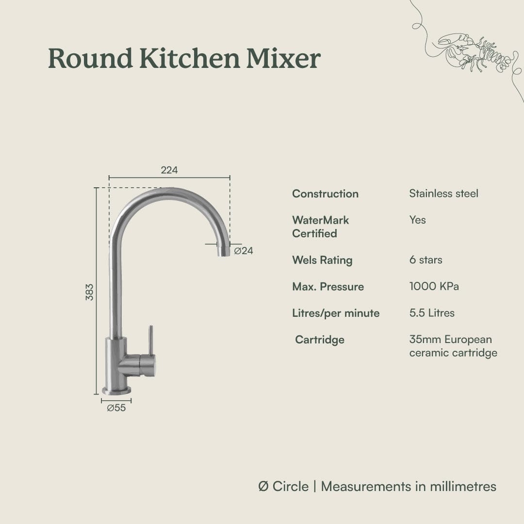 The Sydney Round Kitchen Mixer in Warm Brushed Nickel brings a soft, neutral tone and elegant curve to the kitchen. The Warm Brushed Nickel finish over stainless steel sits comfortably with both warm and cool palettes. With its tall round spout and smooth lever, this mixer keeps everyday sink tasks feeling easy.