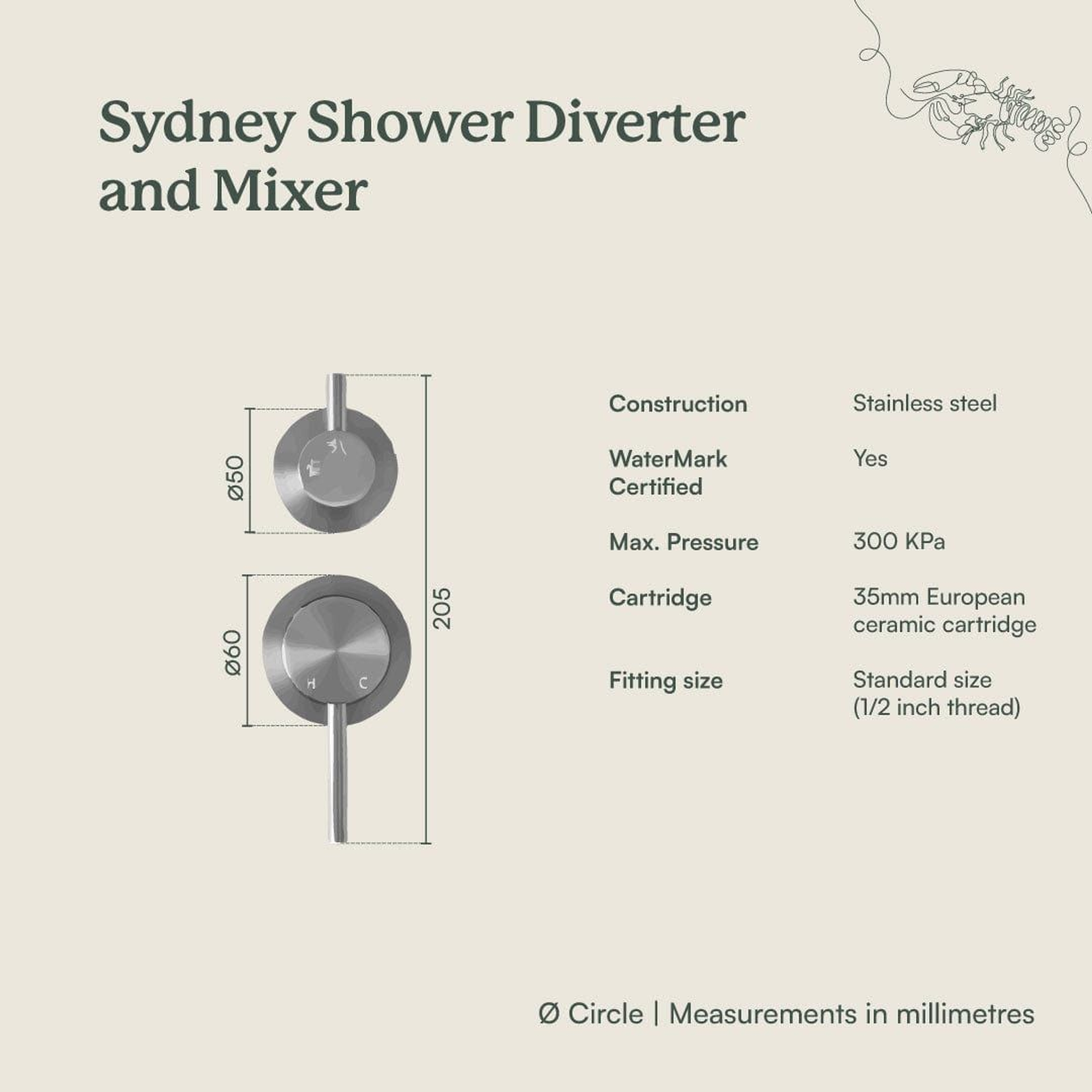 Sydney Shower Diverter and Mixer Stainless Steel