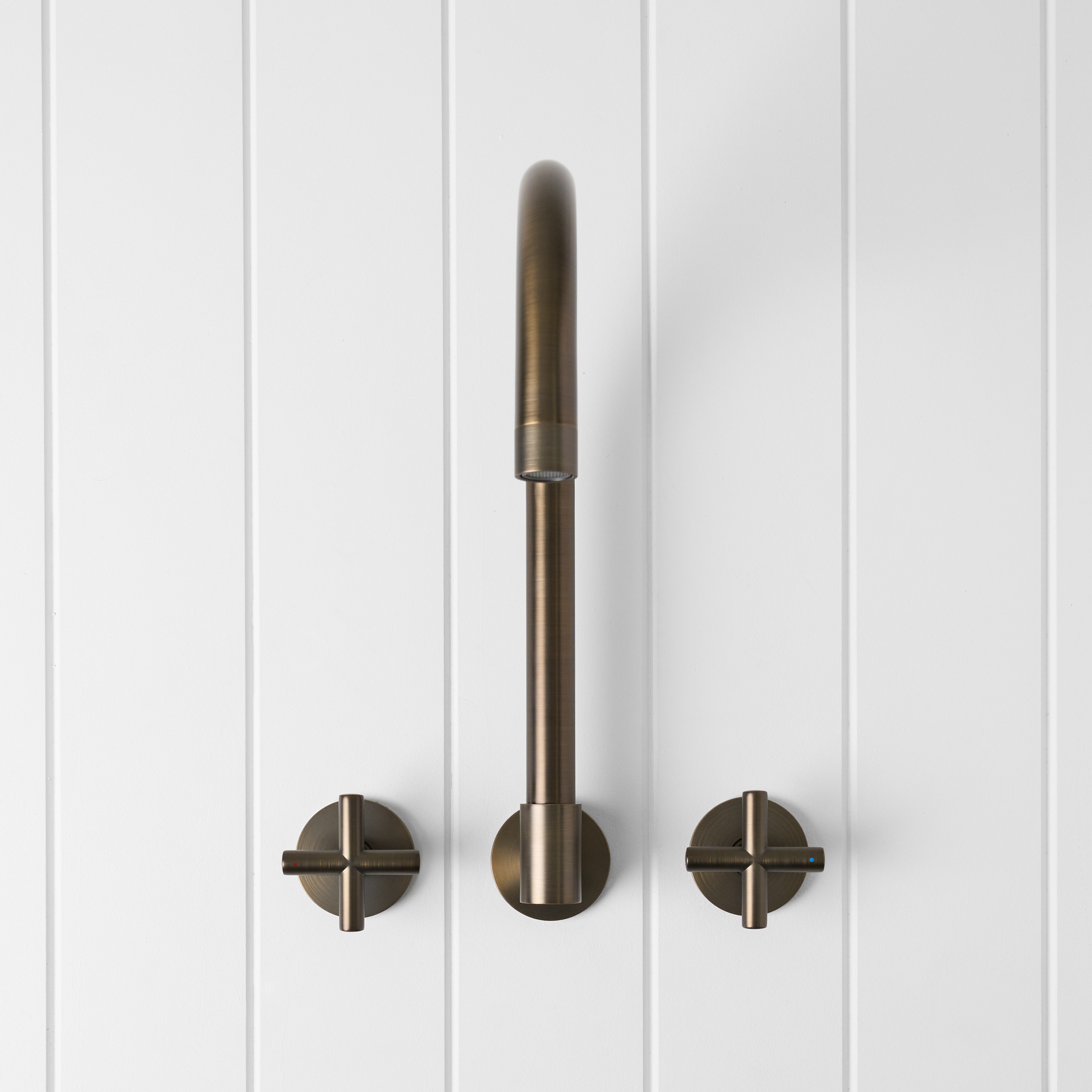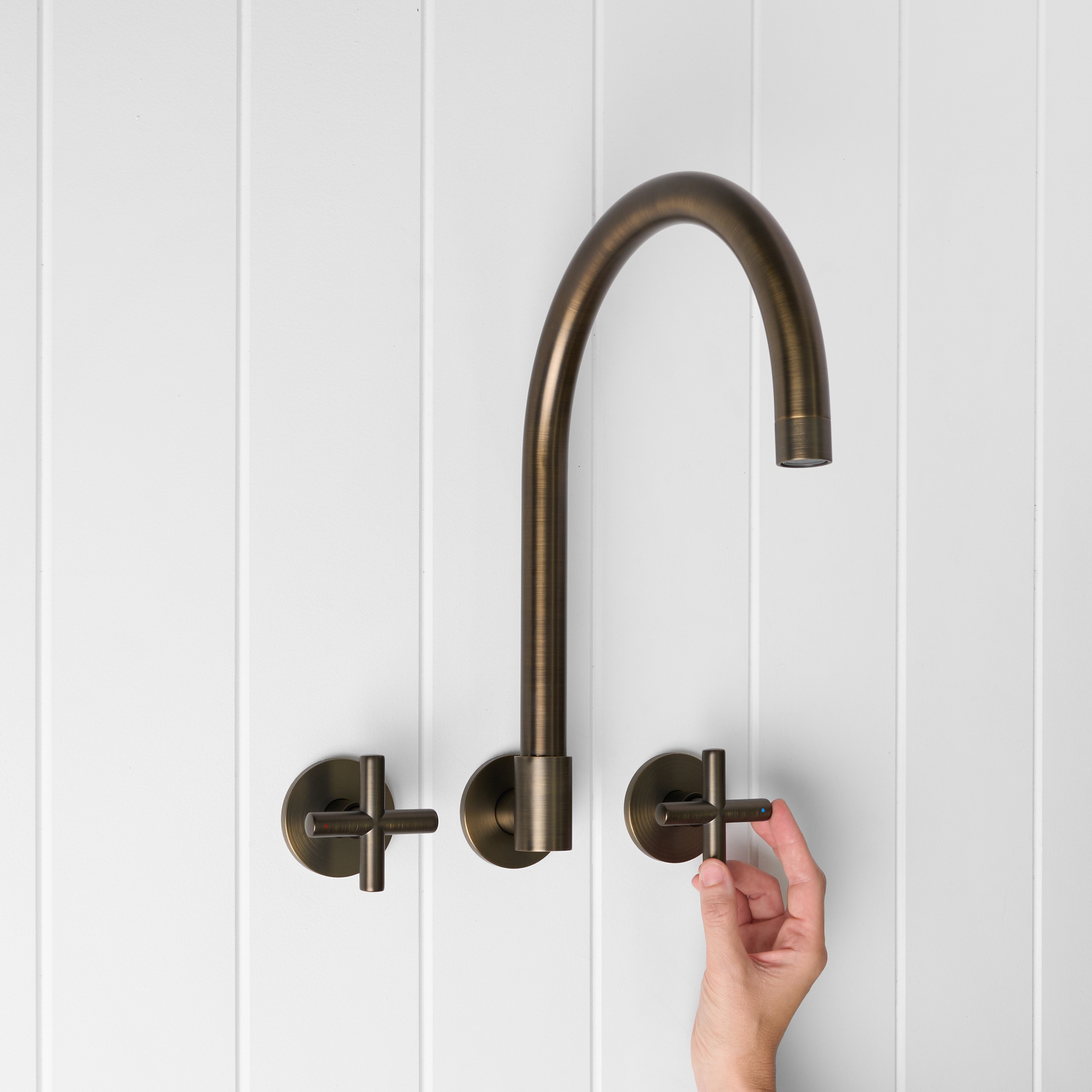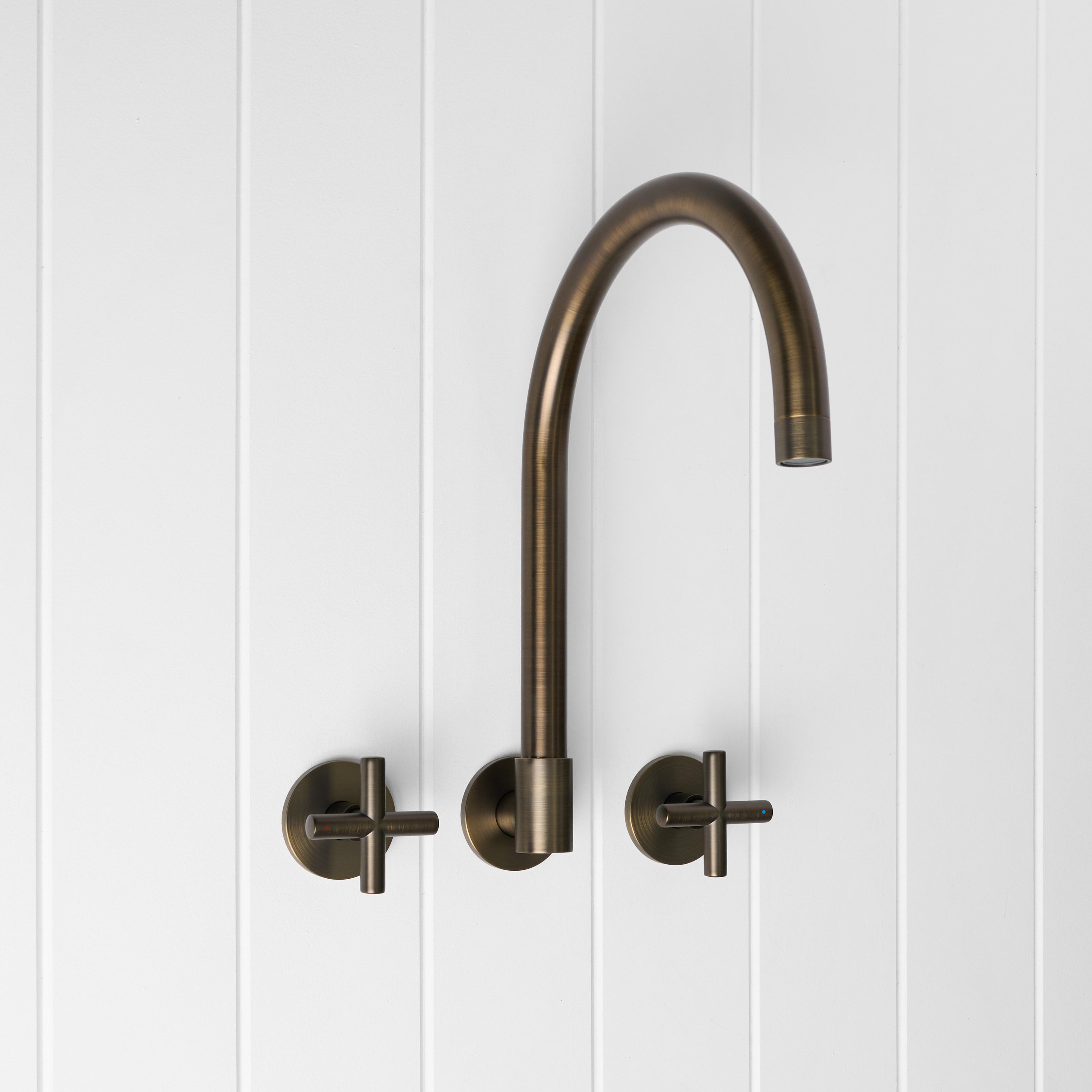 The Sydney Swivel Spout + Cross Taps Antique Brass combines a soft gooseneck profile with practical flexibility, offering a refined solution for compact spaces.