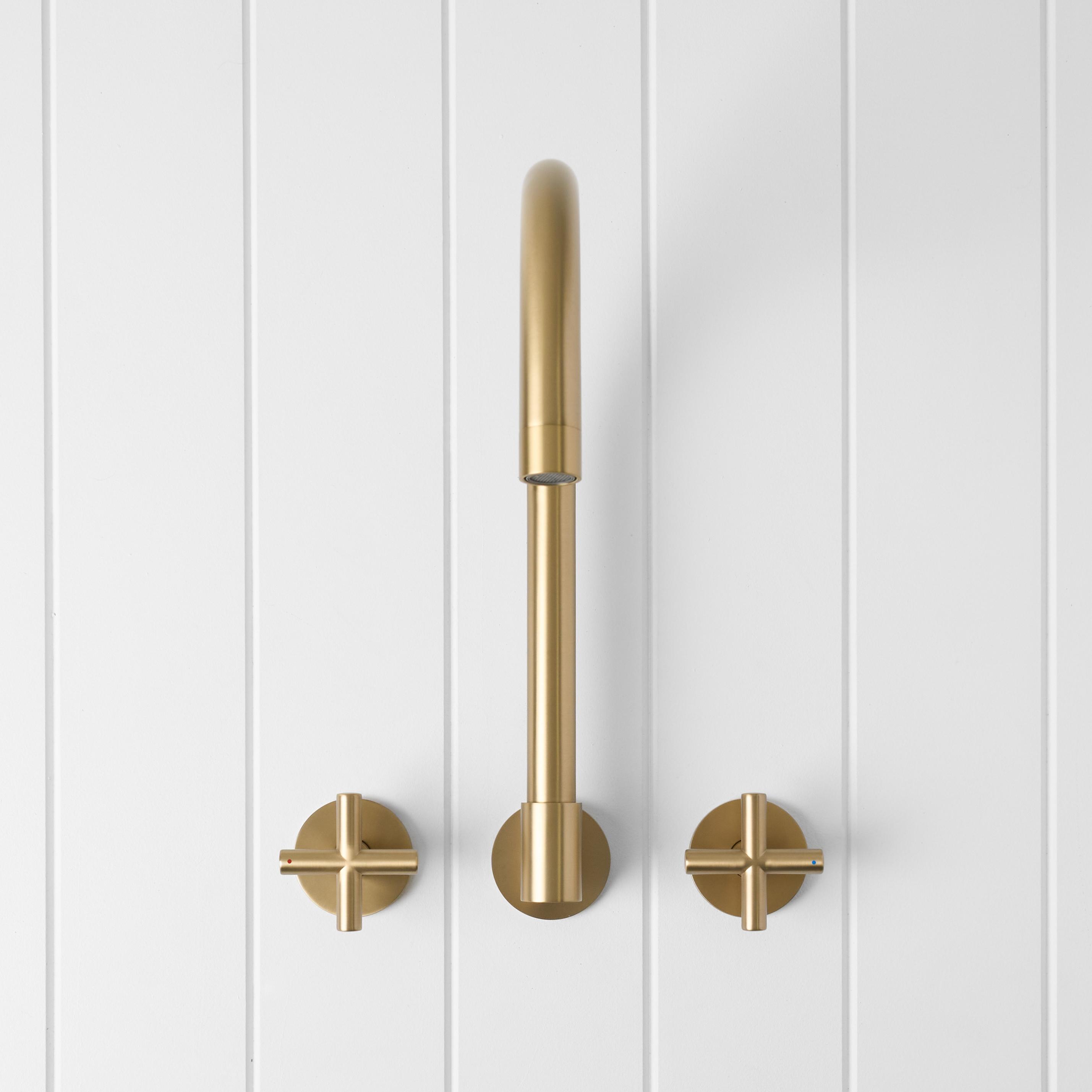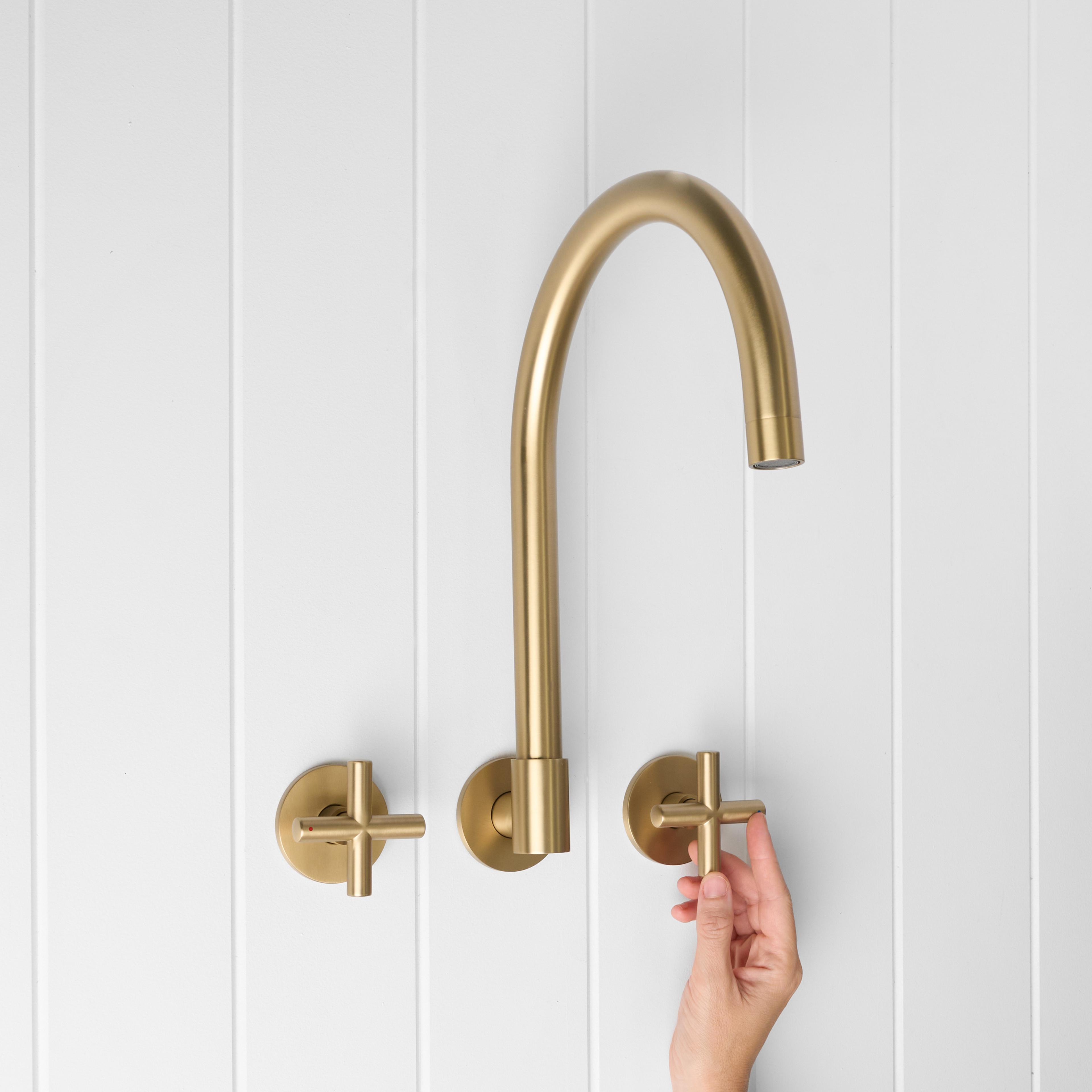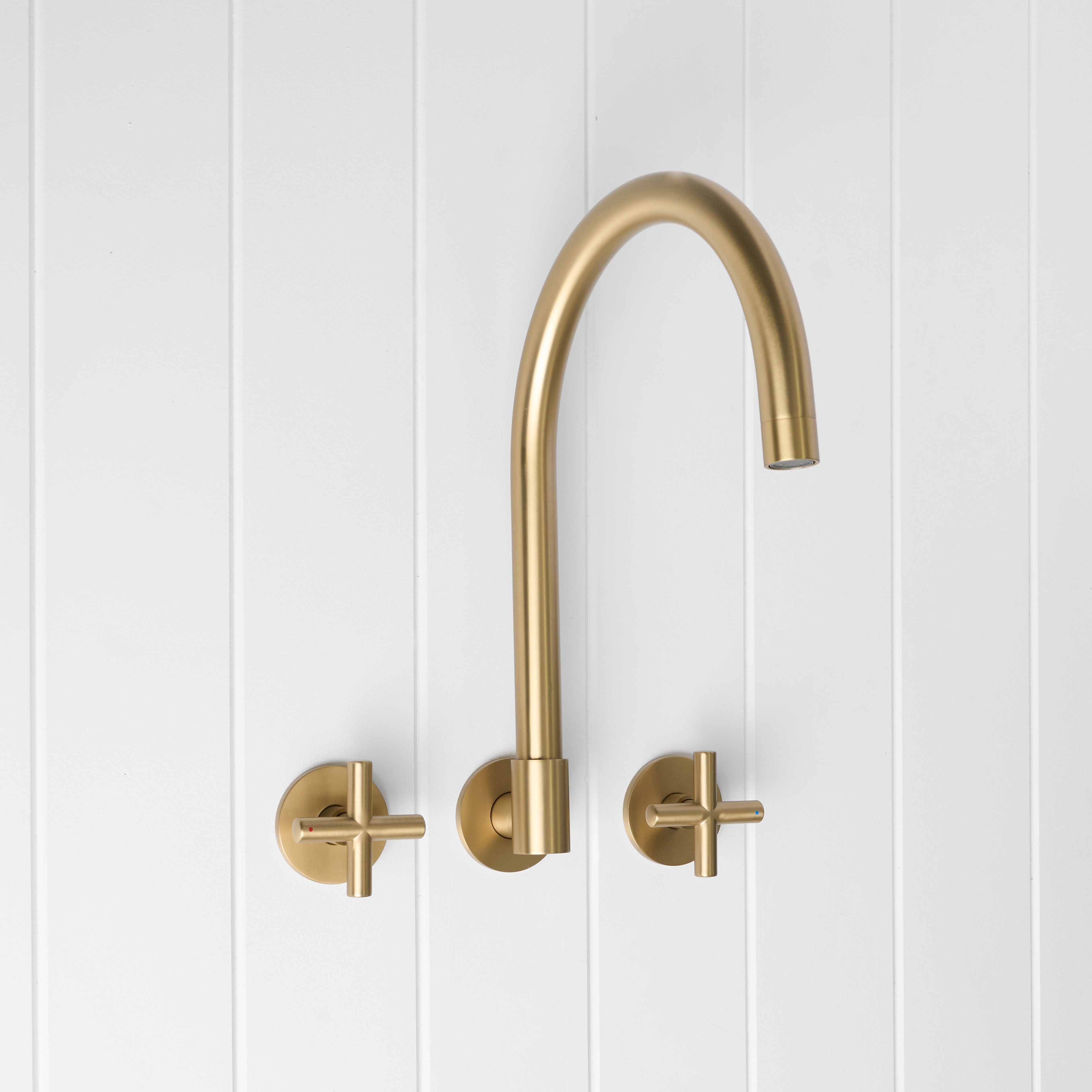 The Sydney Swivel Spout + Cross Taps Brushed Brass combines a soft gooseneck profile with practical flexibility, offering a refined solution for compact spaces.