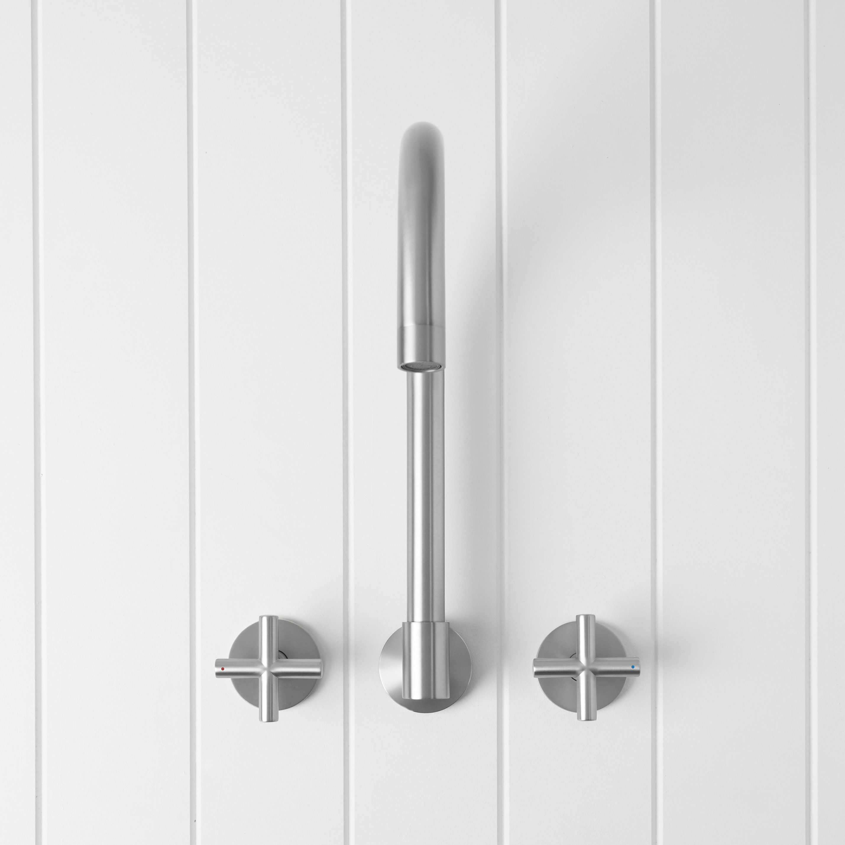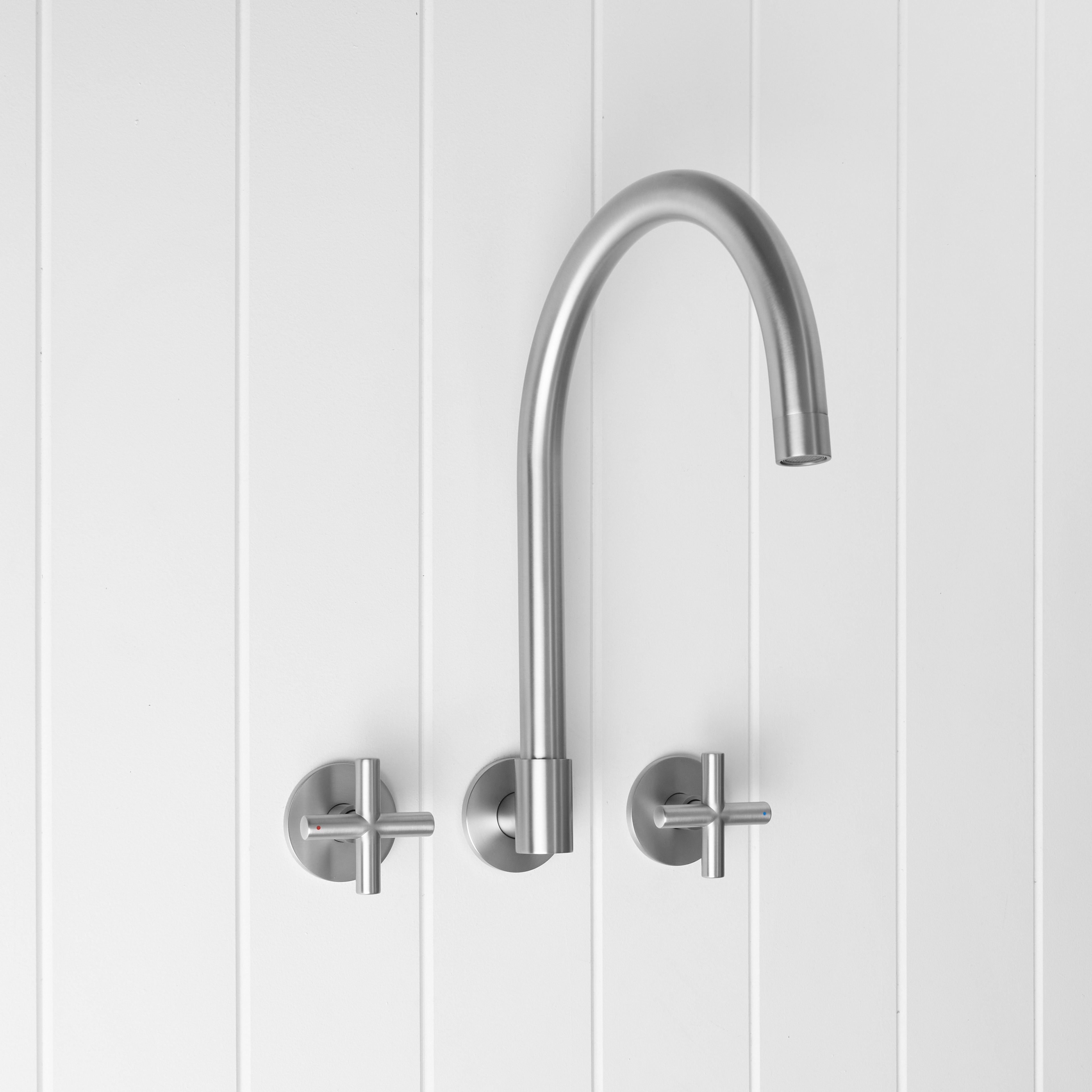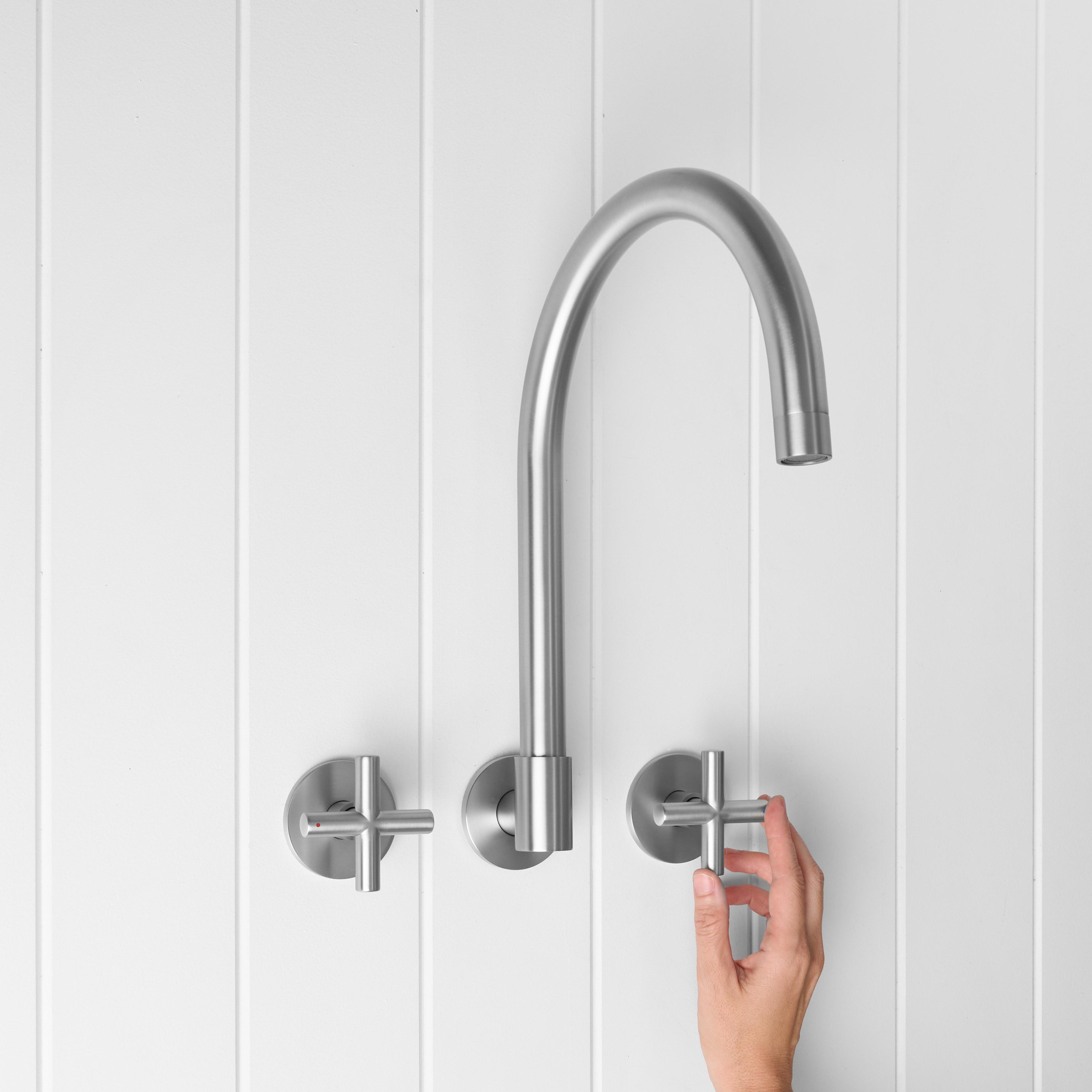 The Sydney Swivel Spout + Cross Taps Stainless Steel combines a soft gooseneck profile with practical flexibility, offering a refined solution for compact spaces.