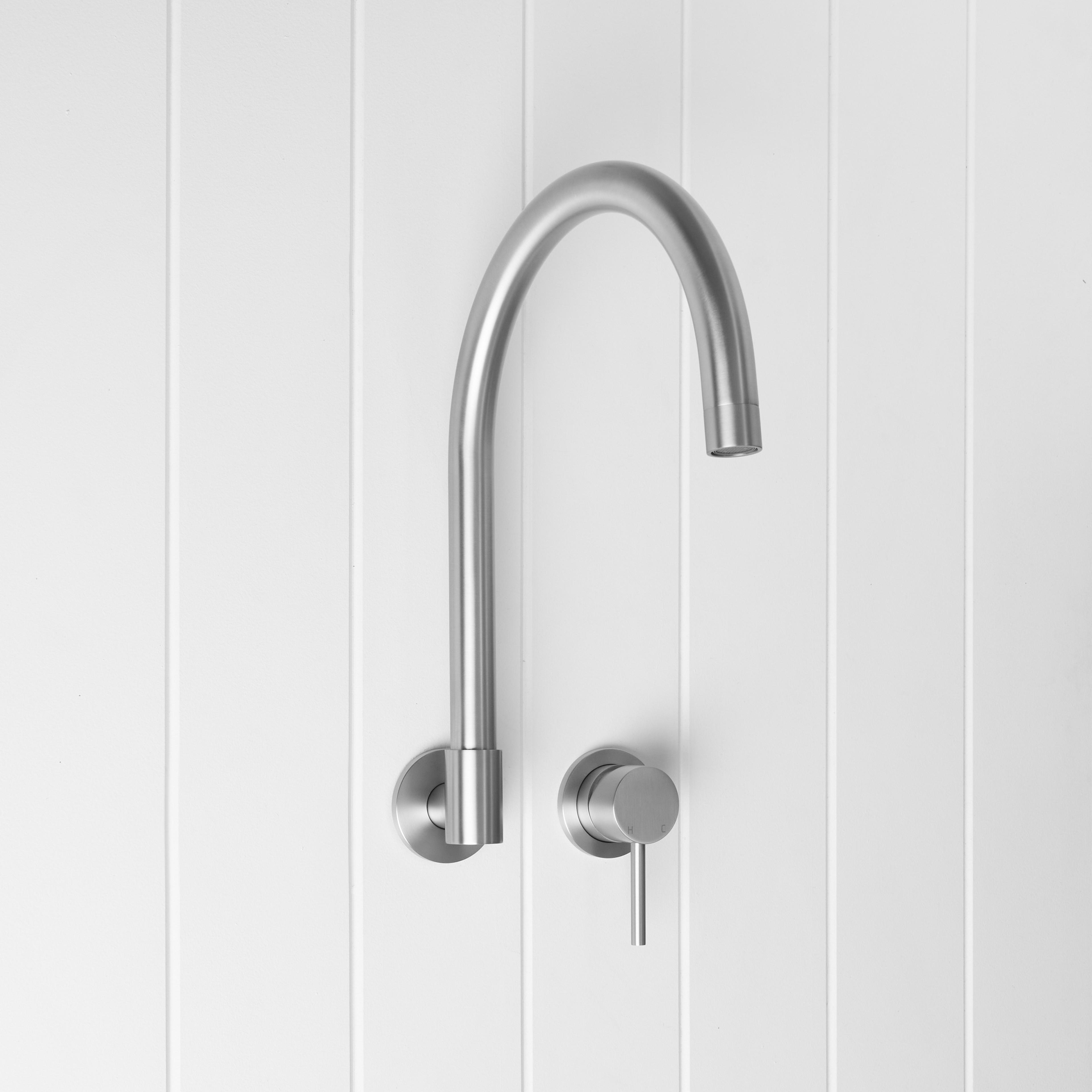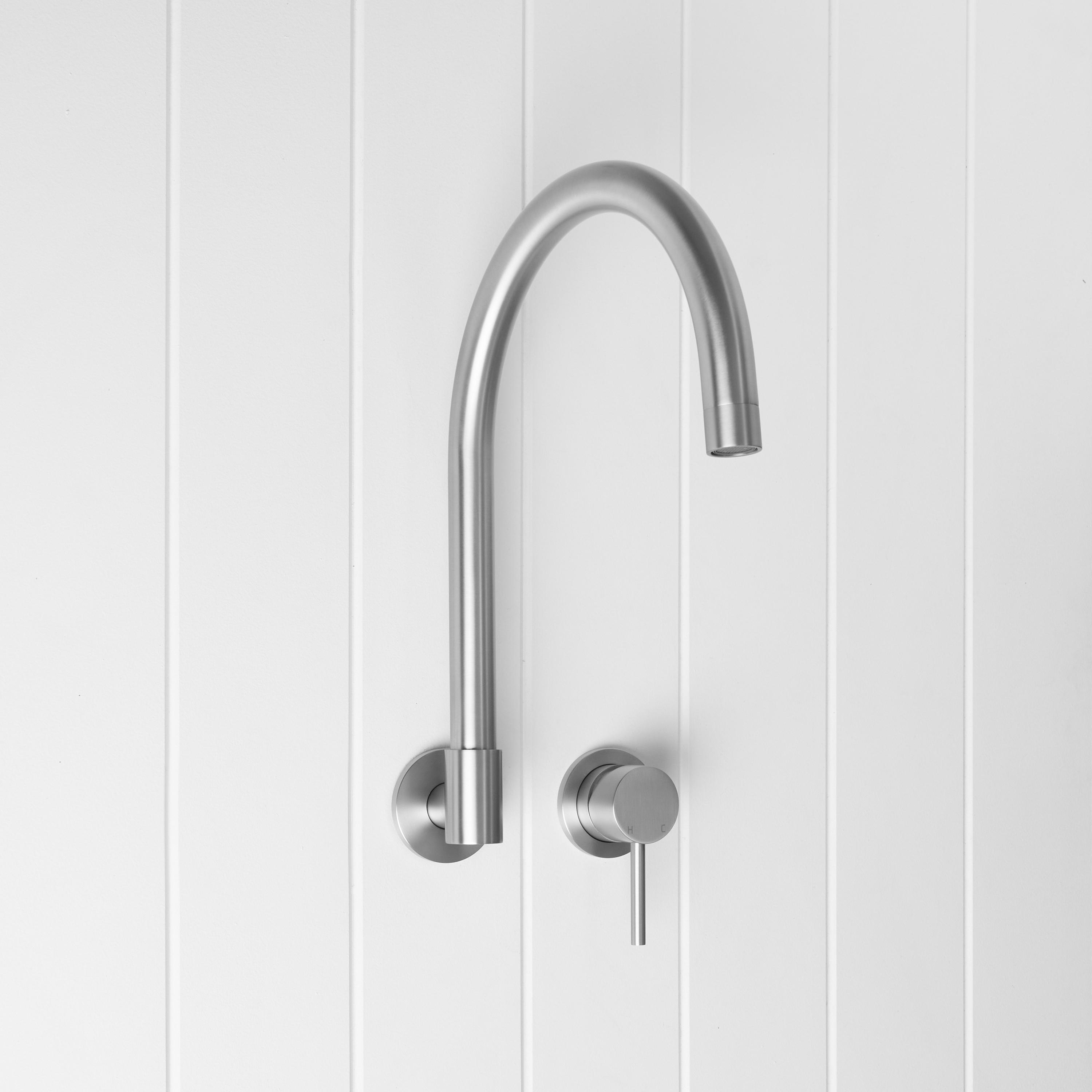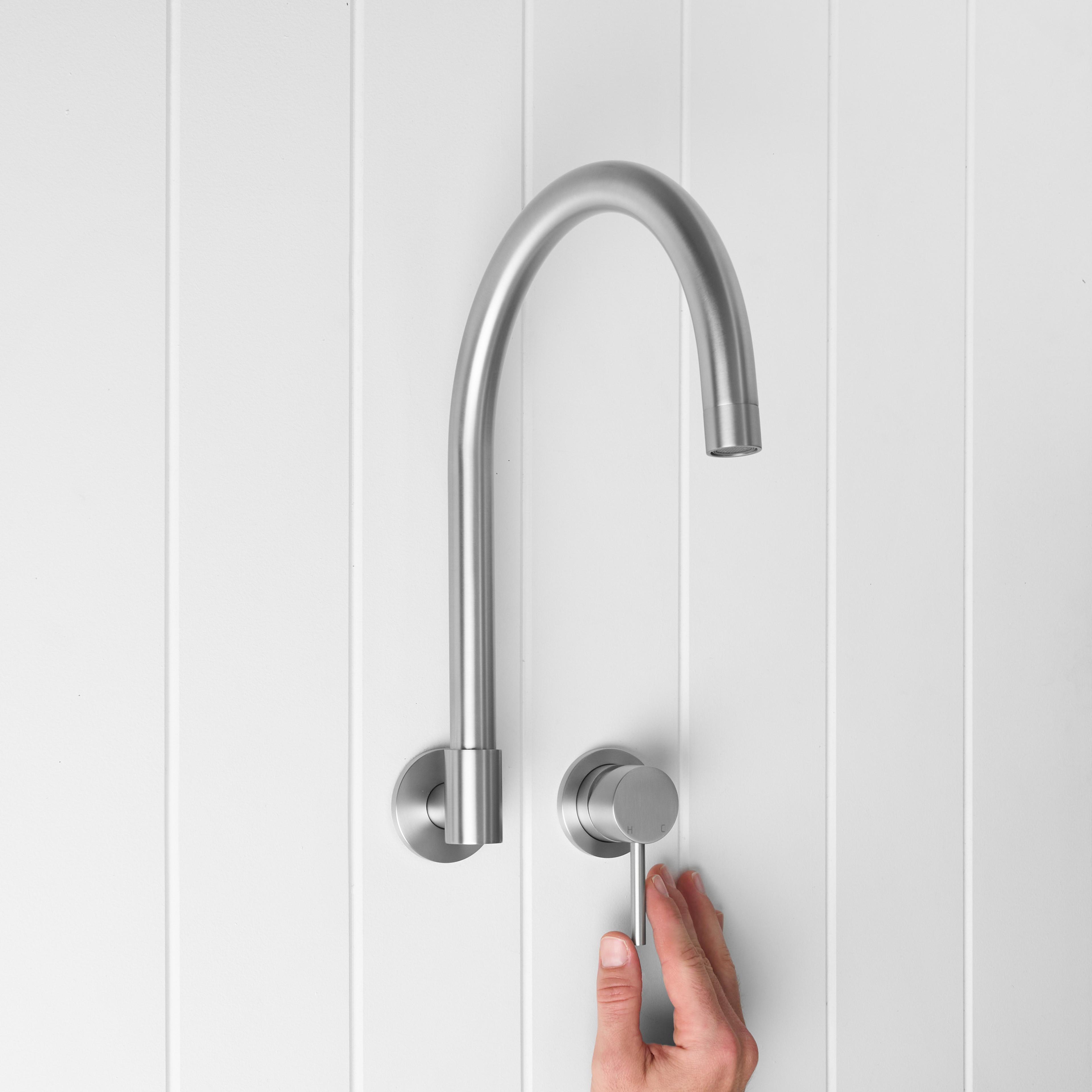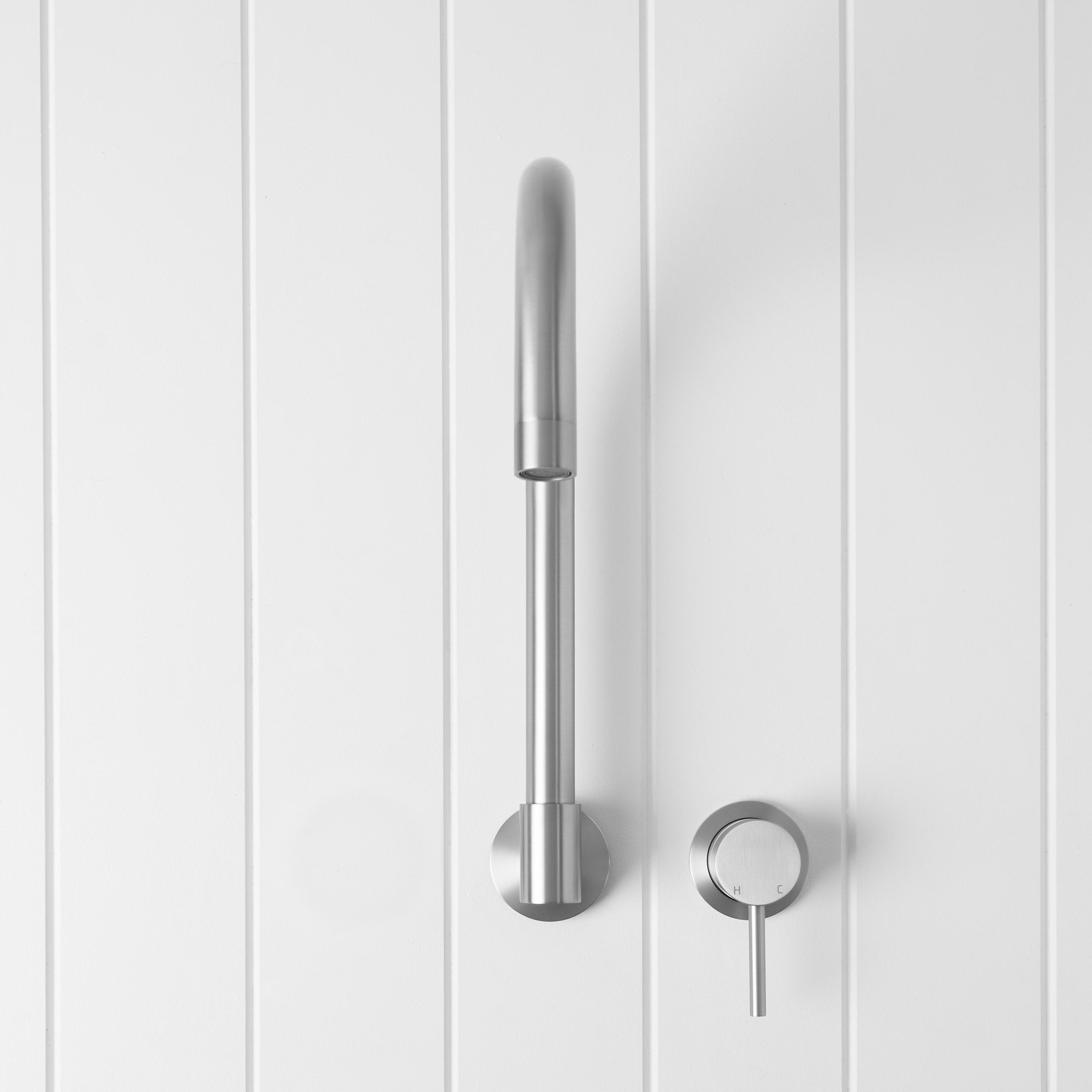 The Sydney Swivel Spout + Wall Mixer Stainless Steel combines a soft gooseneck profile with practical flexibility, offering a refined solution for compact spaces. Wall-mounted and designed to swivel up to 180 degrees, it allows you to adjust the direction of the water flow to suit your setup.