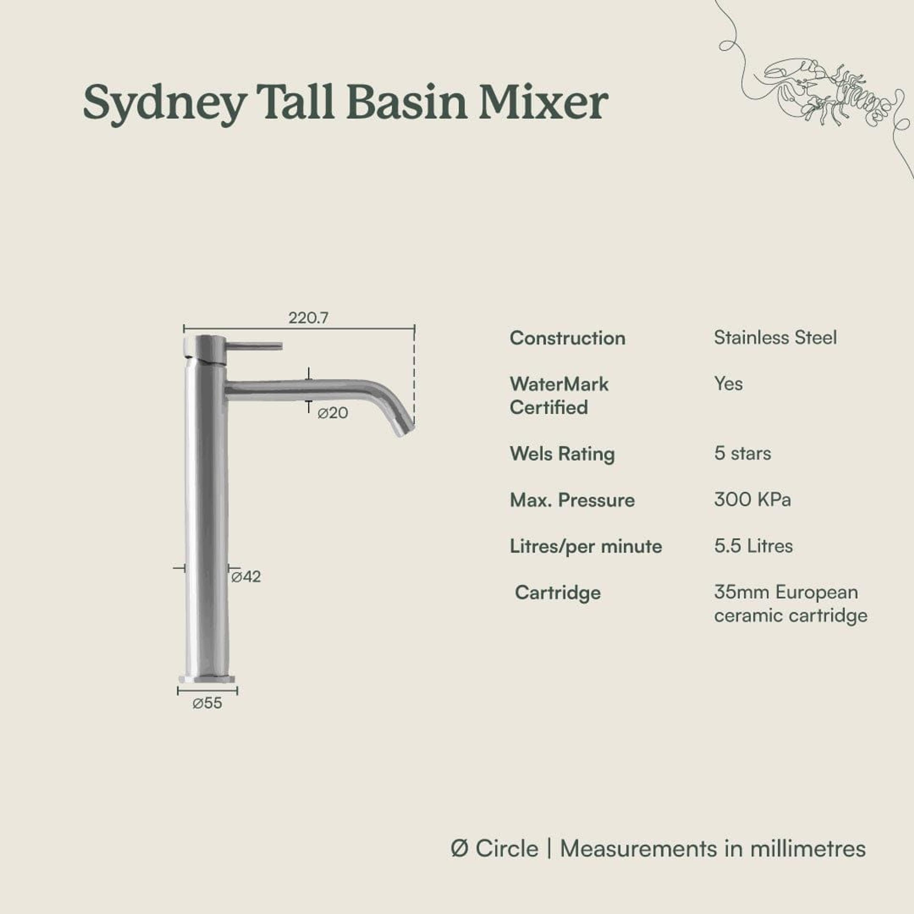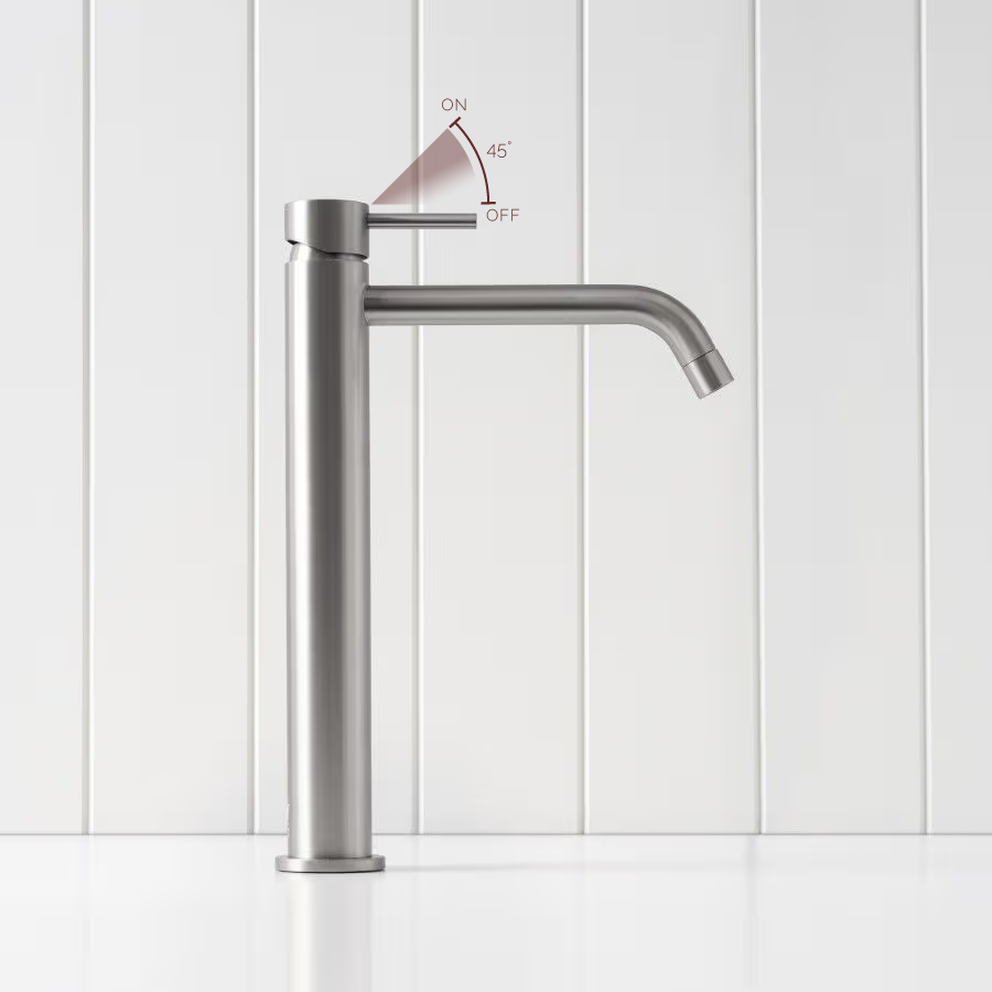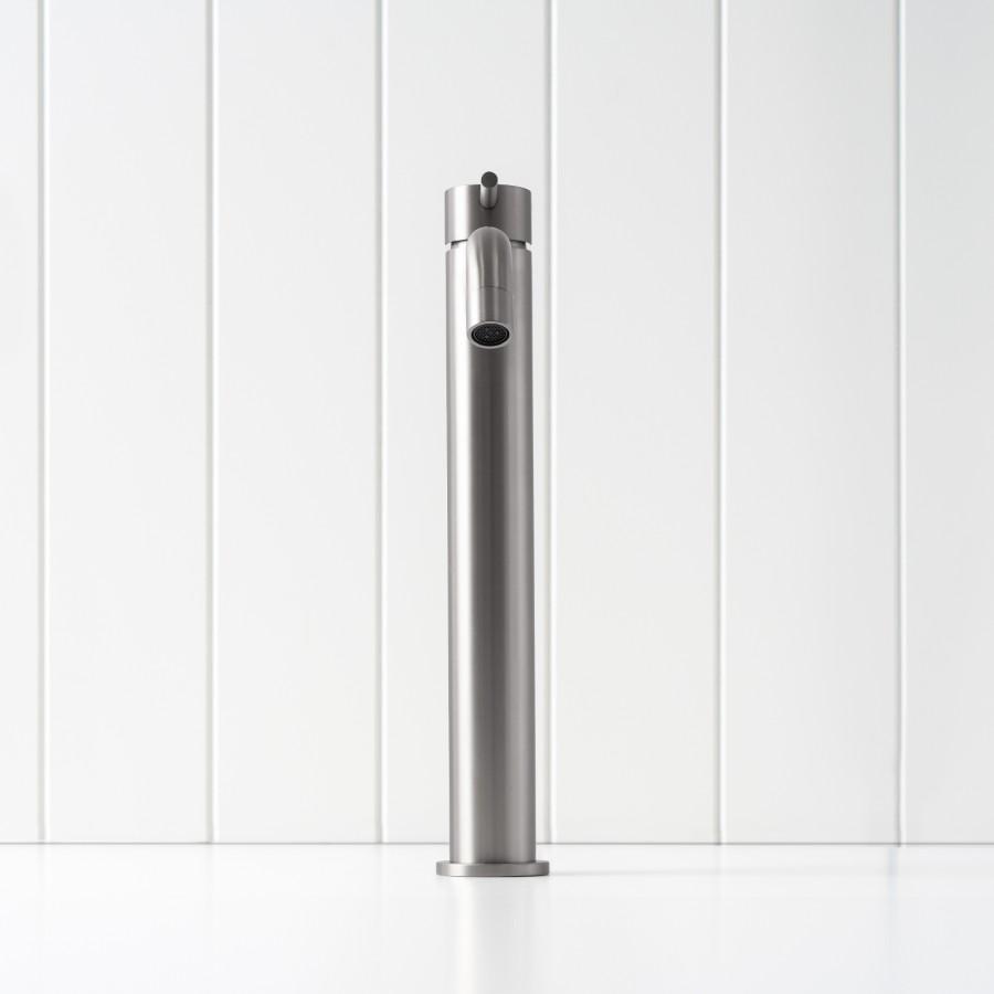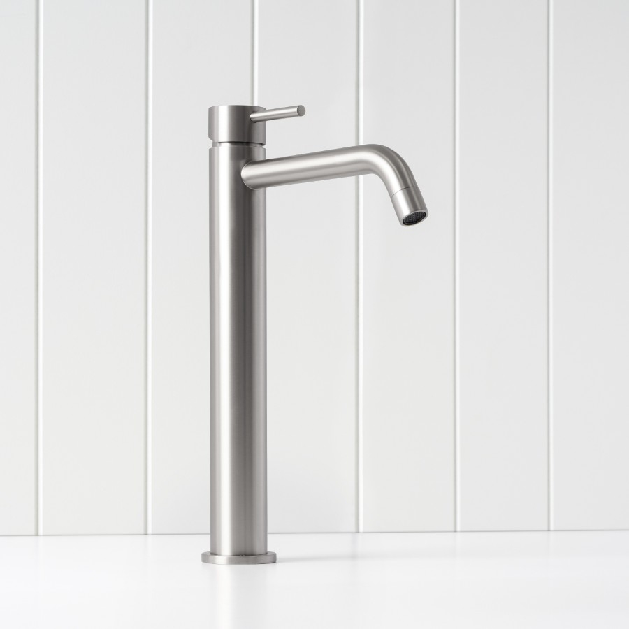 The Sydney Tall Basin Mixer in Stainless Steel keeps the bathroom feeling calm and understated. This tall basin mixer offers the extra height needed for above counter basins while maintaining a slim, simple profile. The brushed Stainless Steel finish works with most basin colours, tiles and mirrors.