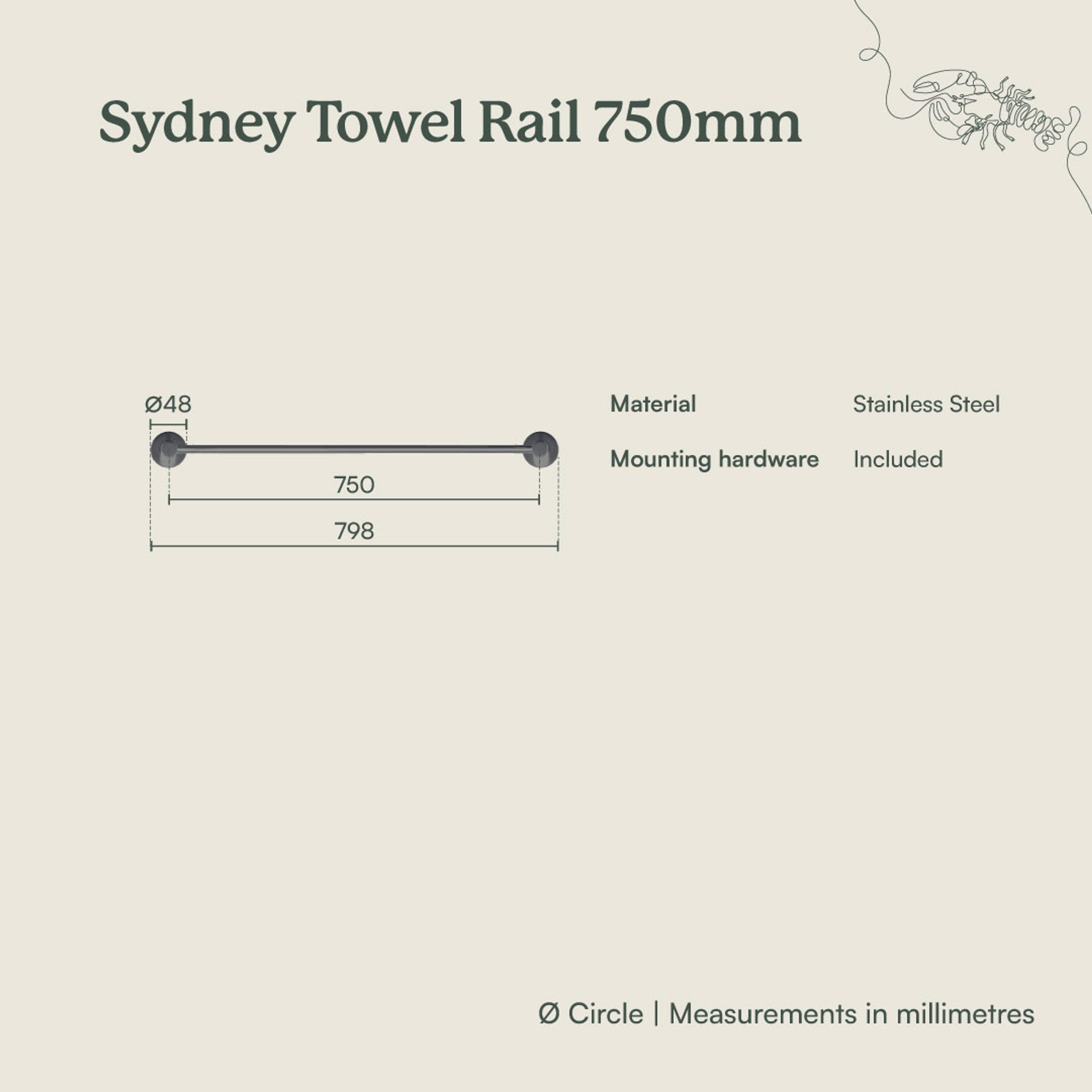 The Sydney Single Towel Rail 750mm is a clean and simple addition to any bathroom. Its generous length provides plenty of space for a full-sized towel to hang comfortably and dry properly after use.