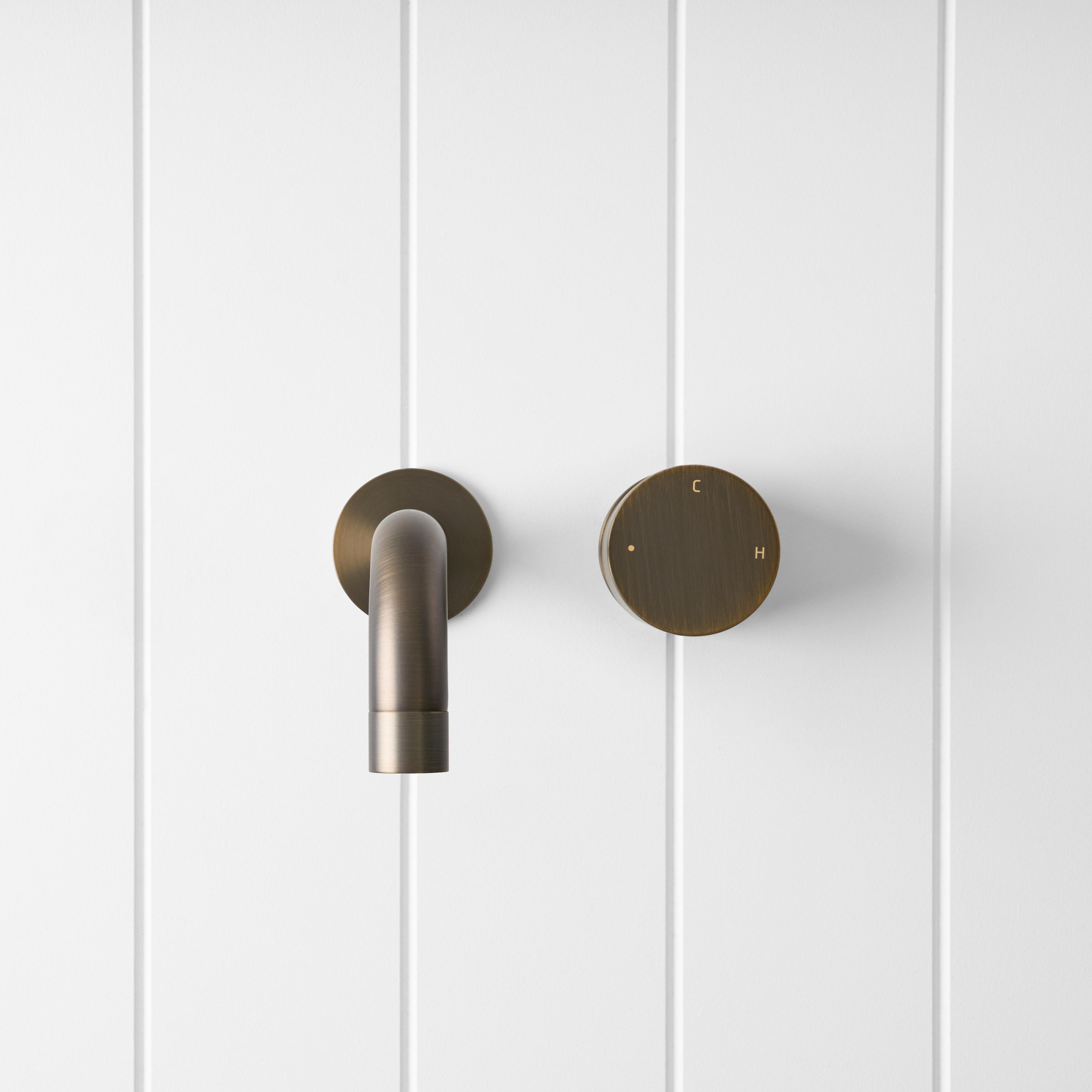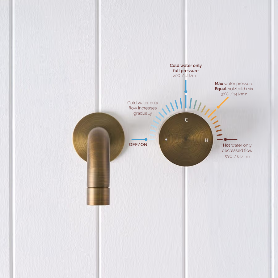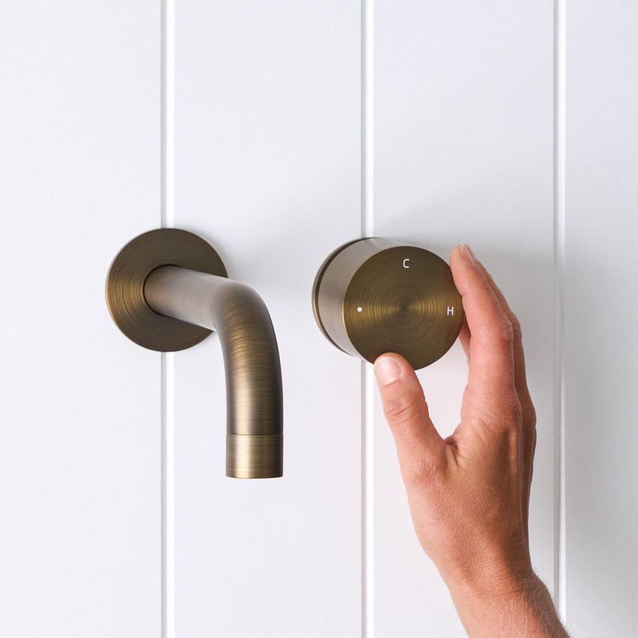 The Sydney Wall Spout and Progressive Mixer in Antique Brass brings a warm, sculptural touch to the basin or bath. The curved wall spout and single progressive mixer in Antique Brass over stainless steel keep the wall calm while you dial from cold to warm in one smooth turn. It is a design forward bathroom tapware set that feels considered every day.