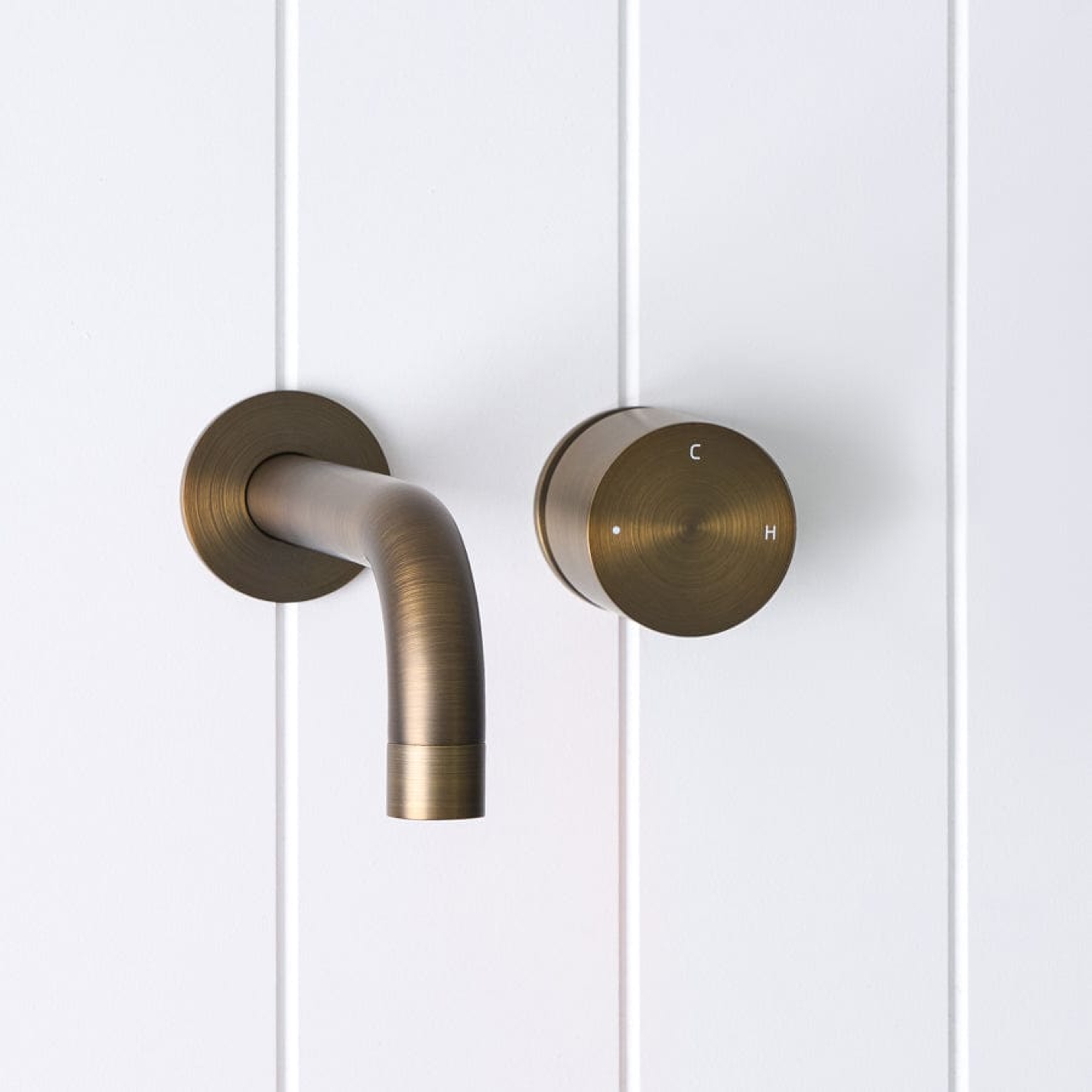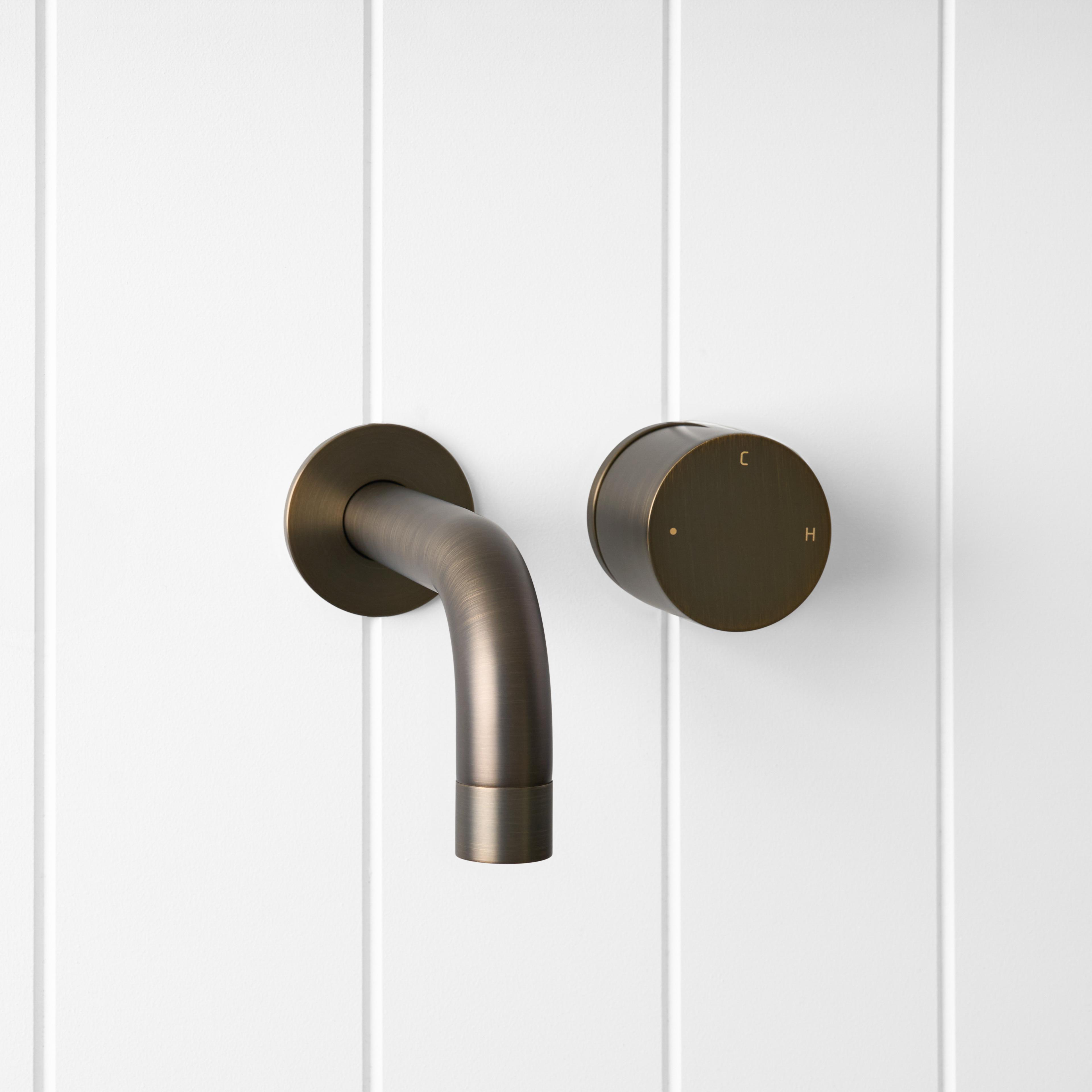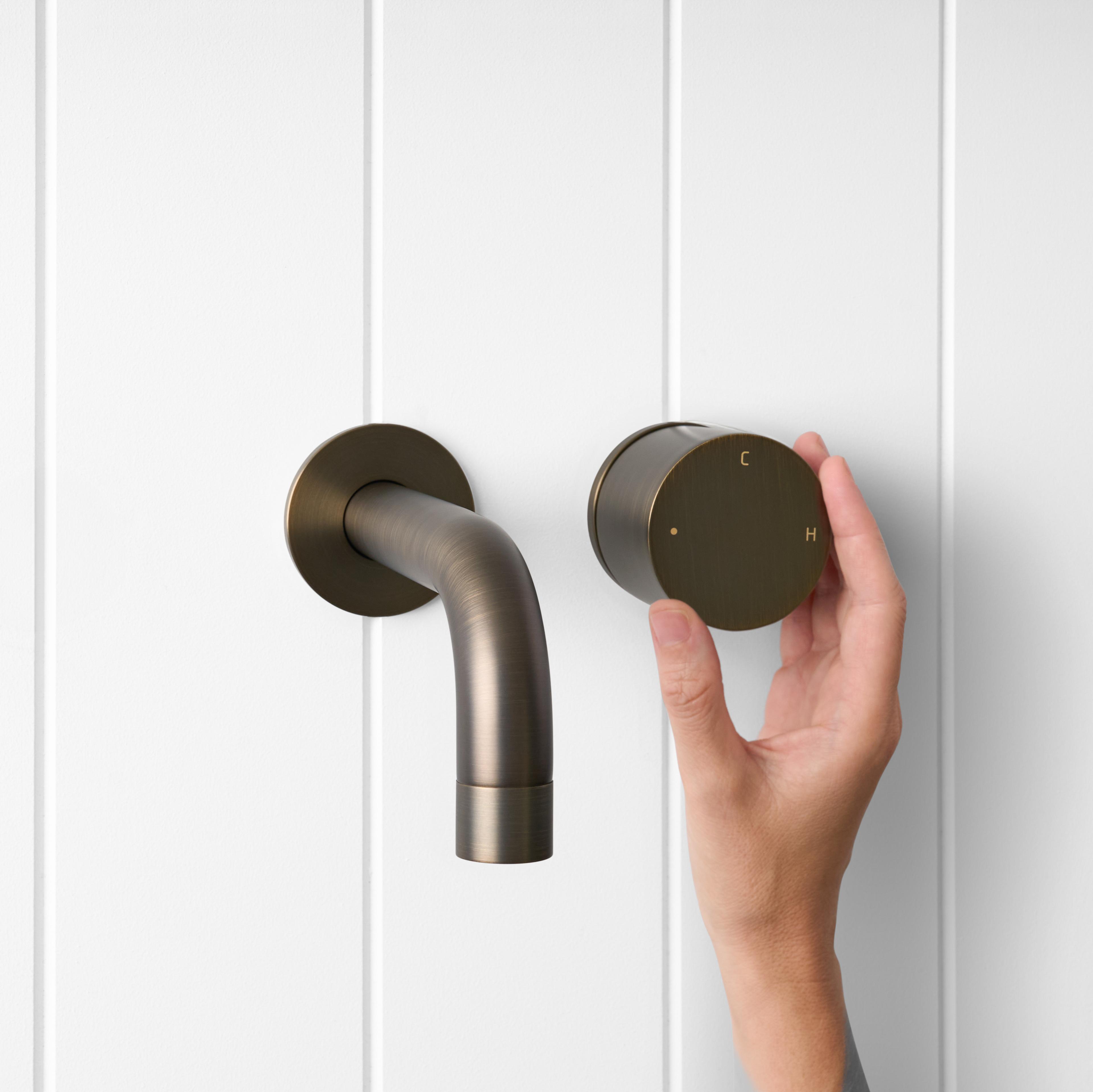 The Sydney Wall Spout and Progressive Mixer in Antique Brass brings a warm, sculptural touch to the basin or bath. The curved wall spout and single progressive mixer in Antique Brass over stainless steel keep the wall calm while you dial from cold to warm in one smooth turn. It is a design forward bathroom tapware set that feels considered every day.