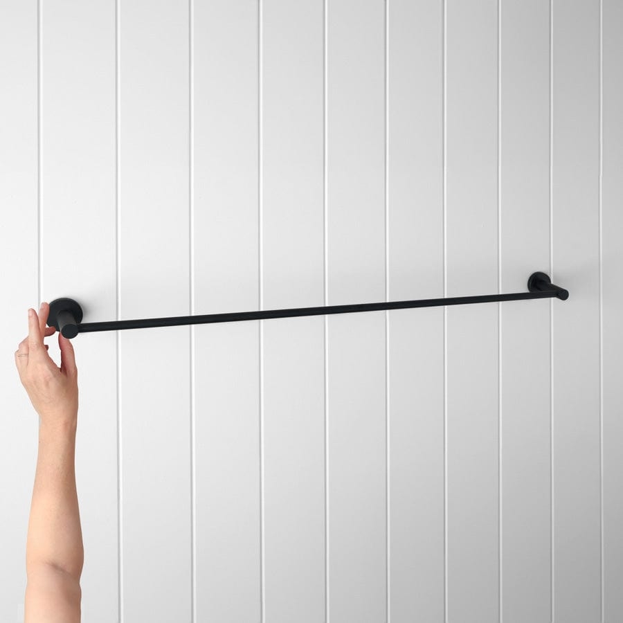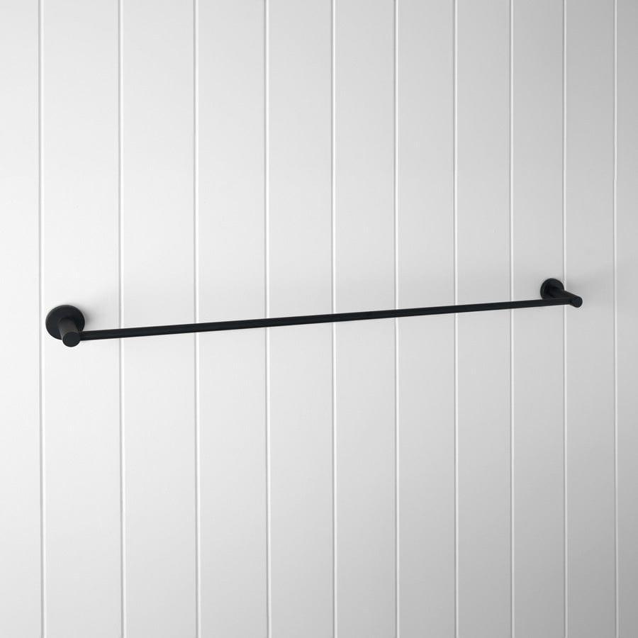 The Sydney Towel Rail in Matte Black (750mm) adds bold contrast and a long, fine line to bathroom walls. This stainless steel towel rail in Matte Black looks sharp against white tiles and stone, while the 750mm length keeps two towels neatly in place. It is a simple way to finish a black tapware scheme.