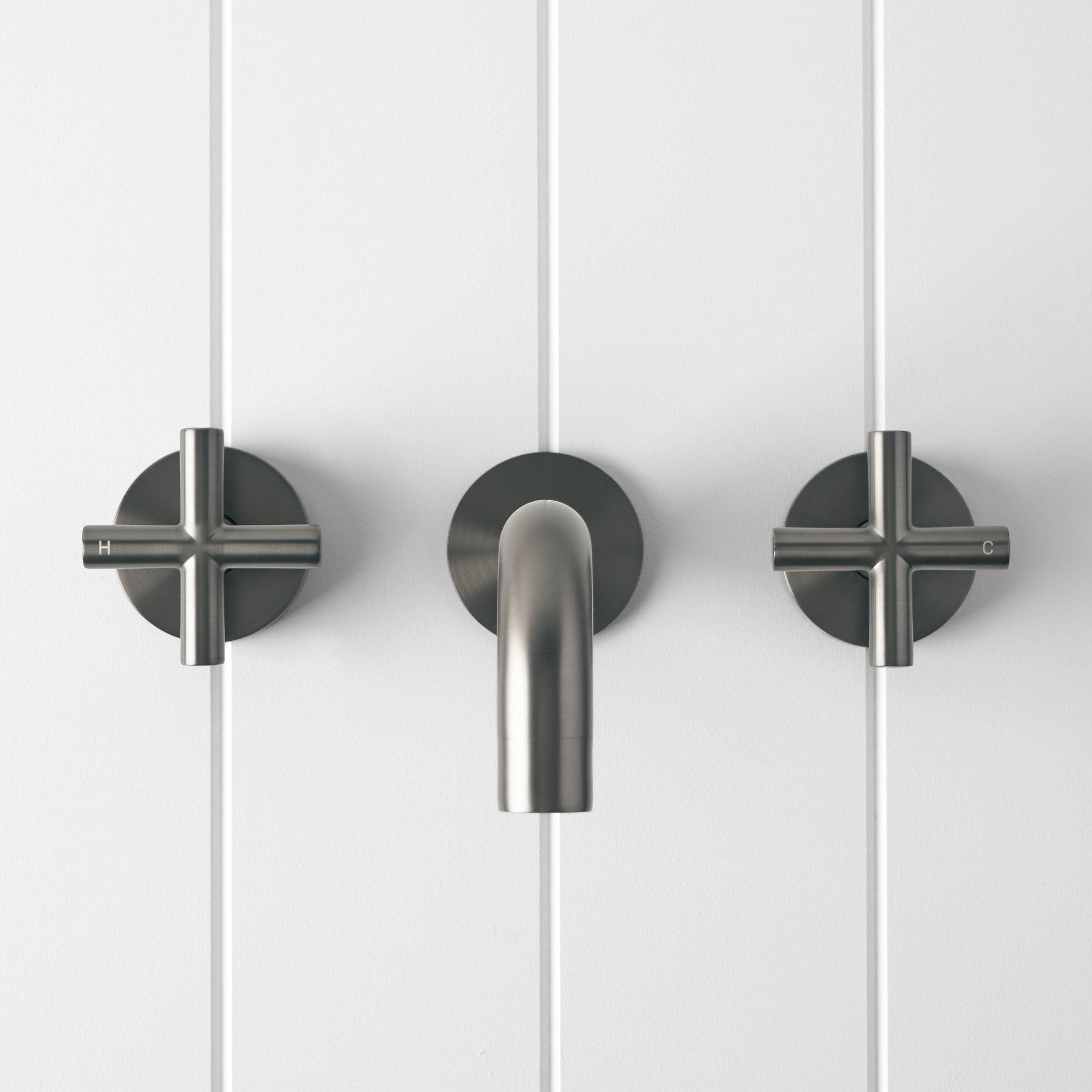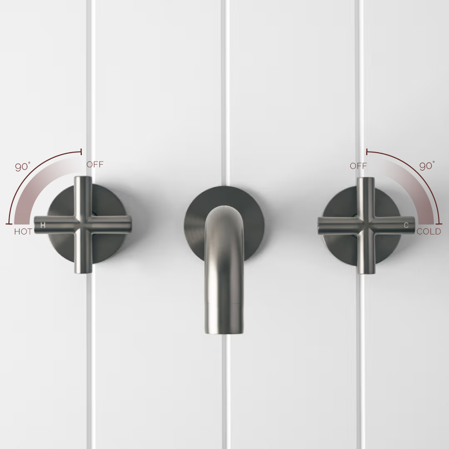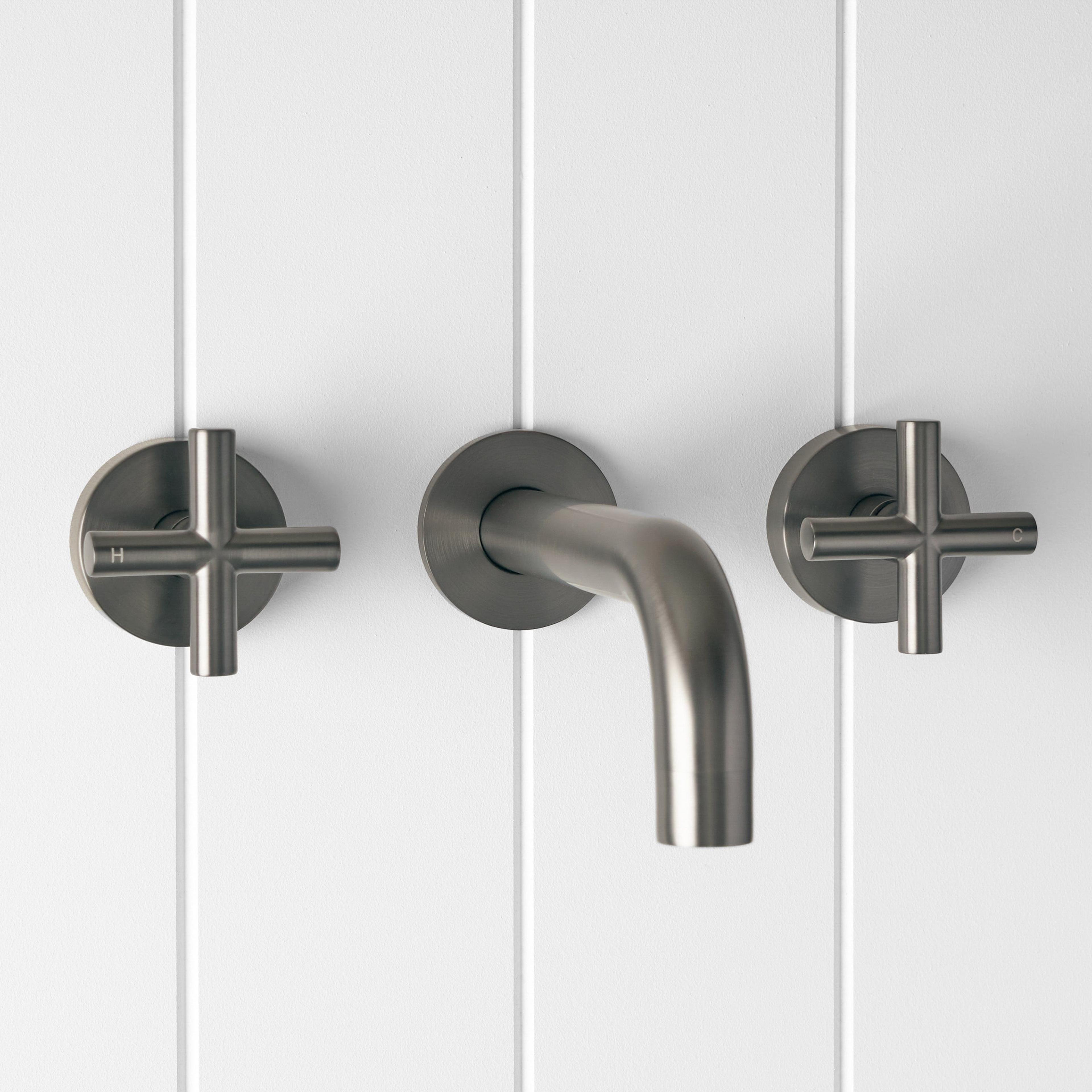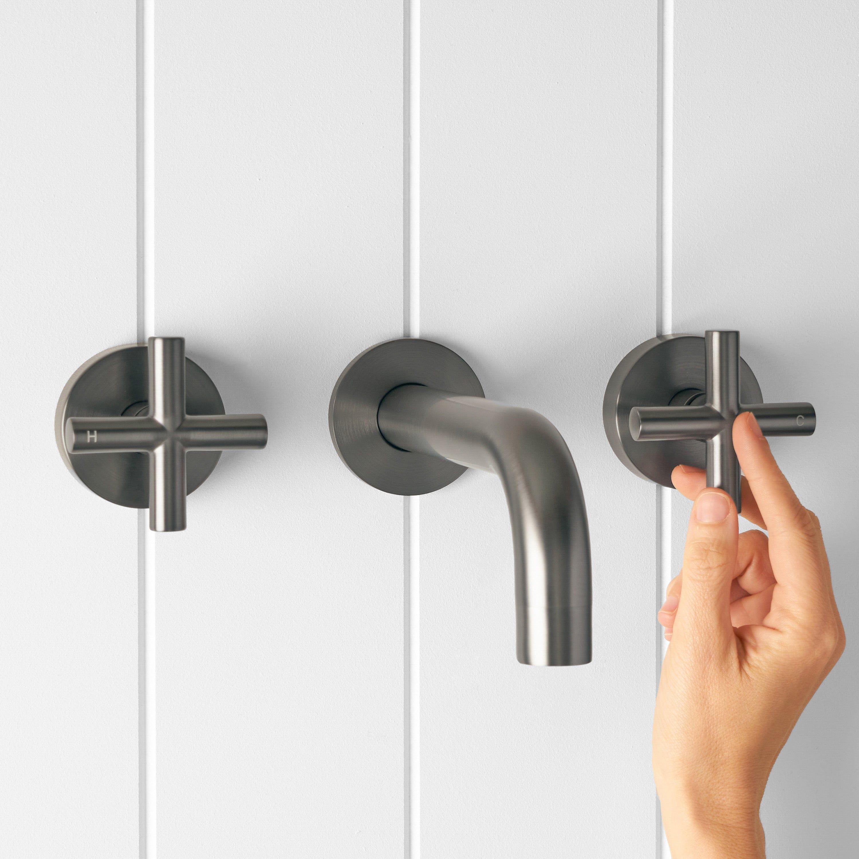 The Sydney Wall Spout and Cross Taps in Gunmetal introduce a rich, charcoal metal tone that anchors contemporary vanities. A stainless steel core with gunmetal finish offers durability and a refined, low sheen surface. This wall spout and tap set is ideal for modern bathrooms with layered textures and darker tiles.