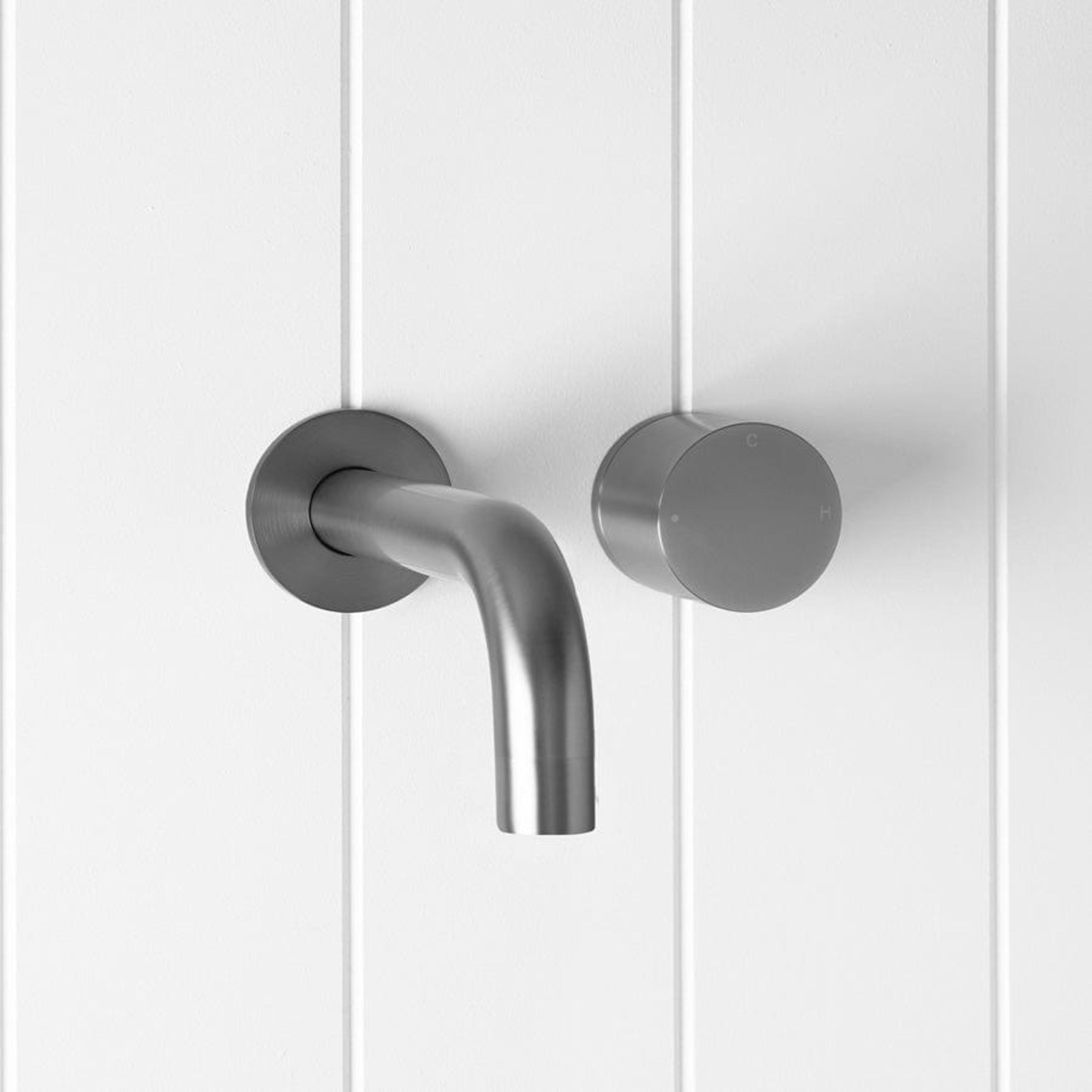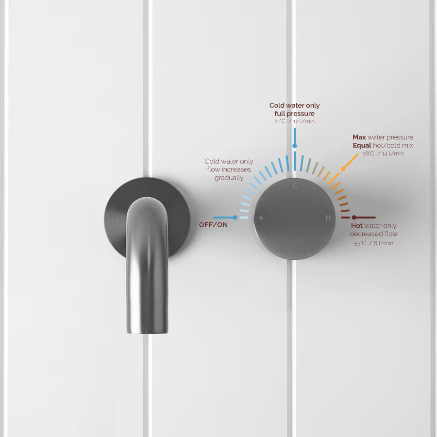 The Sydney Wall Spout and Progressive Mixer in Gunmetal brings a grounded, contemporary edge to the bathroom. The deep Gunmetal finish over stainless steel contrasts gently with pale tiles, while the circular mixer and curved wall spout keep the design balanced. One smooth turn gives you more warmth and flow, turning the tap into part of the ritual.