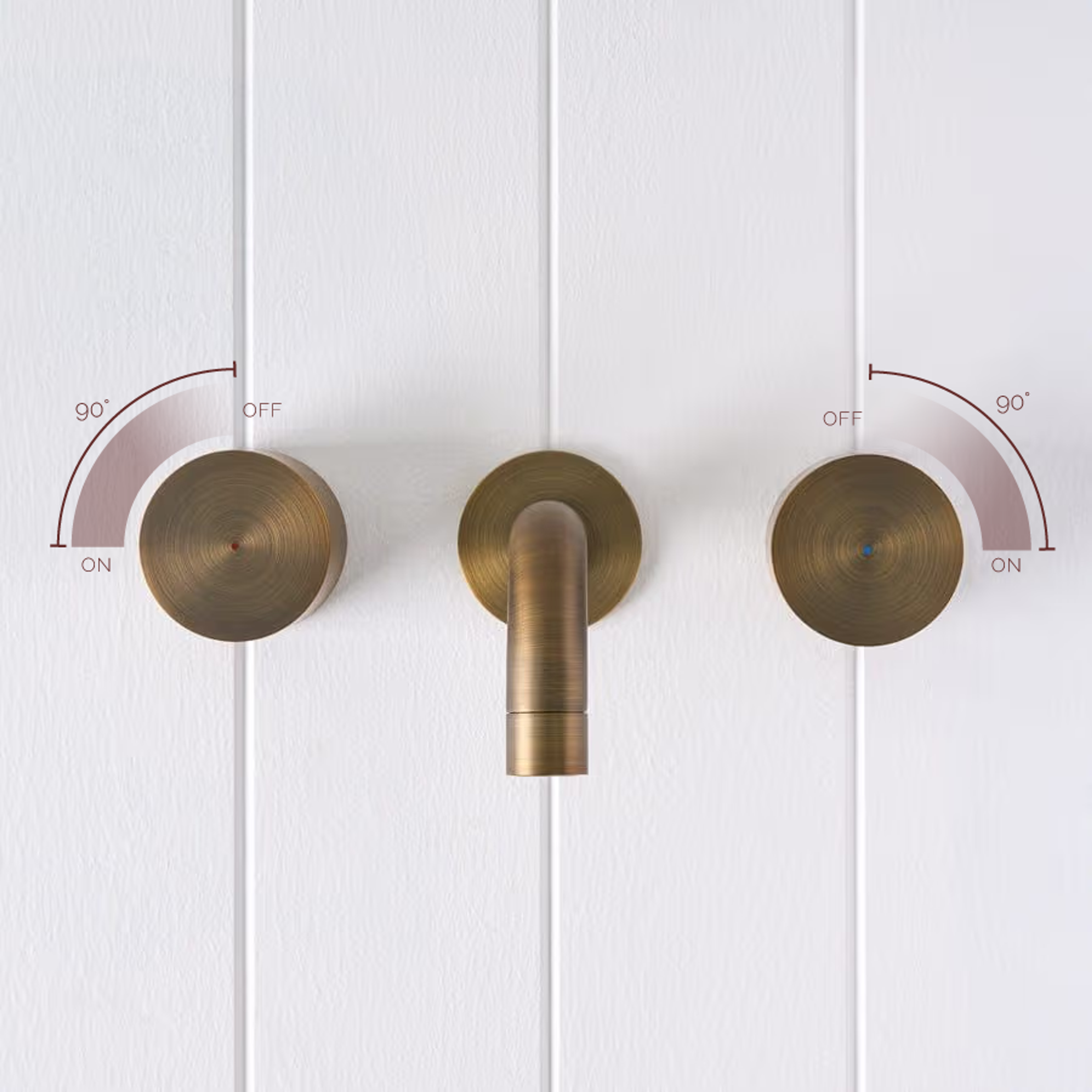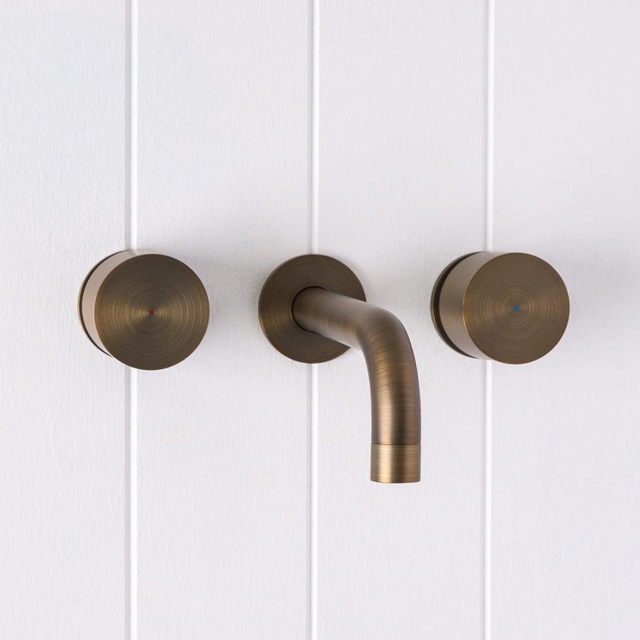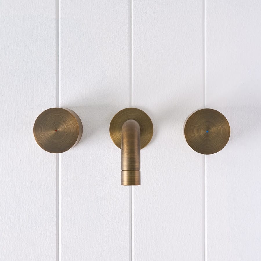 The Sydney Wall Spout and Round Wall Taps in Antique Brass brings warm, rounded forms to the basin or bath. The soft Antique Brass finish over stainless steel sits beautifully against stone and textured tiles. With separate hot and cold taps framing the curved spout, this set turns everyday washing into a small ritual.