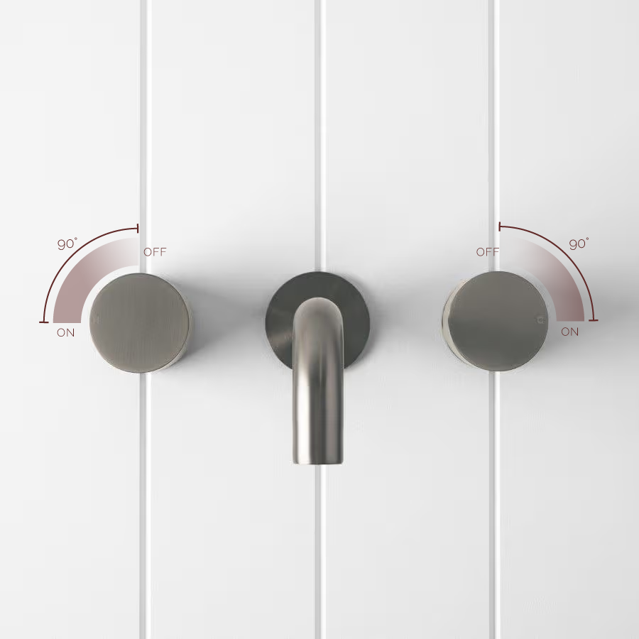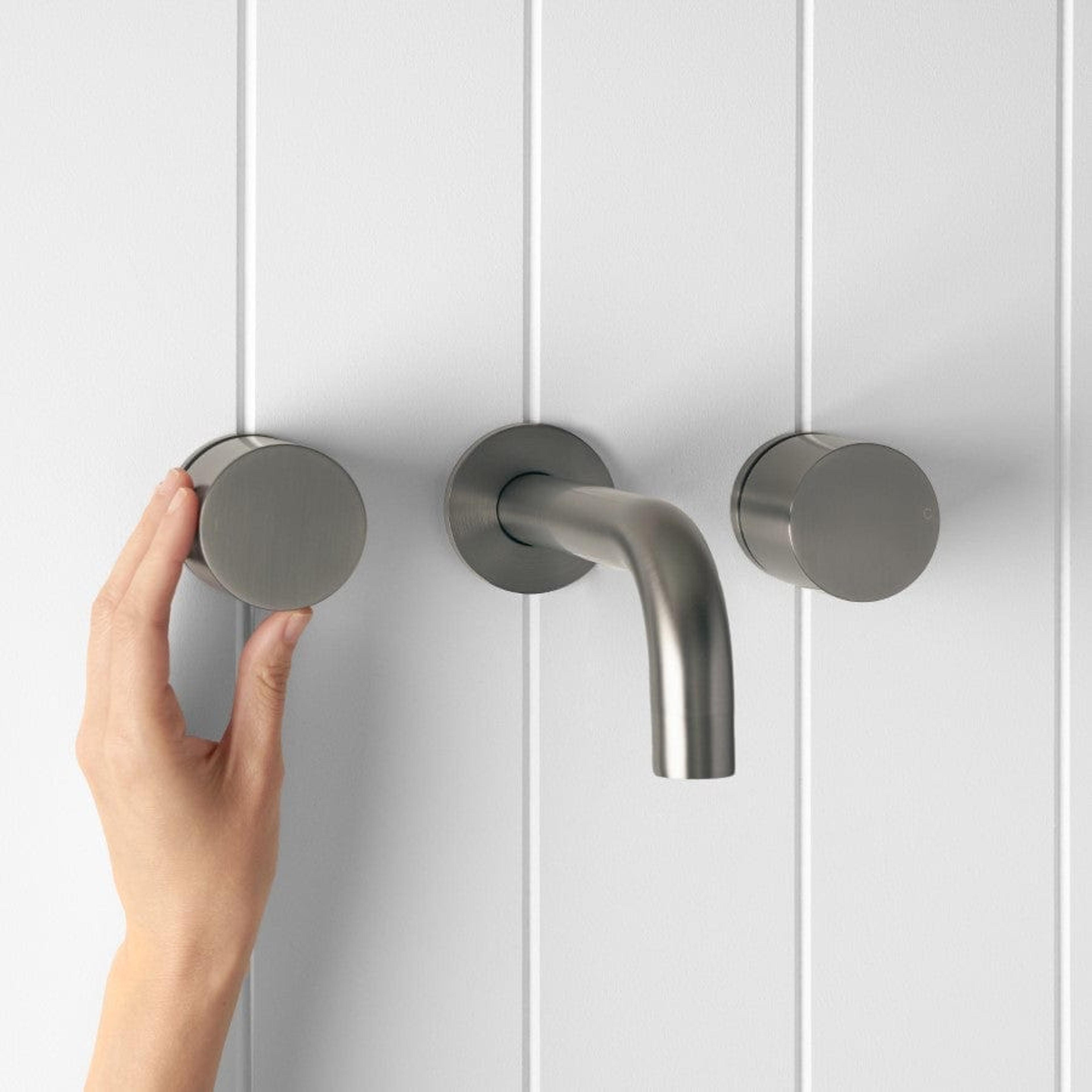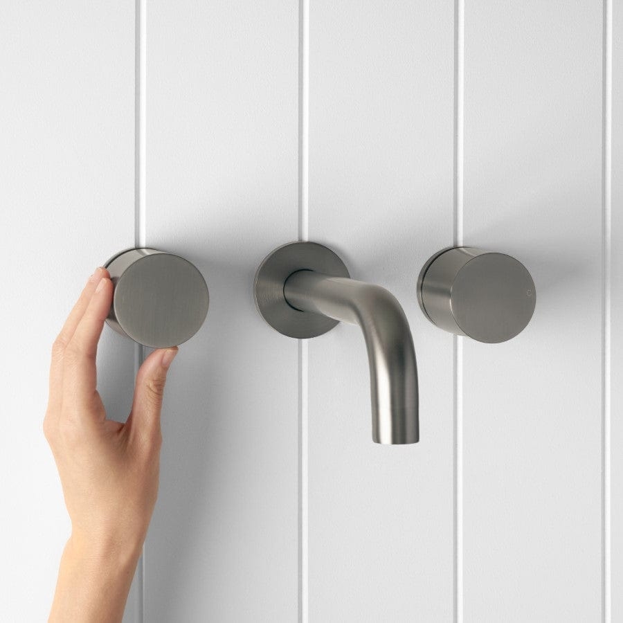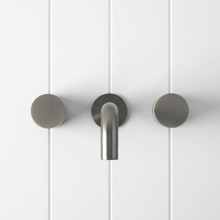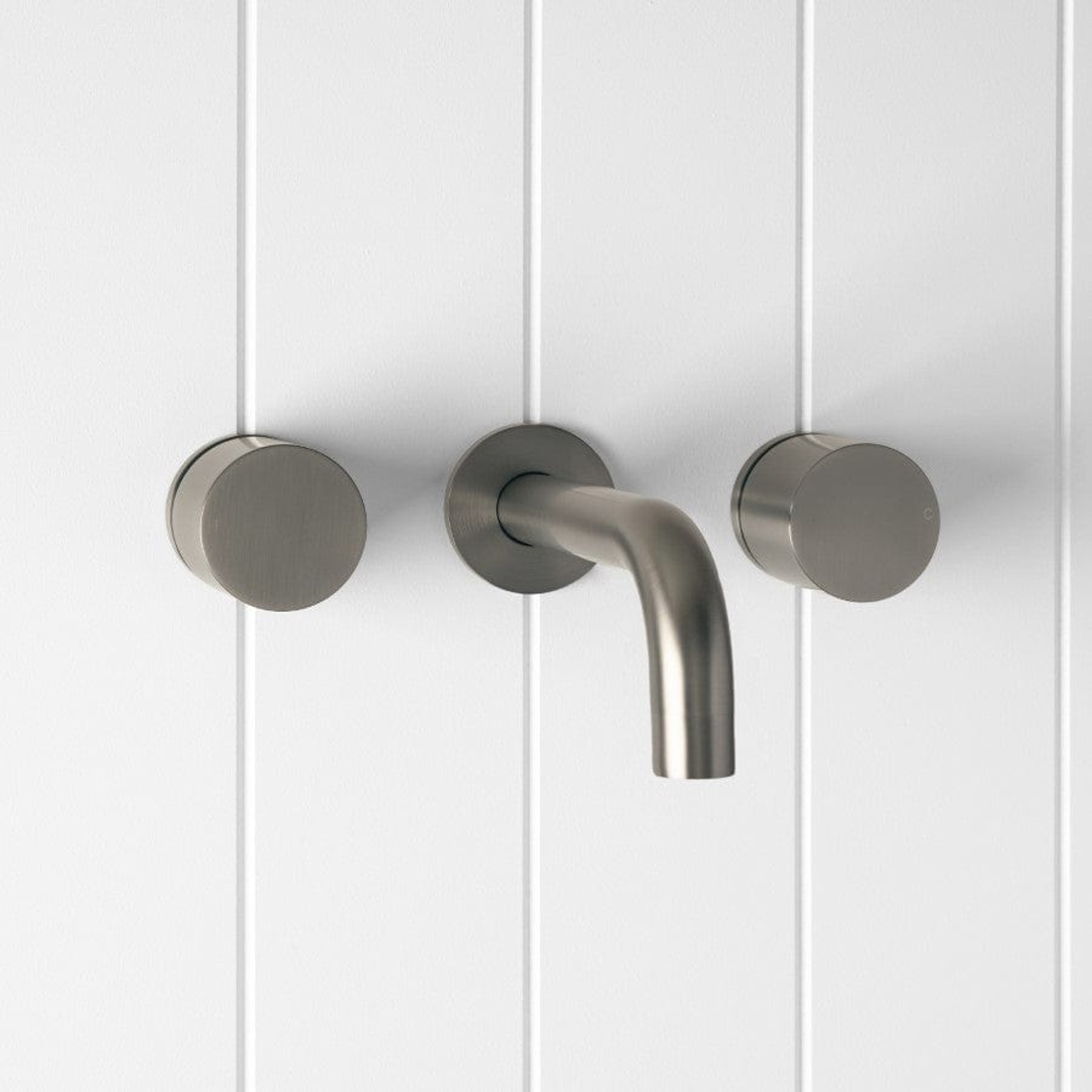 The Sydney Wall Spout and Round Wall Taps in Gunmetal brings a grounded, contemporary note to the bathroom. The deep Gunmetal finish over stainless steel contrasts gently with pale tiles and stone, and the circular forms keep the wall feeling balanced. This set anchors a modern basin or bath without overpowering the room.
