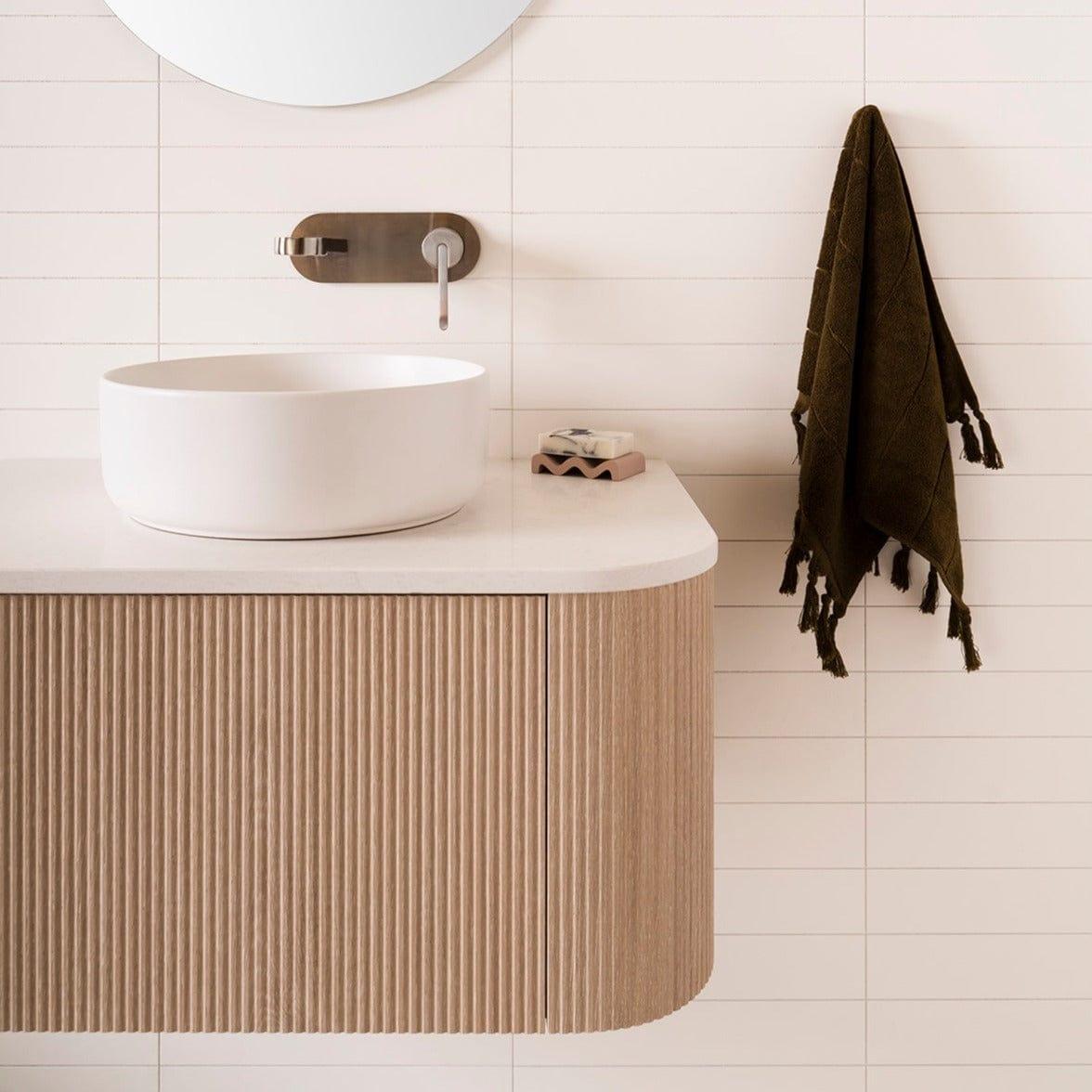The Waverley Wall Hung Vanity 900 in Coastal Oak brings a warm, modern touch to compact bathrooms. Designed and manufactured in Australia by ADP, it features curved edges, V Groove detailing and a 12mm Artic White Durasein stone top. This wall hung bathroom vanity offers generous storage in a slim line profile, keeping ensuites feeling open and calm.